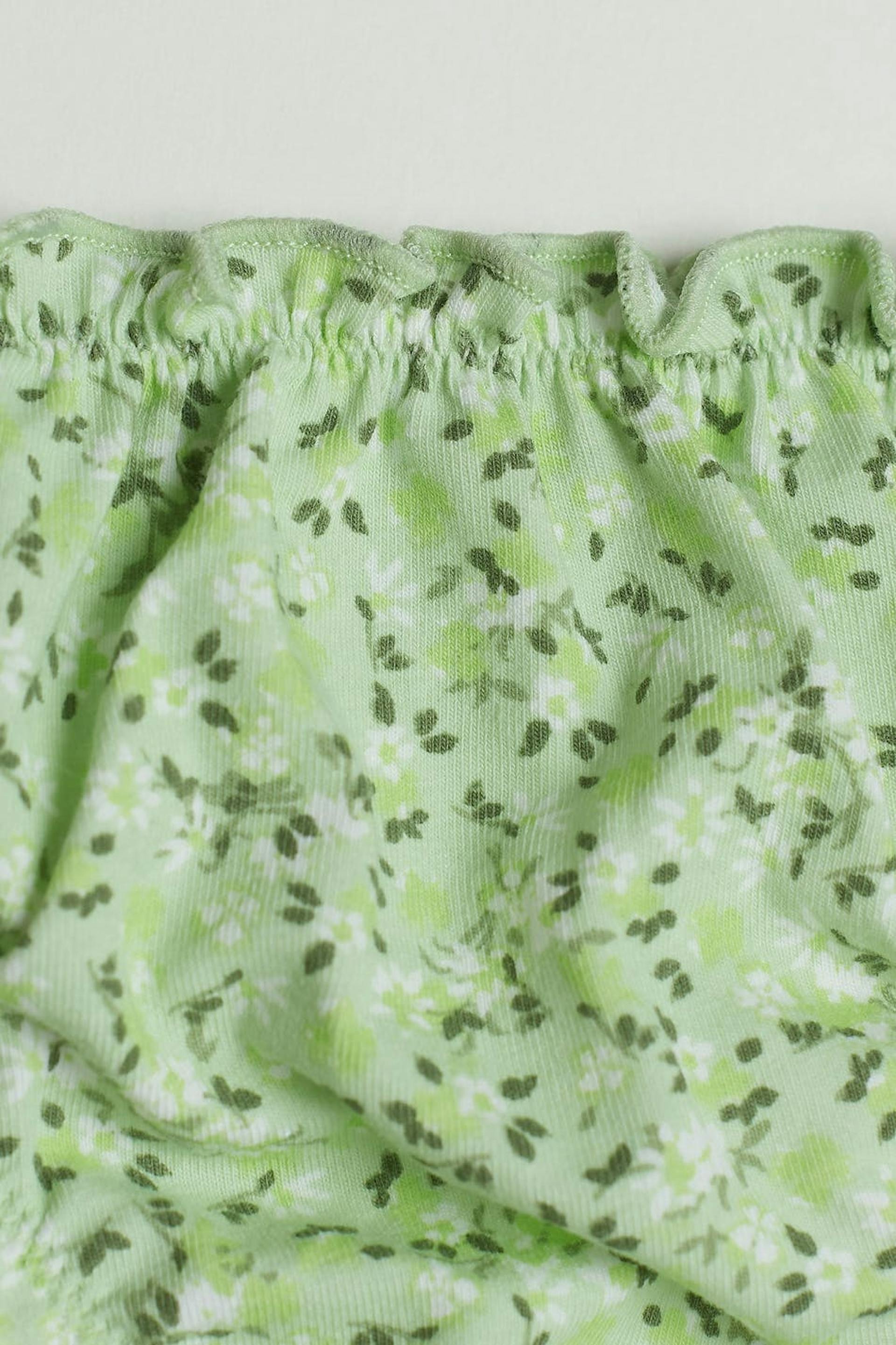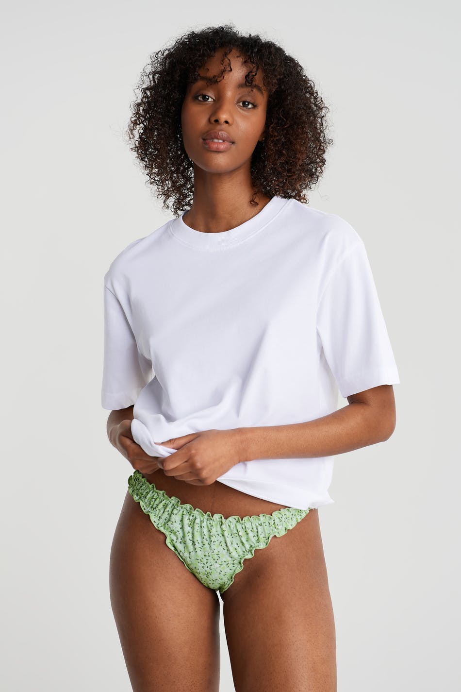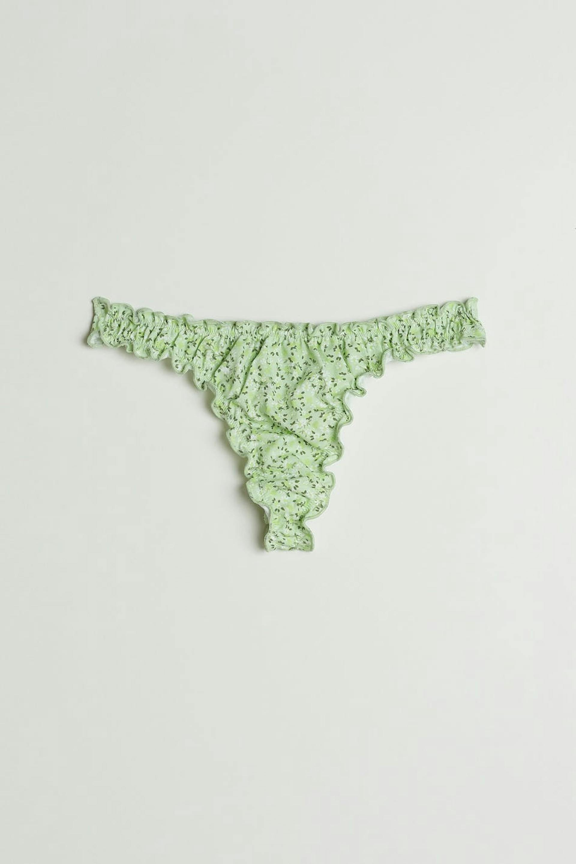 Panties with a frill at the waistband and on the leg openings. The panties are green and have a lining in cotton at the crotch.