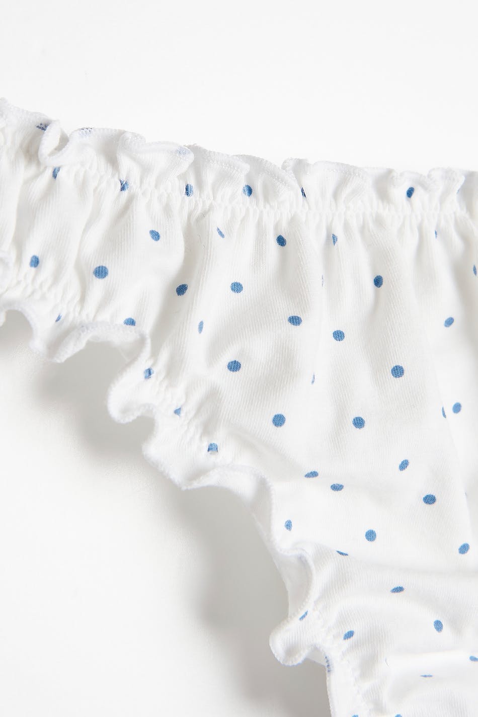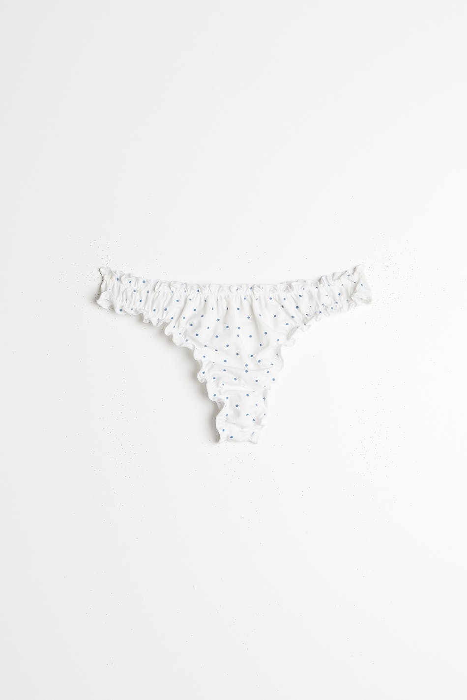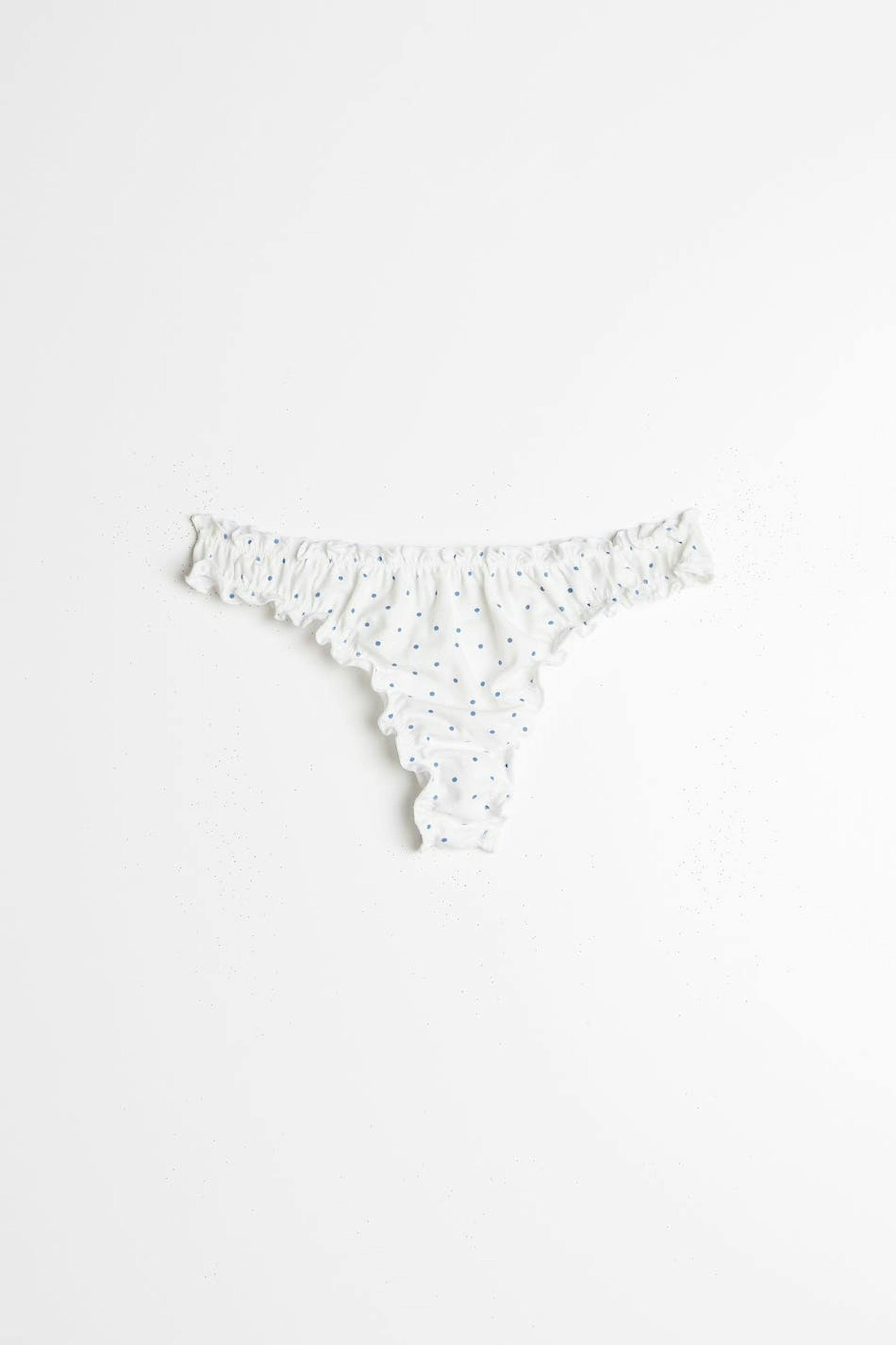 Dotted thongs with ruffled edges. The thongs are white and have a lined crotch in cotton.