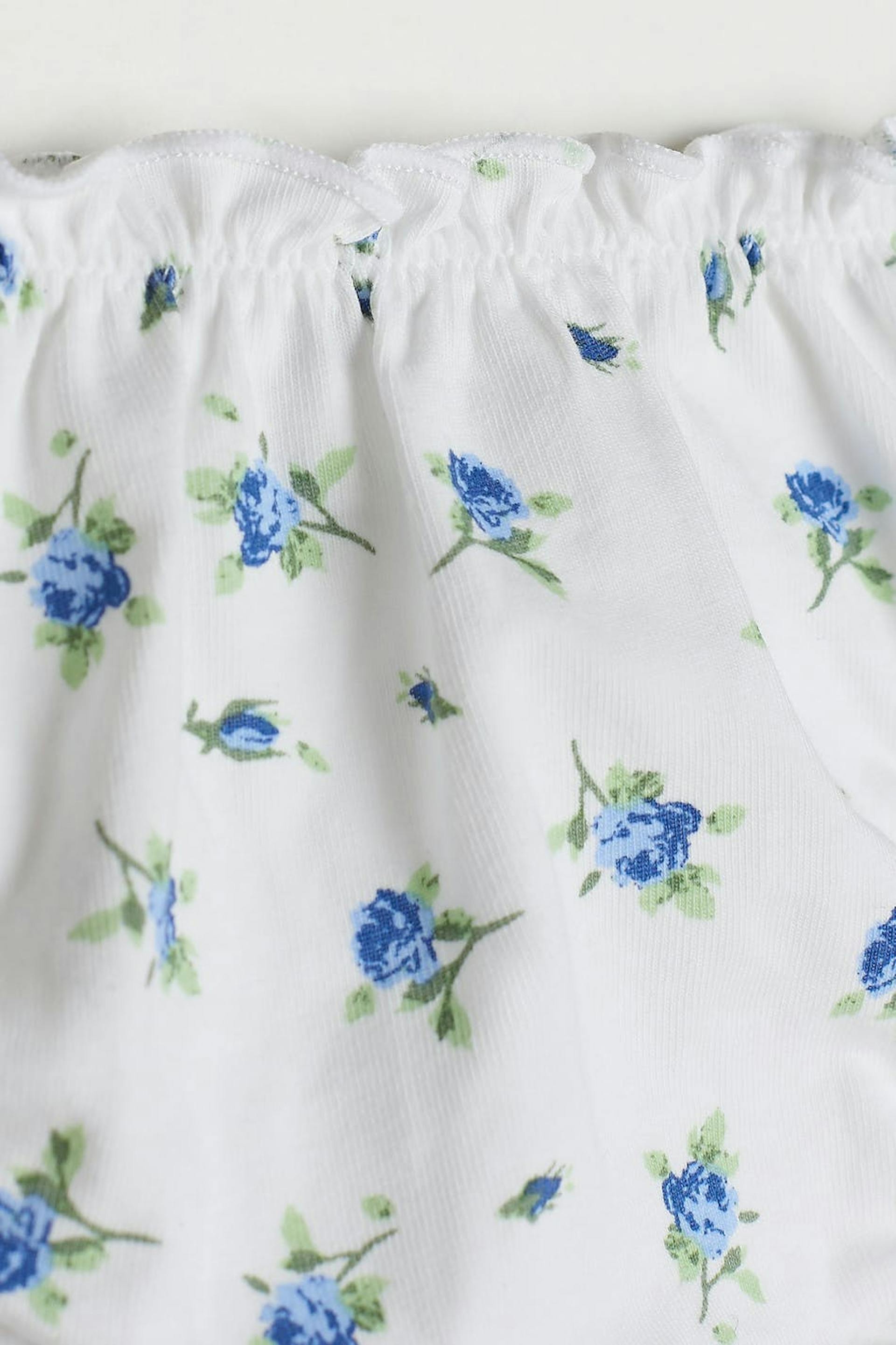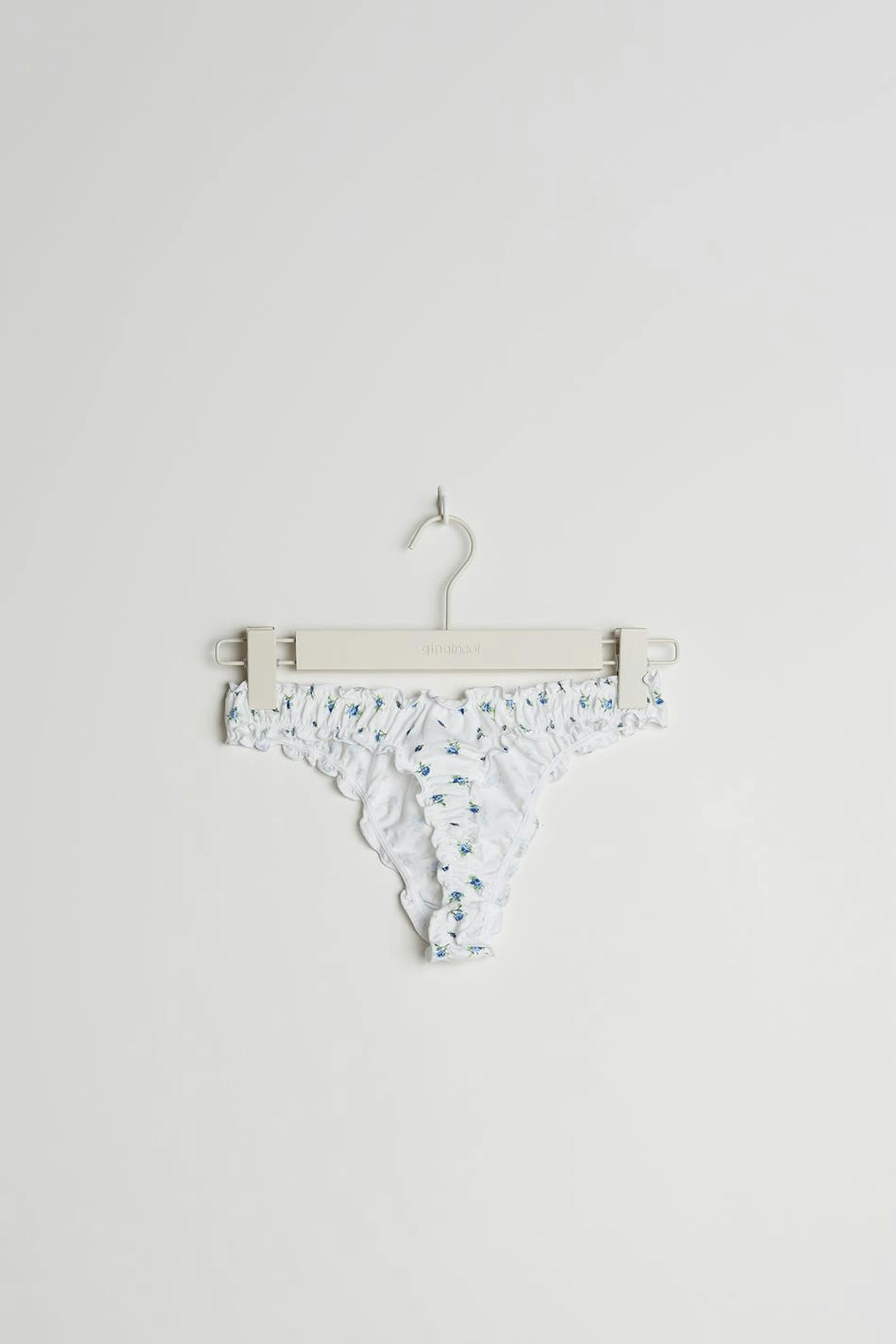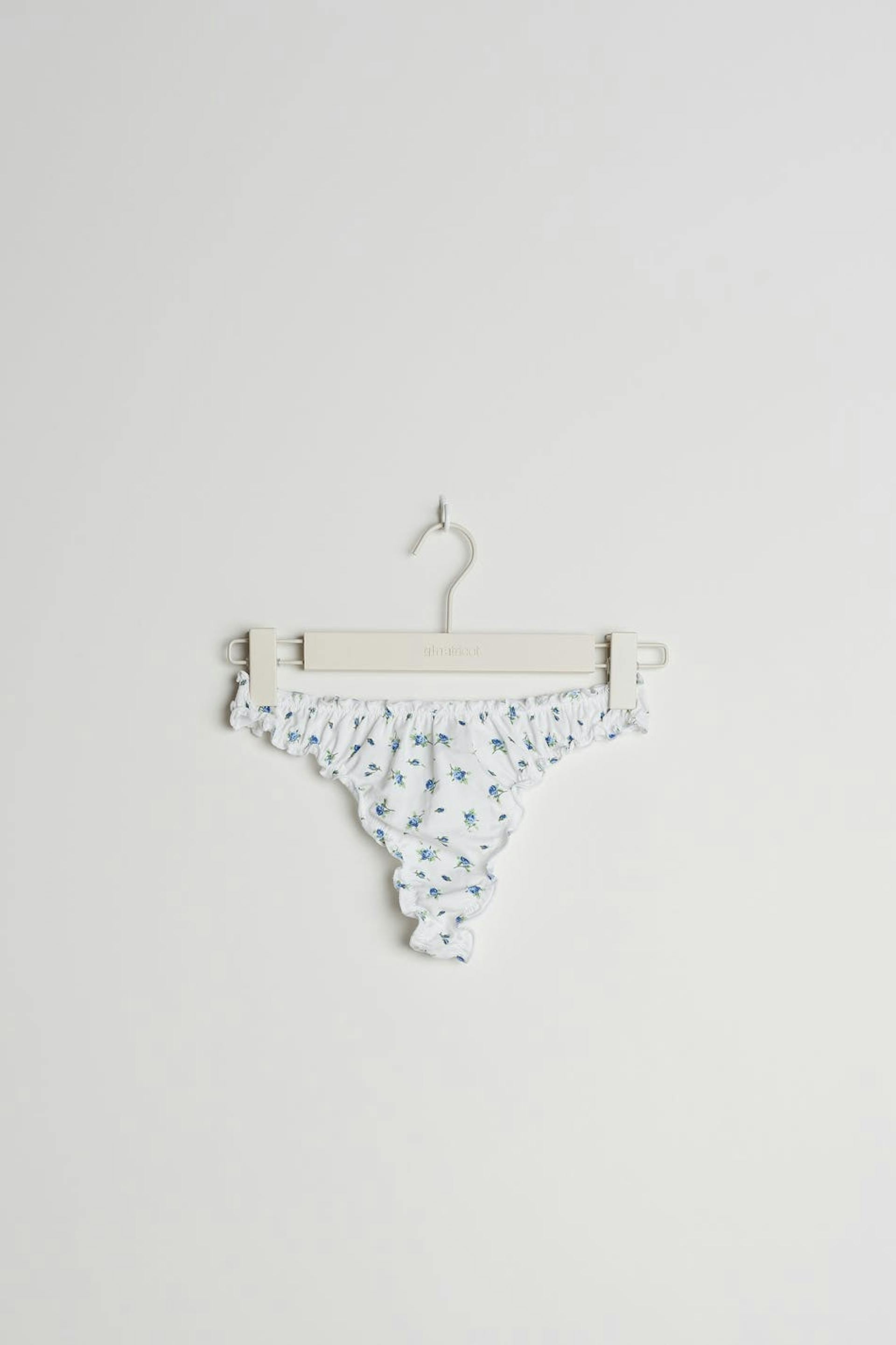 Thongs with blue flowers. The thongs are white and have a frill at the waistband and on the leg openings. They have a lining in cotton at the crotch.