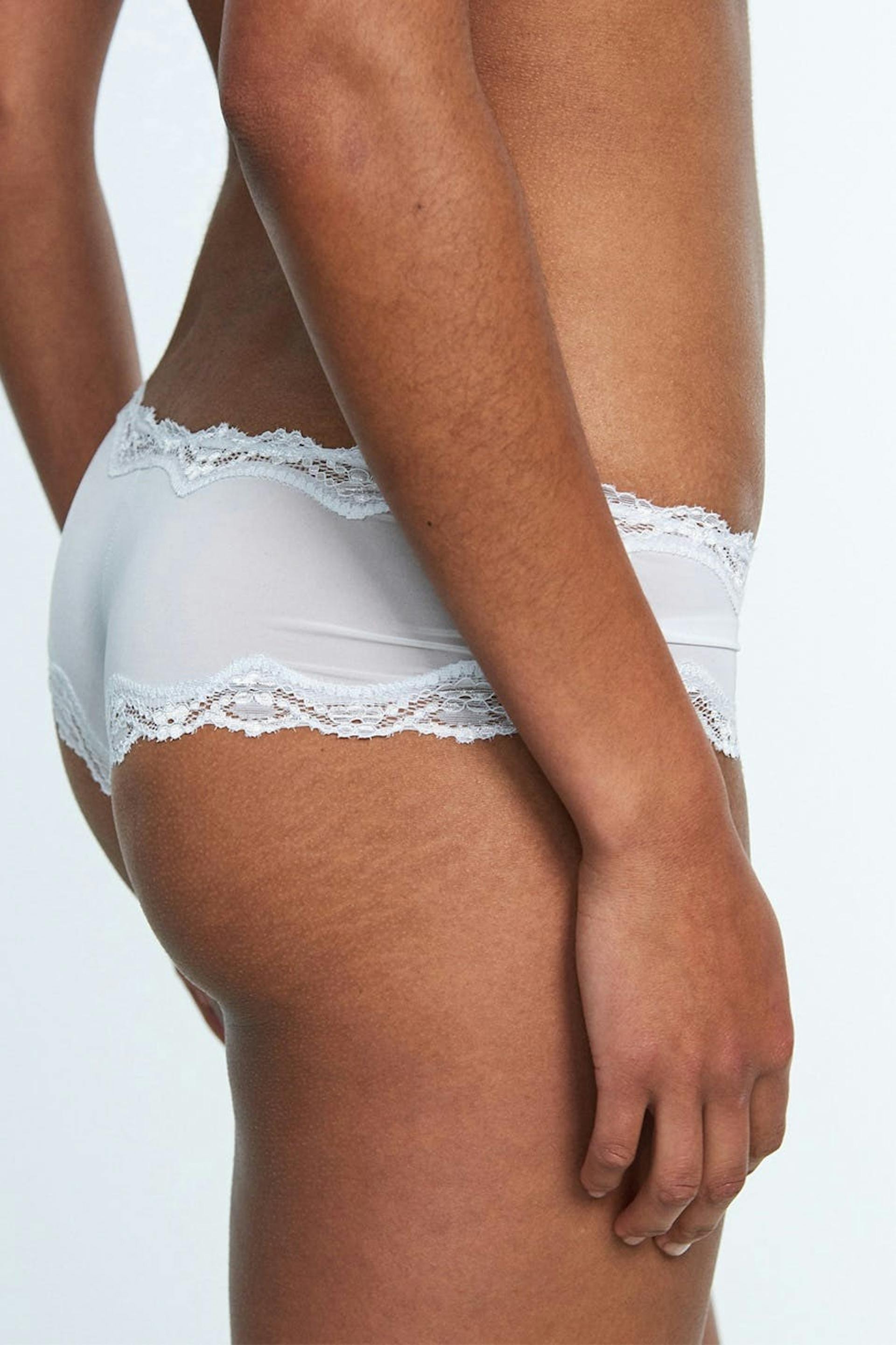 Pantie with a fitted fit. The pantie is white and has edges in lace. It is made of microfiber and has a low waist.
