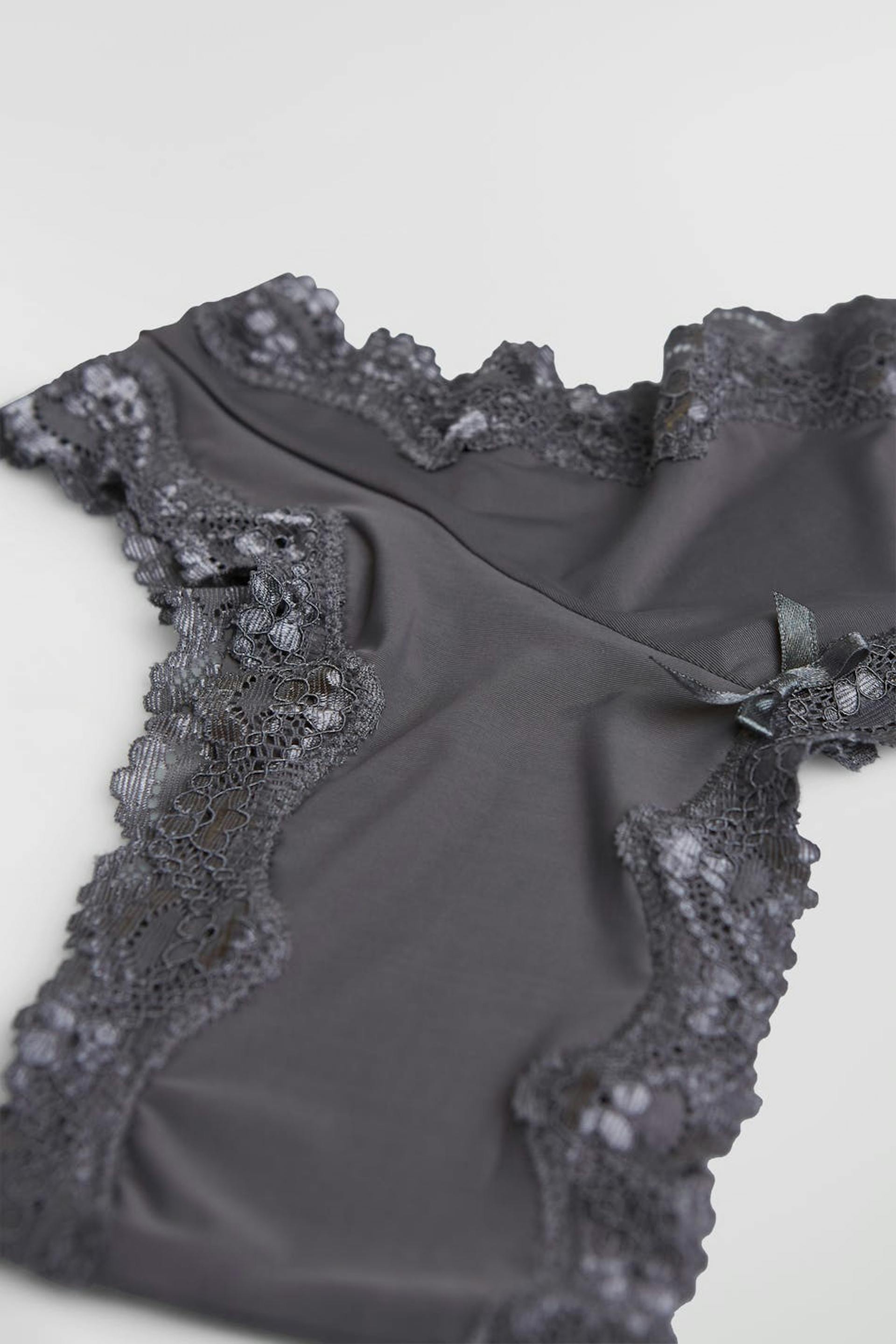Pantie with a fitted fit. The pantie is purple and has edges in lace. It is made of microfiber and has a low waist.