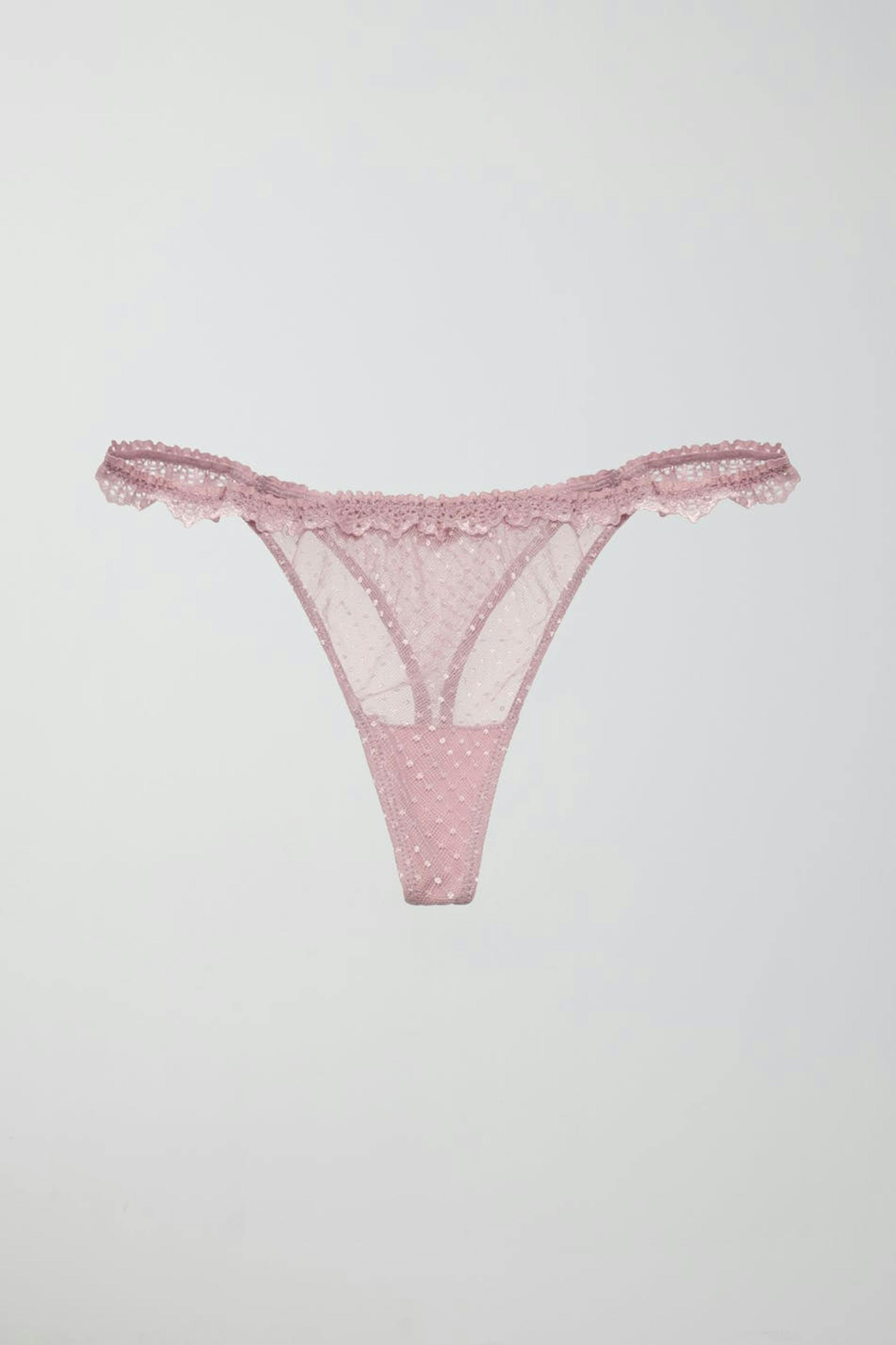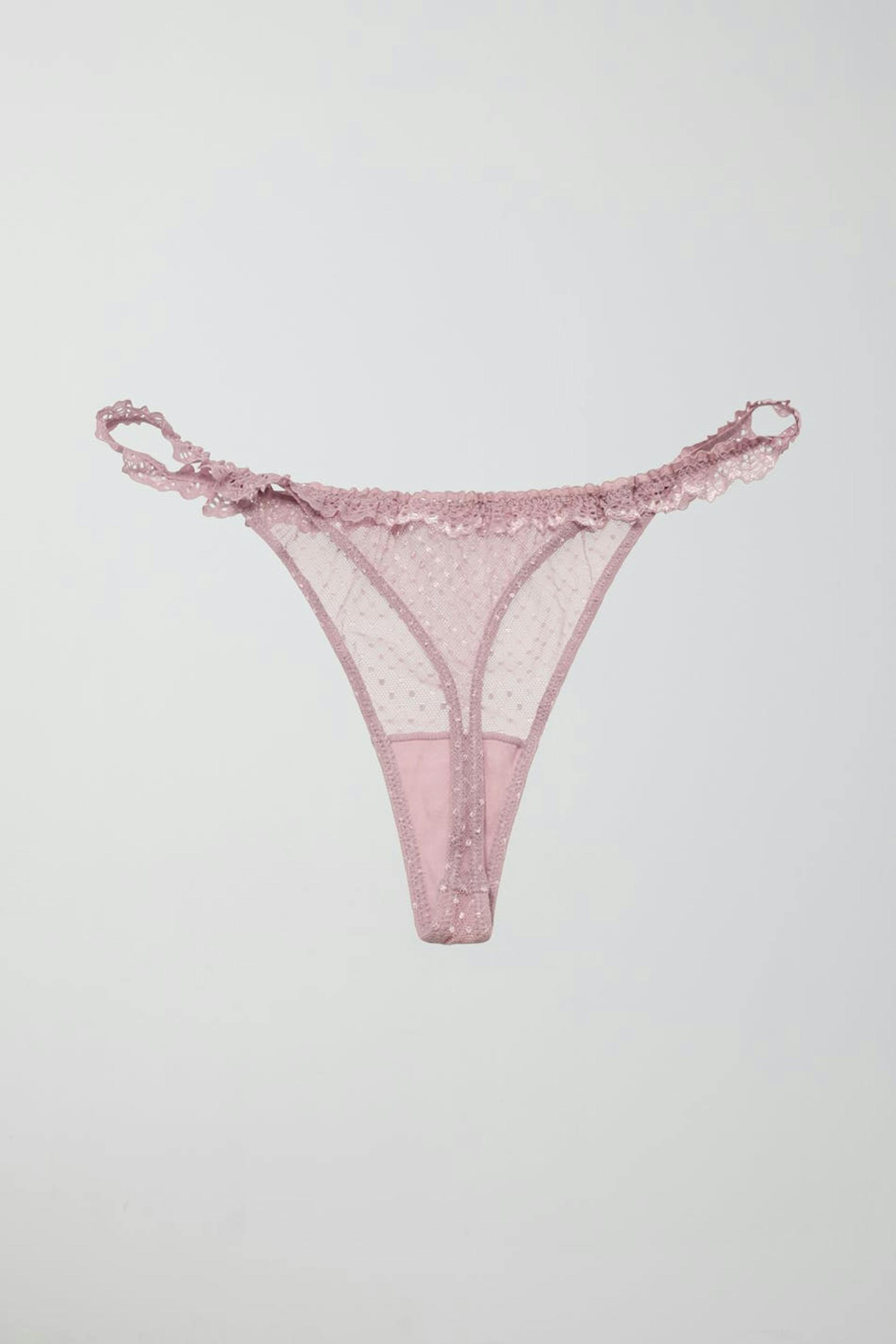 Thongs with lace edge at the top. The thongs are pink and have crotch lining.