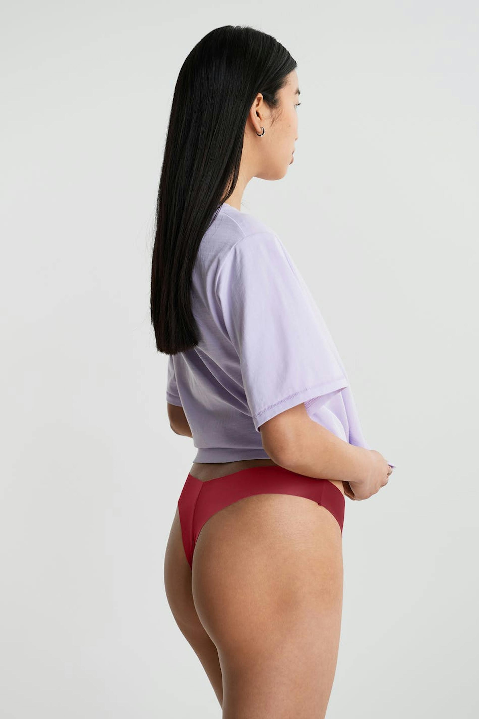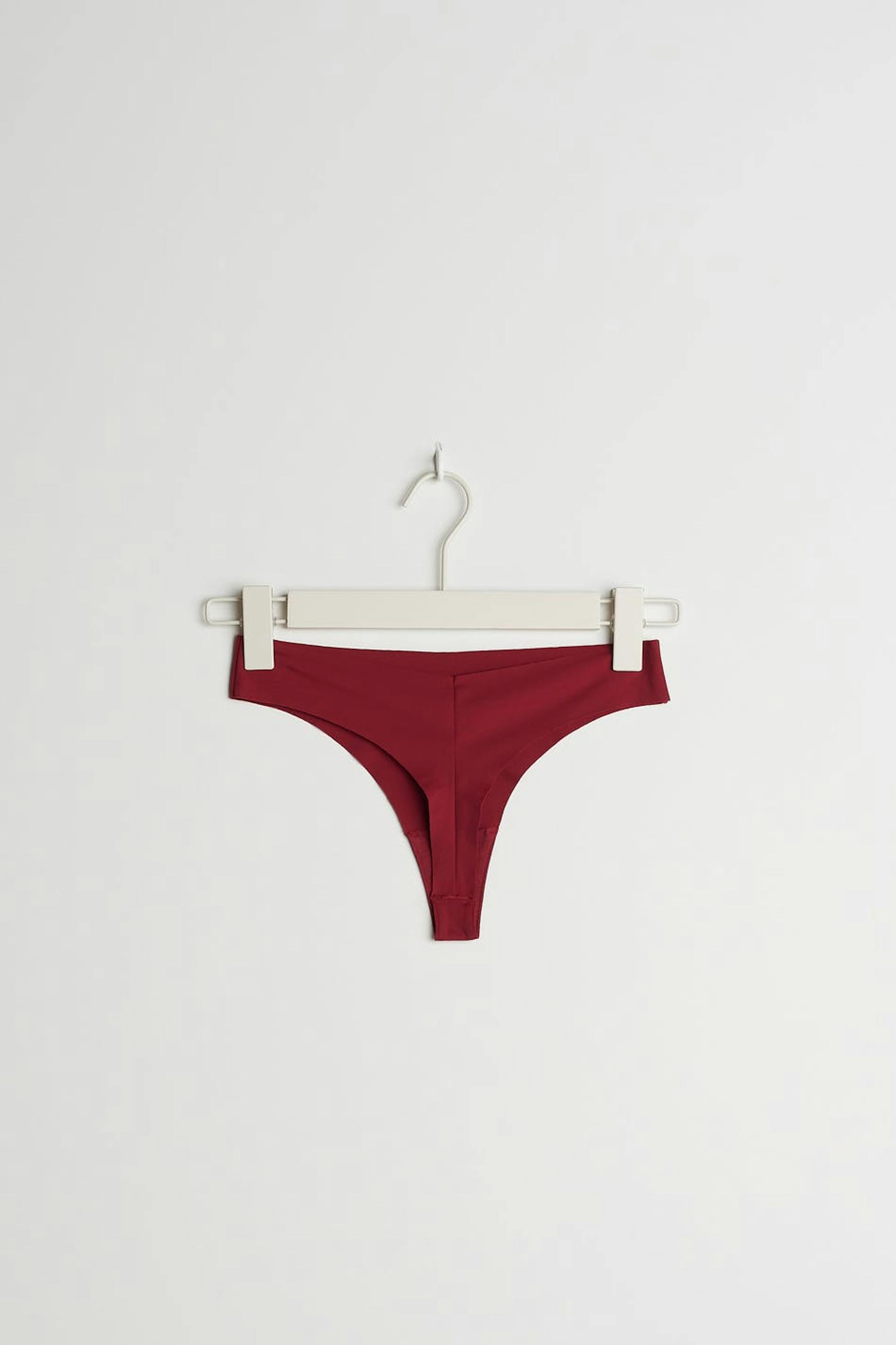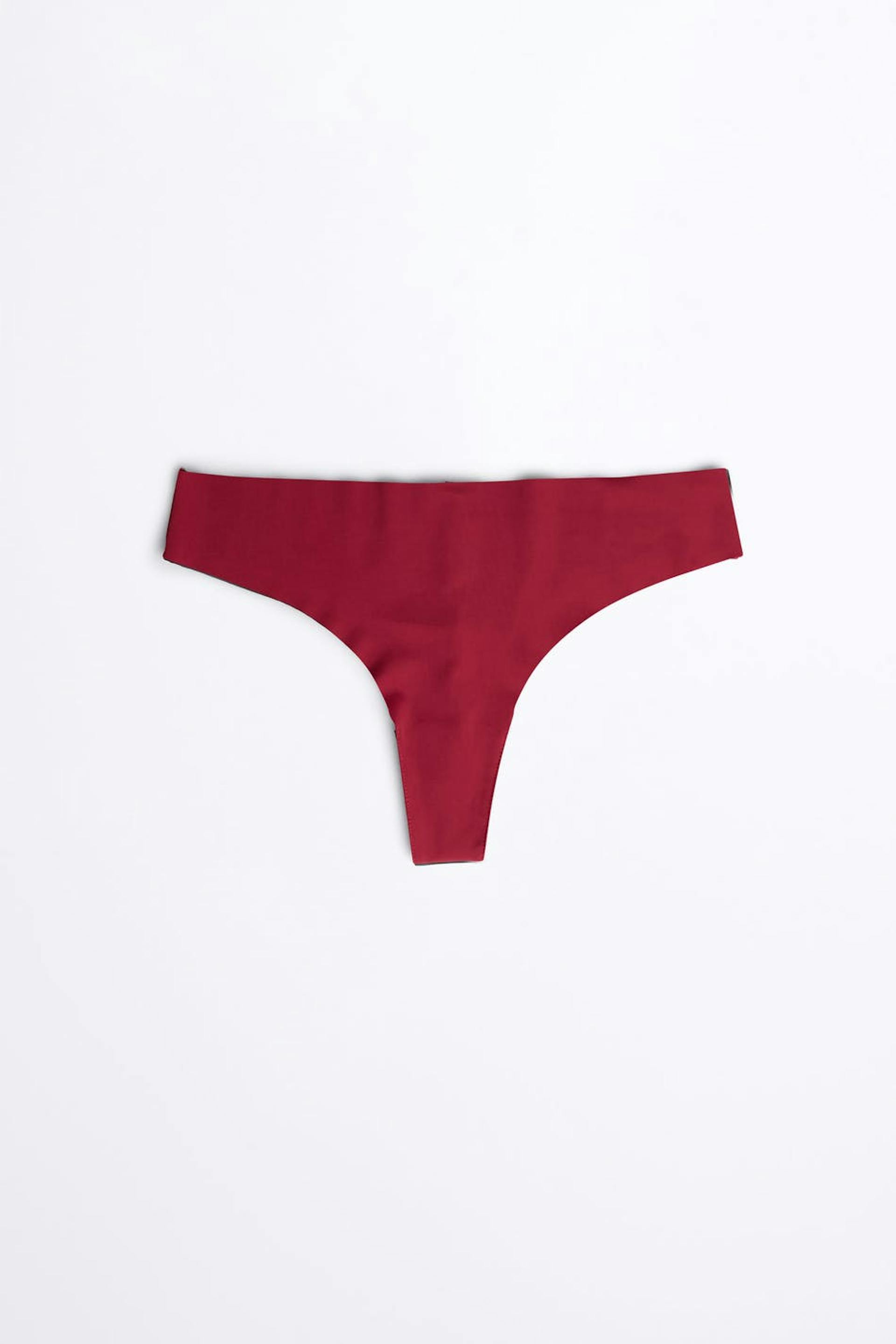 Thongs with a lining in cotton between the legs. The thongs are red. They are made of microfiber.