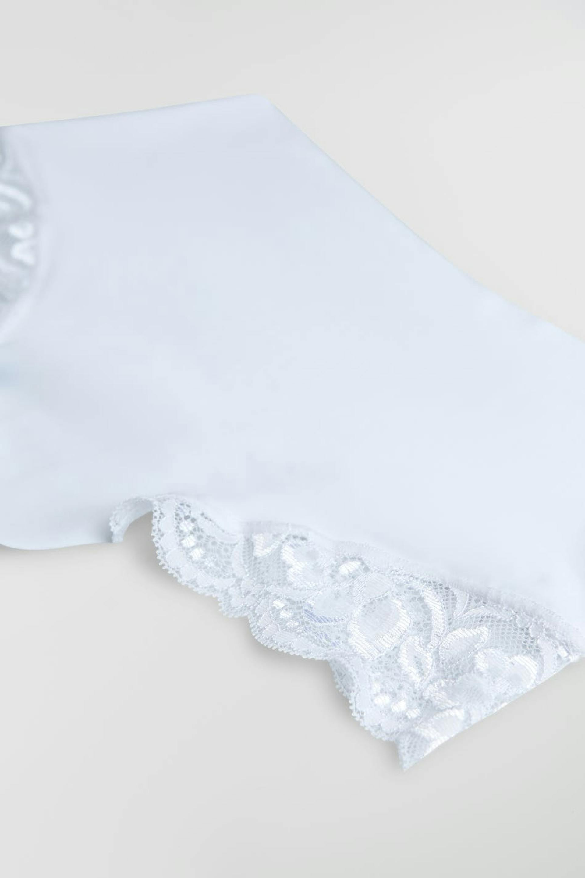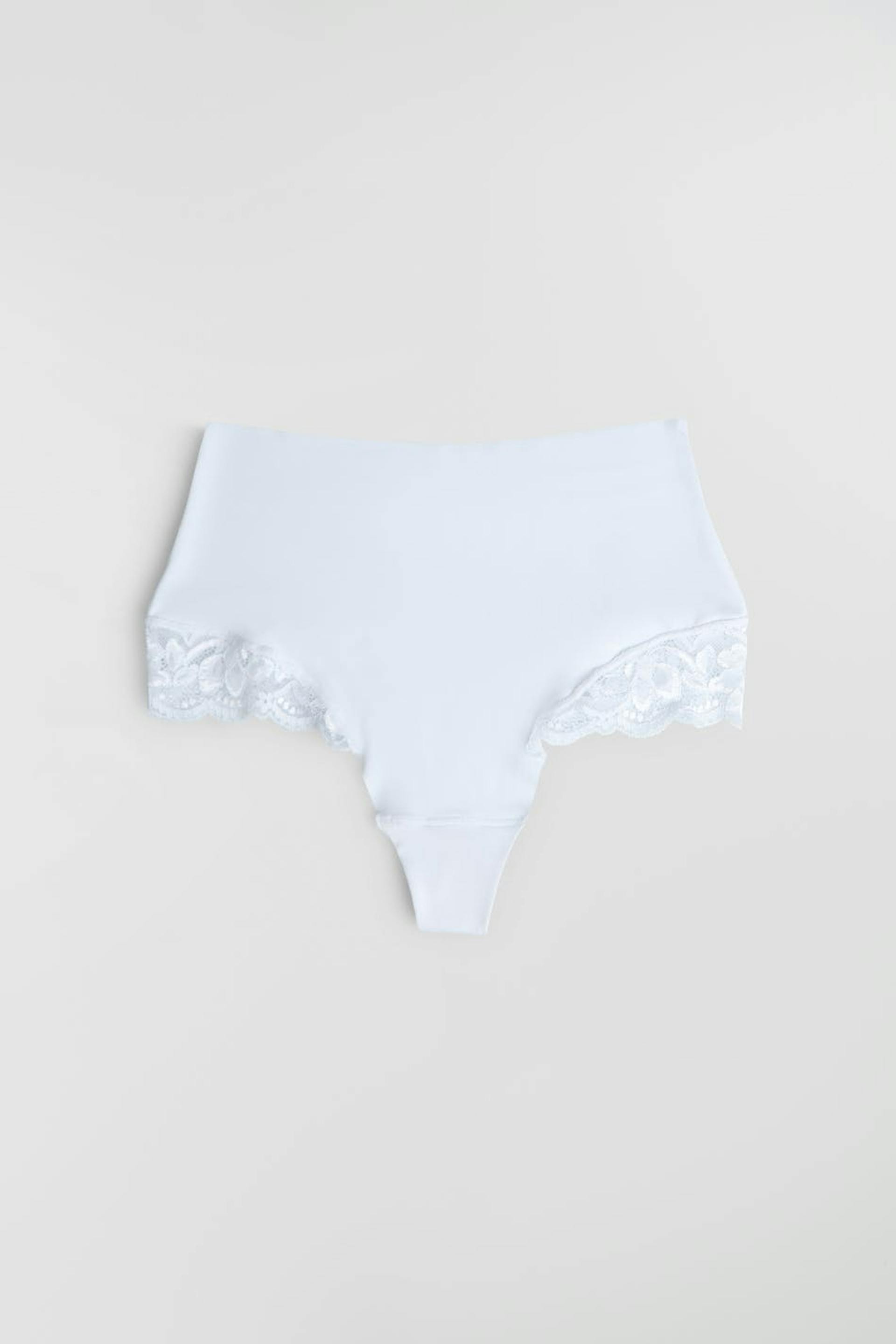Thongs with a high waist. The thongs are white and have a lining in cotton between the legs. They are made of microfiber and have panelling in lace on the sides.