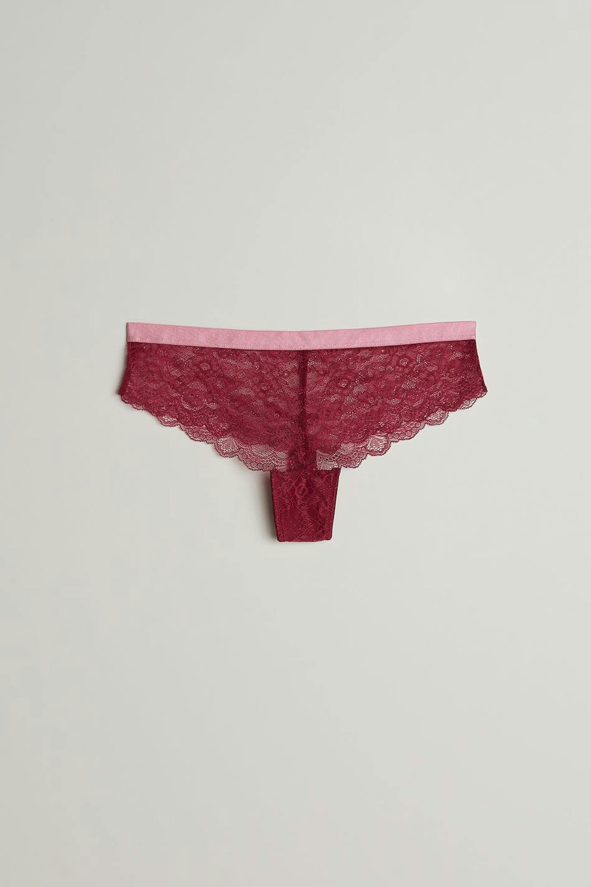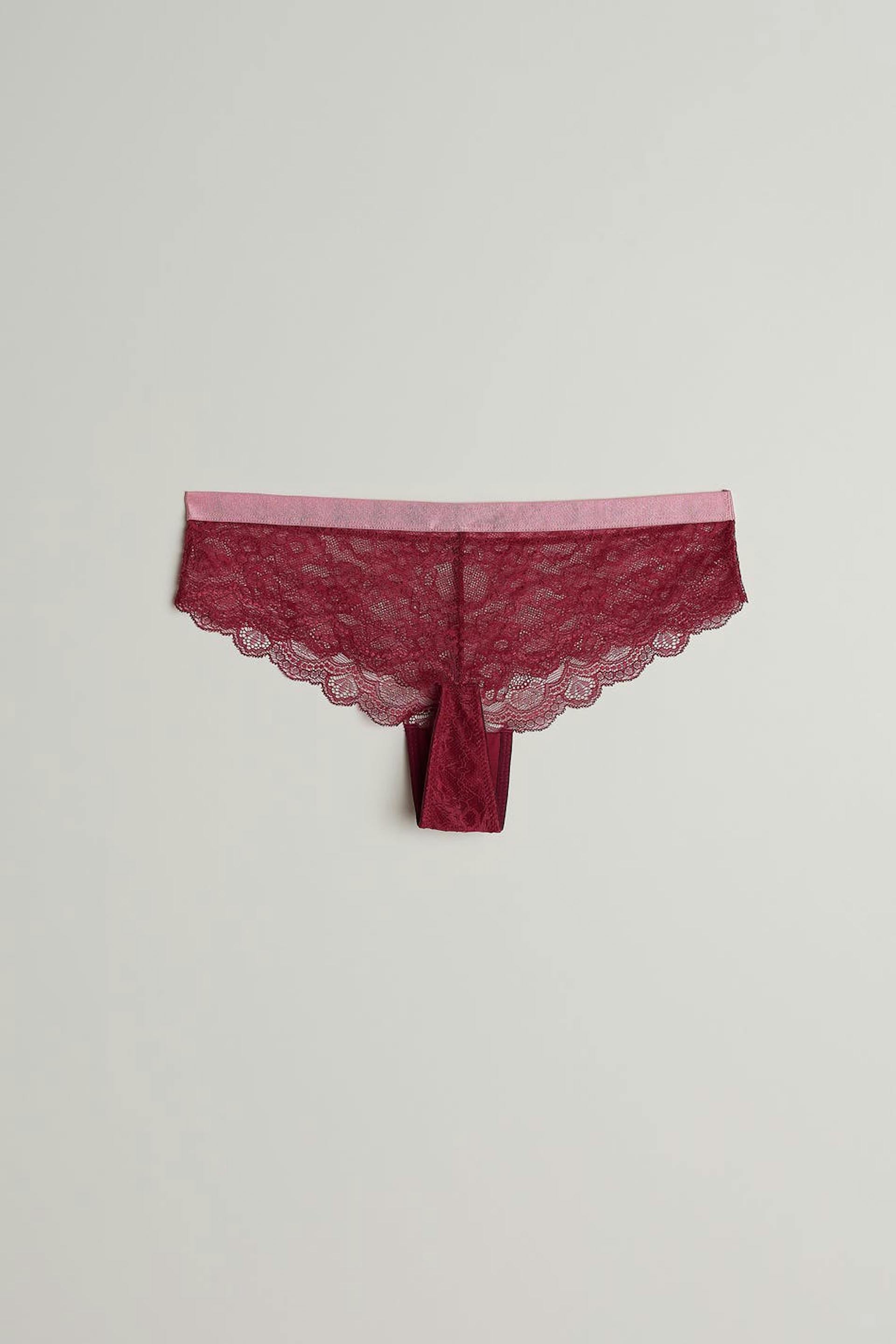 Lace panties with a soft elastic at the waist. The panties are red and have a lined crotch.