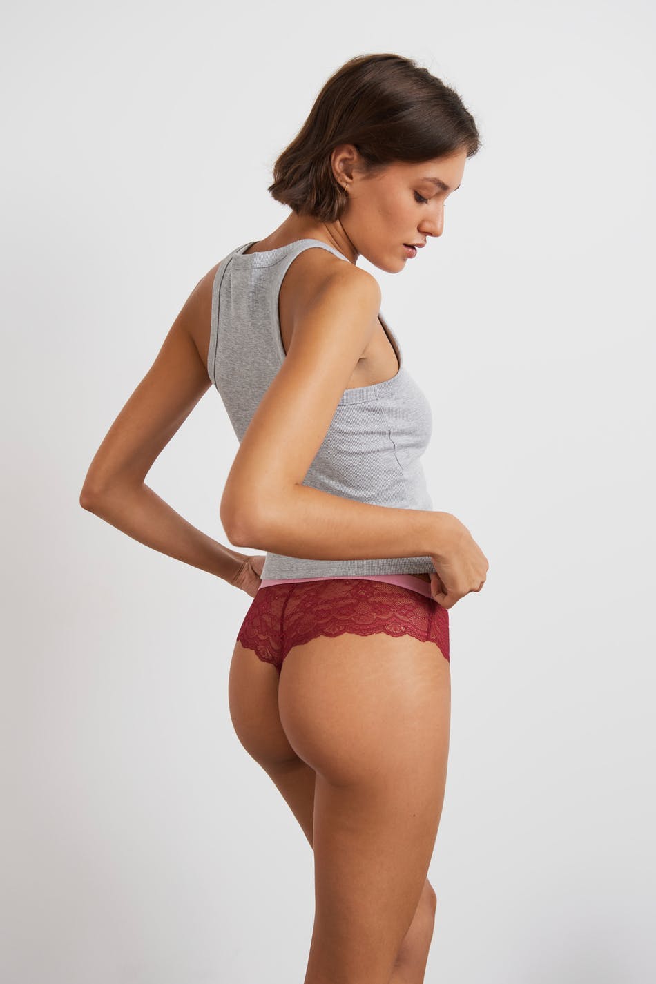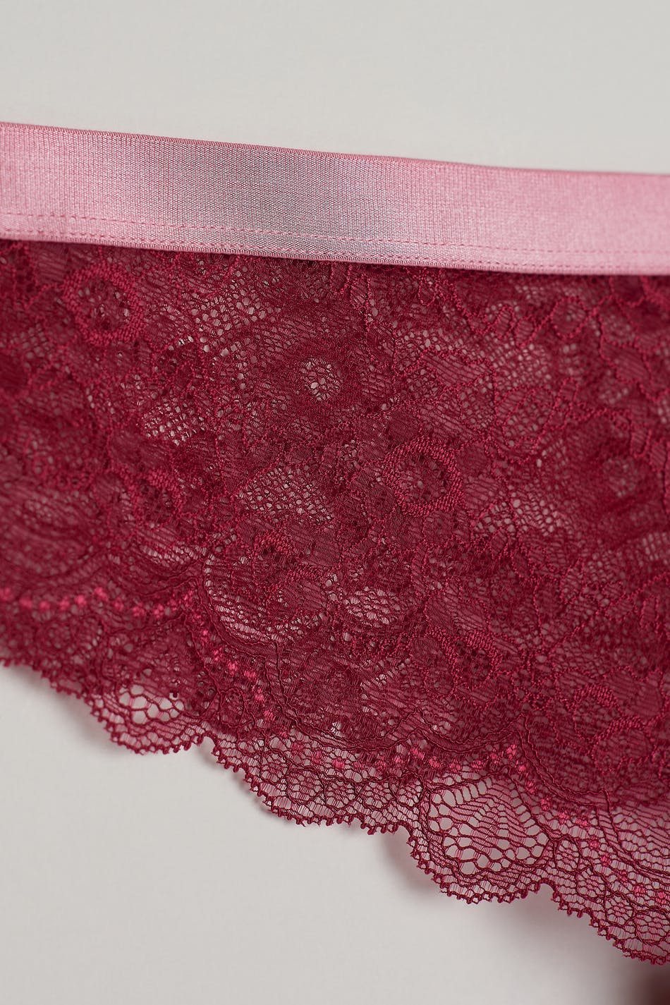 Lace panties with a soft elastic at the waist. The panties are red and have a lined crotch.