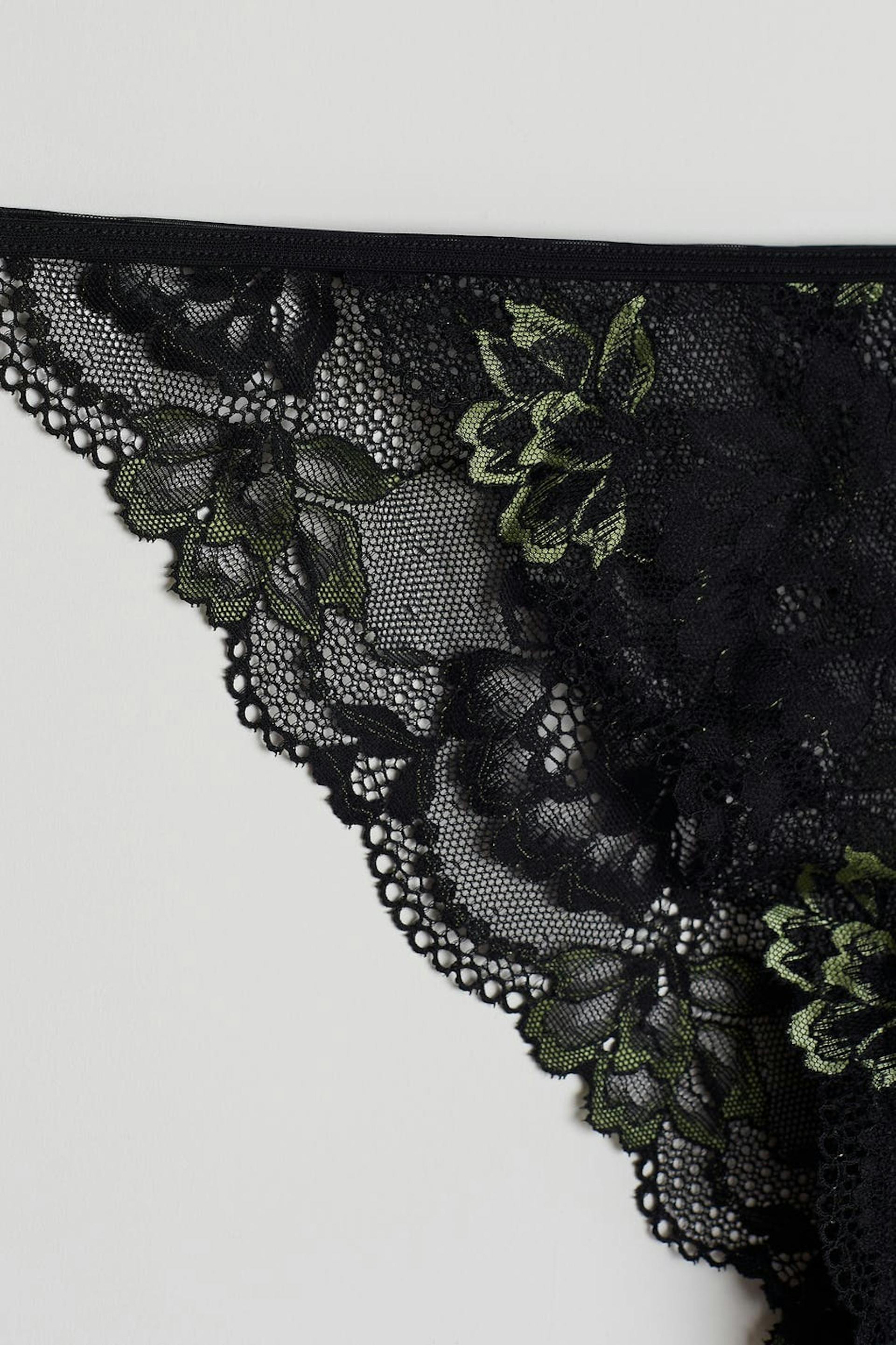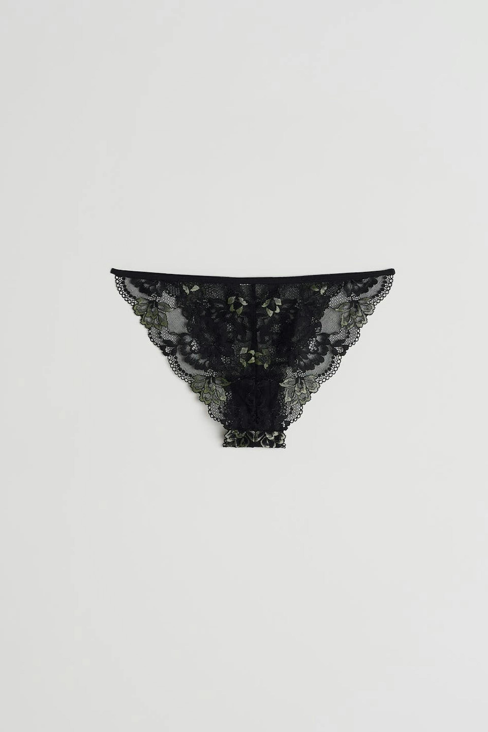 Pantie with a floral material in lace. The pantie is black and has thin bands at the waist. It has a soft lining between the legs.