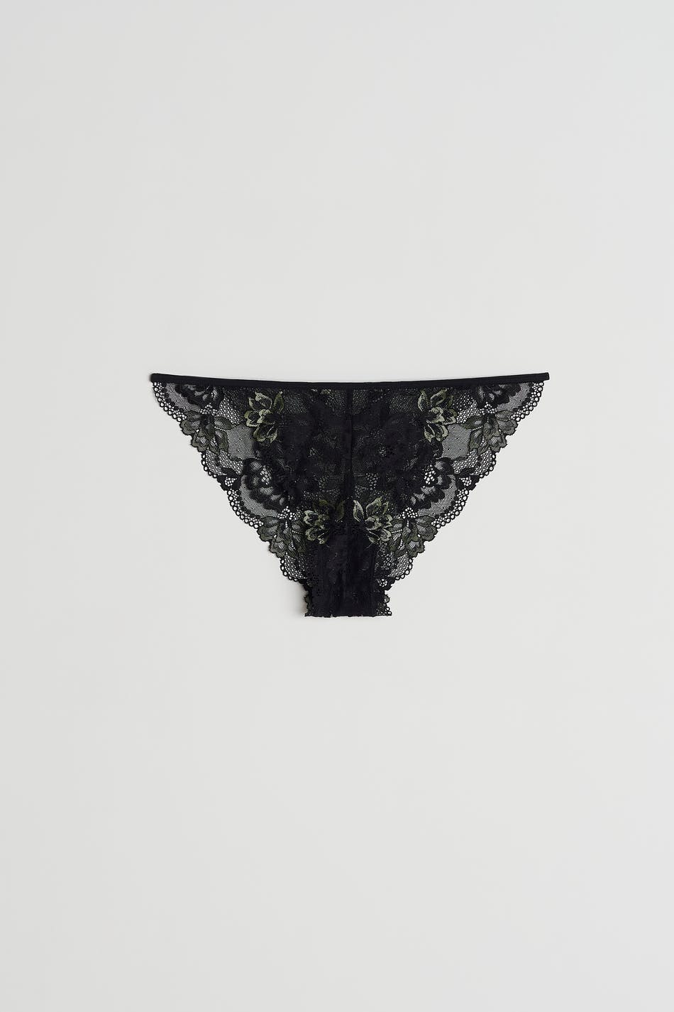 Pantie with a floral material in lace. The pantie is black and has thin bands at the waist. It has a soft lining between the legs.