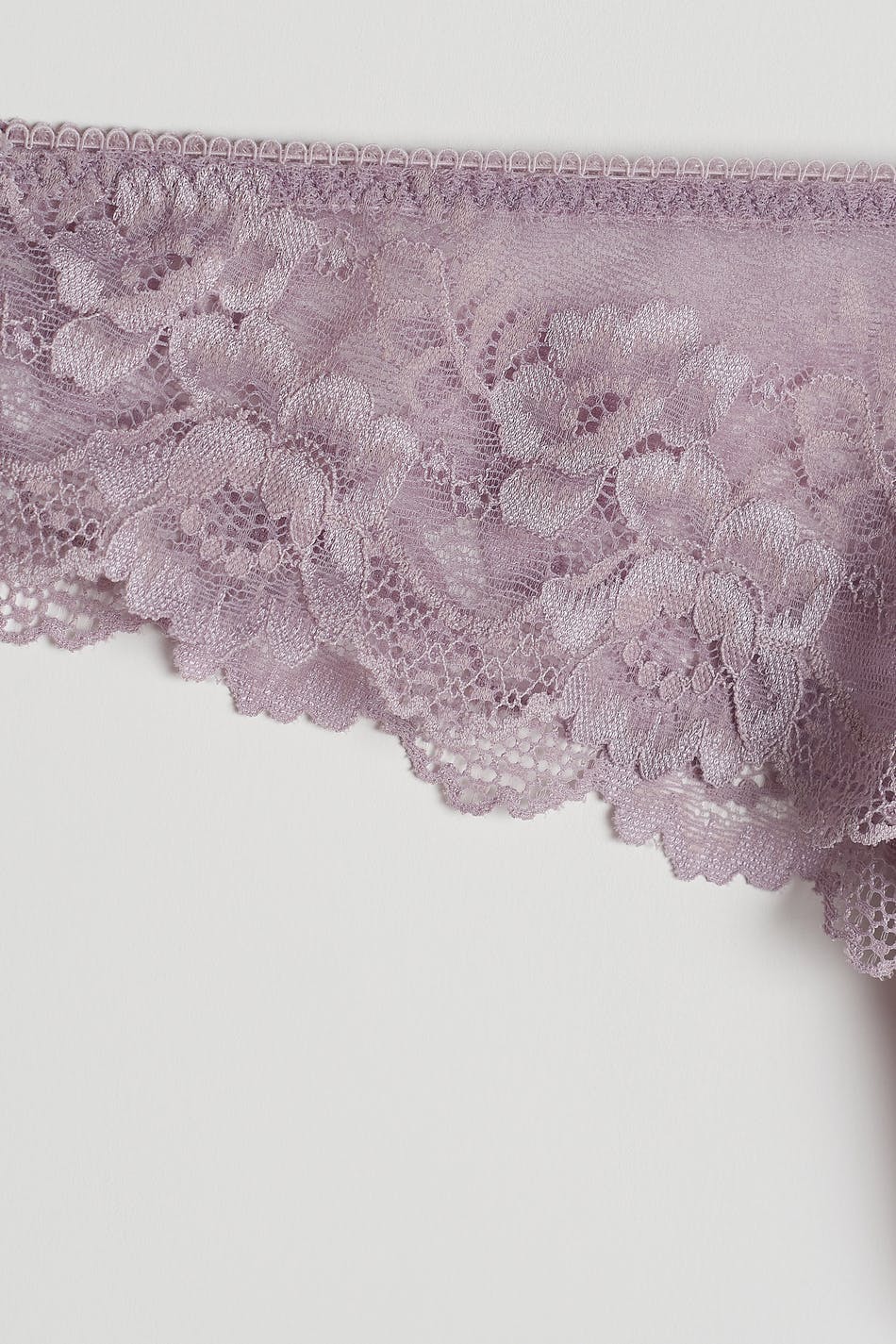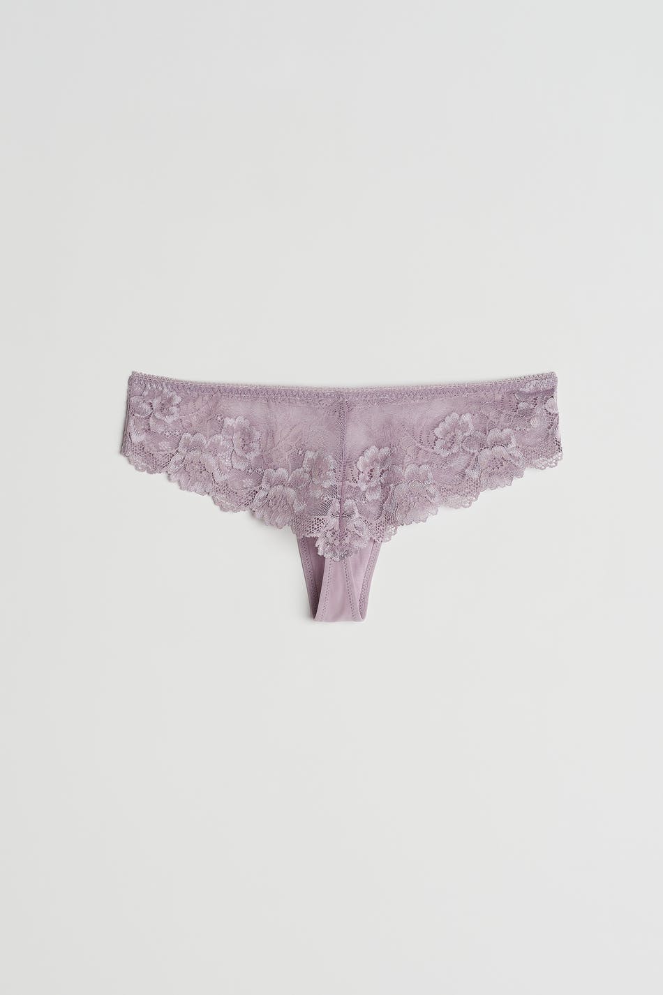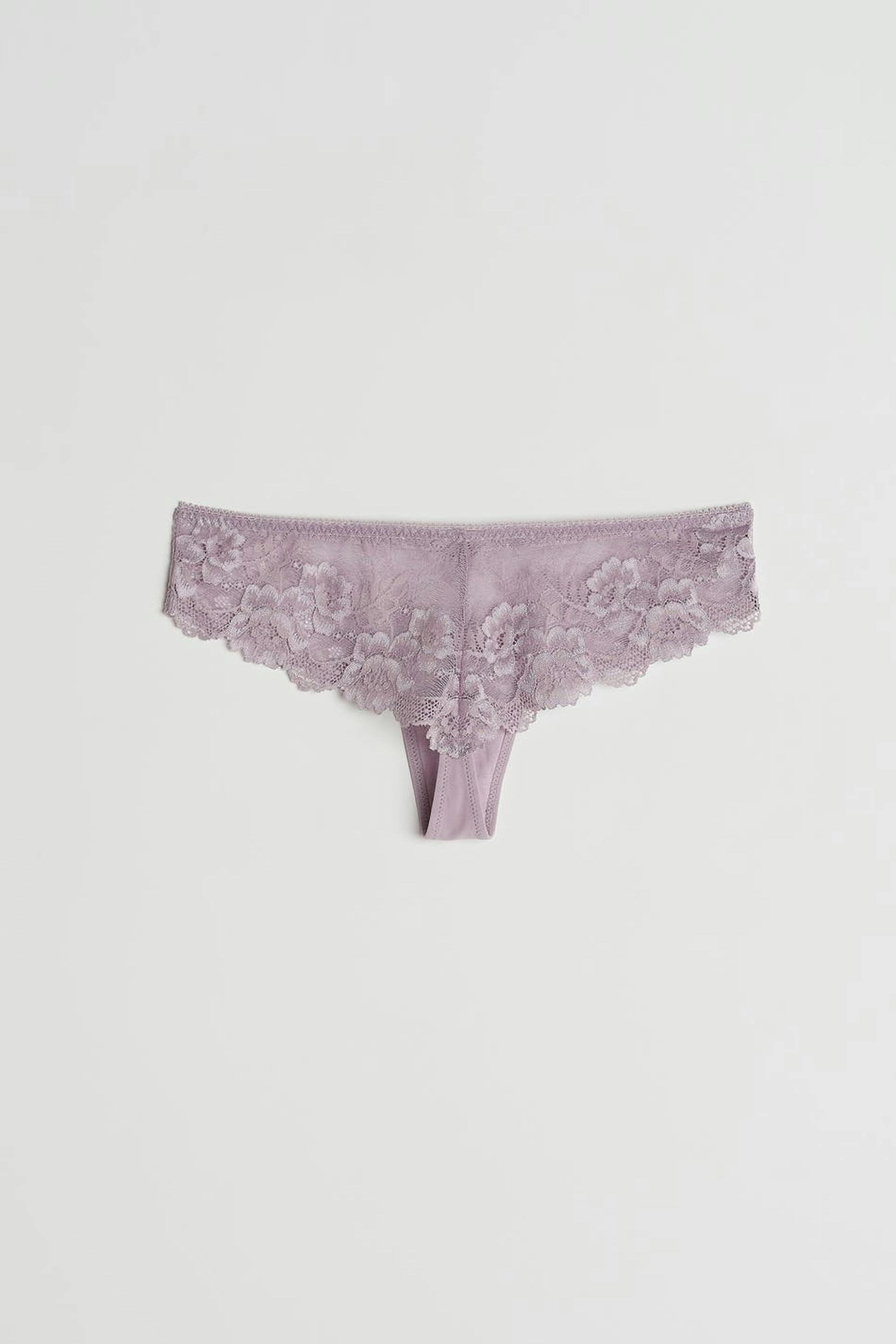 Thongs with a soft material in lace. The thongs are purple and have a lined crotch.
