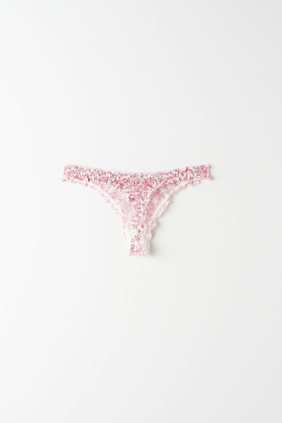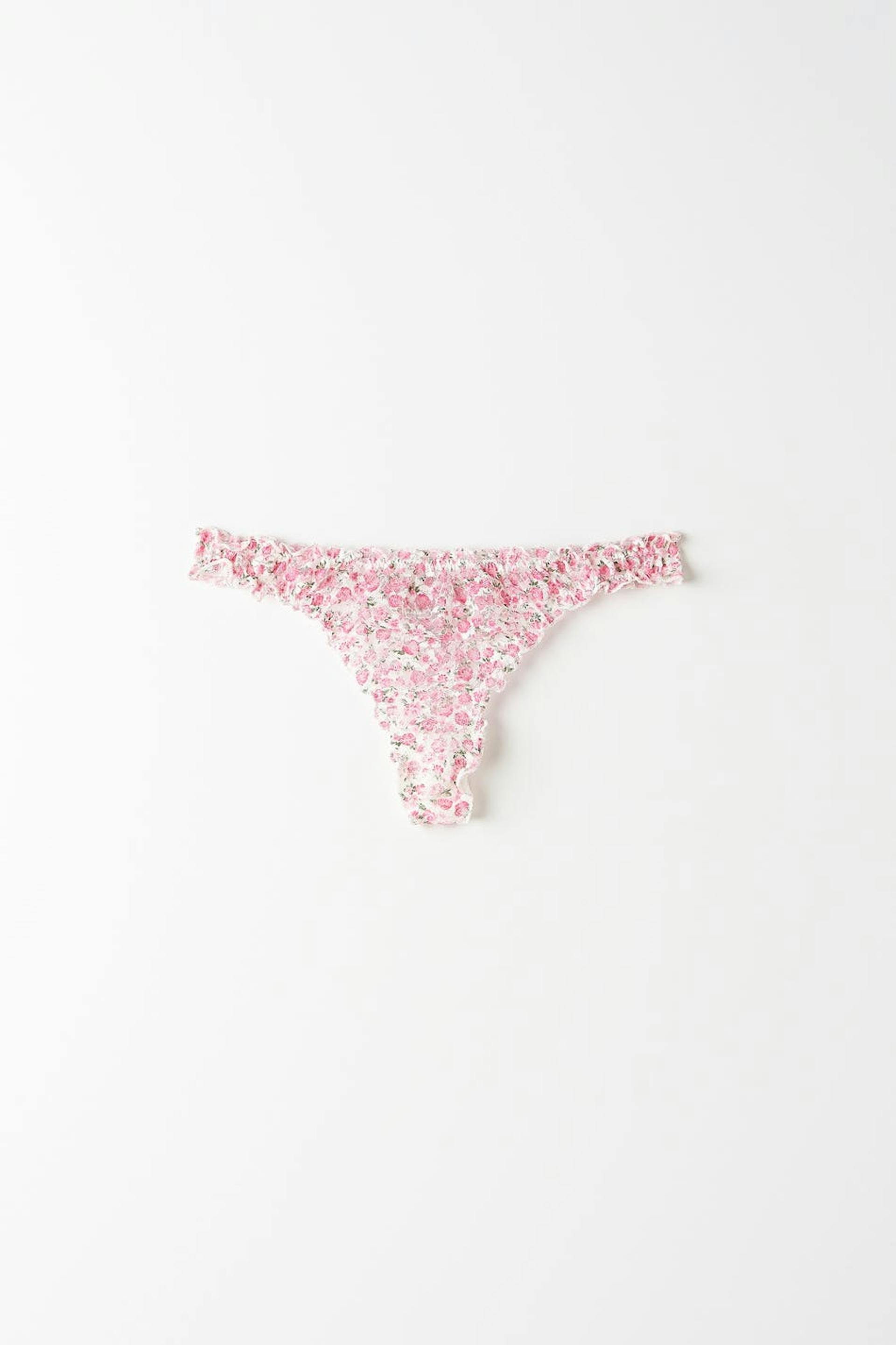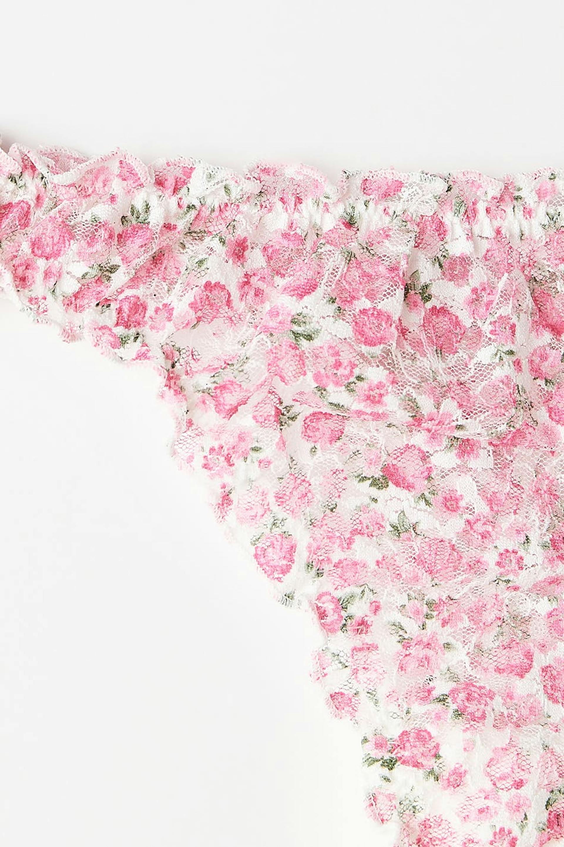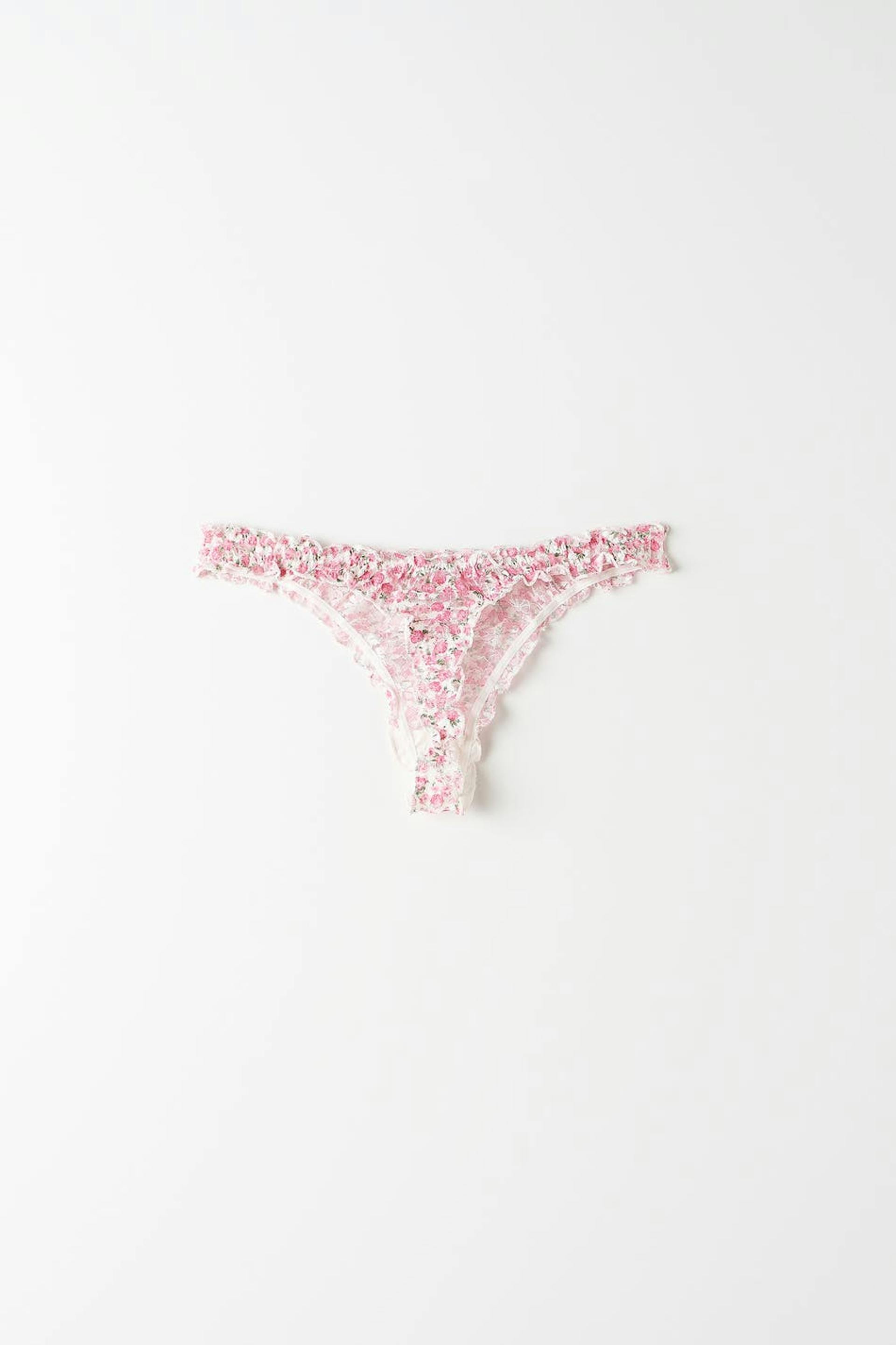 Floral lace panties with ruffled edges. The panties are pink and have a lining in cotton between the legs.