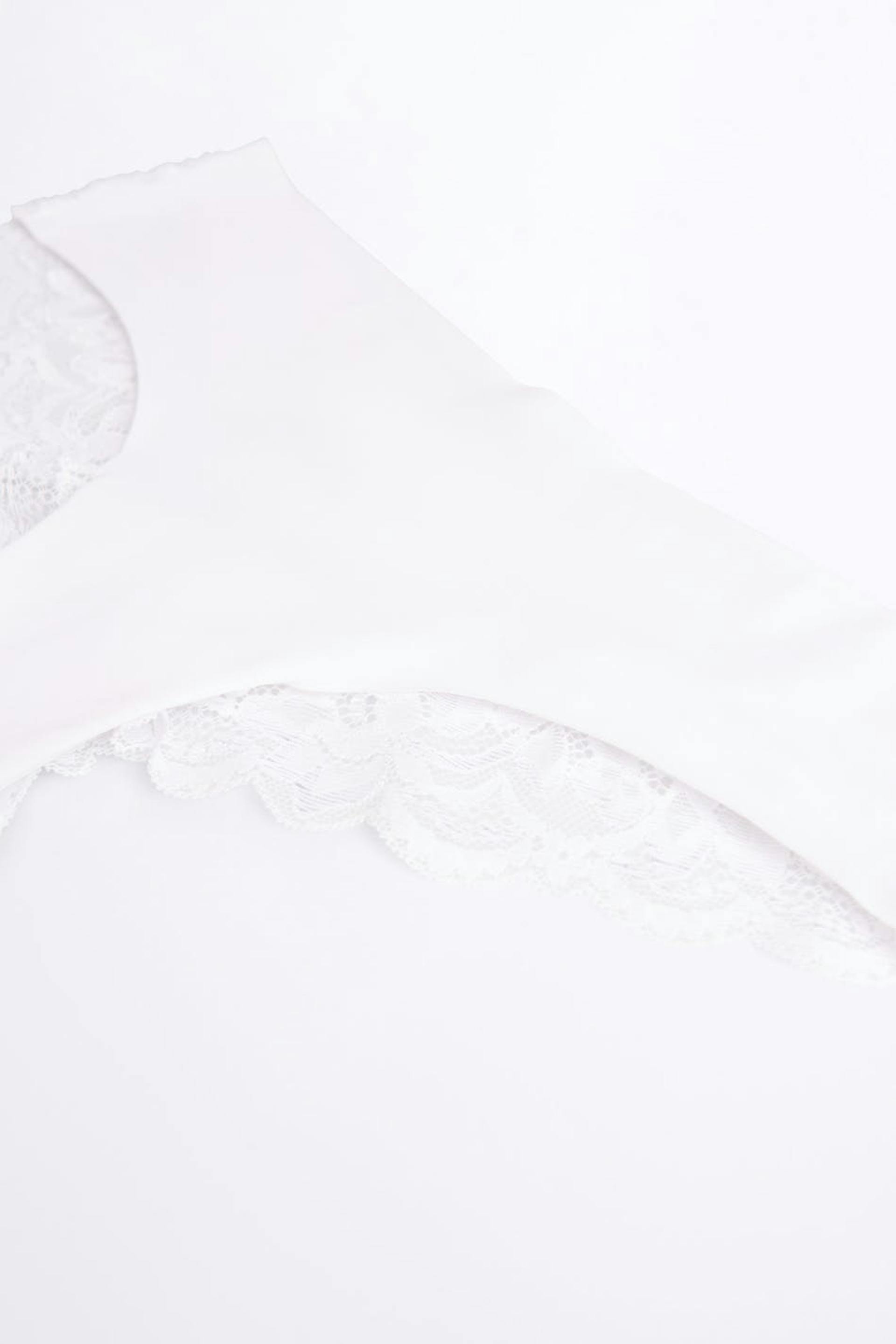 Brazilian pantie with a lining in cotton. The pantie is white and has panelling in lace at the back. It is made of microfiber.