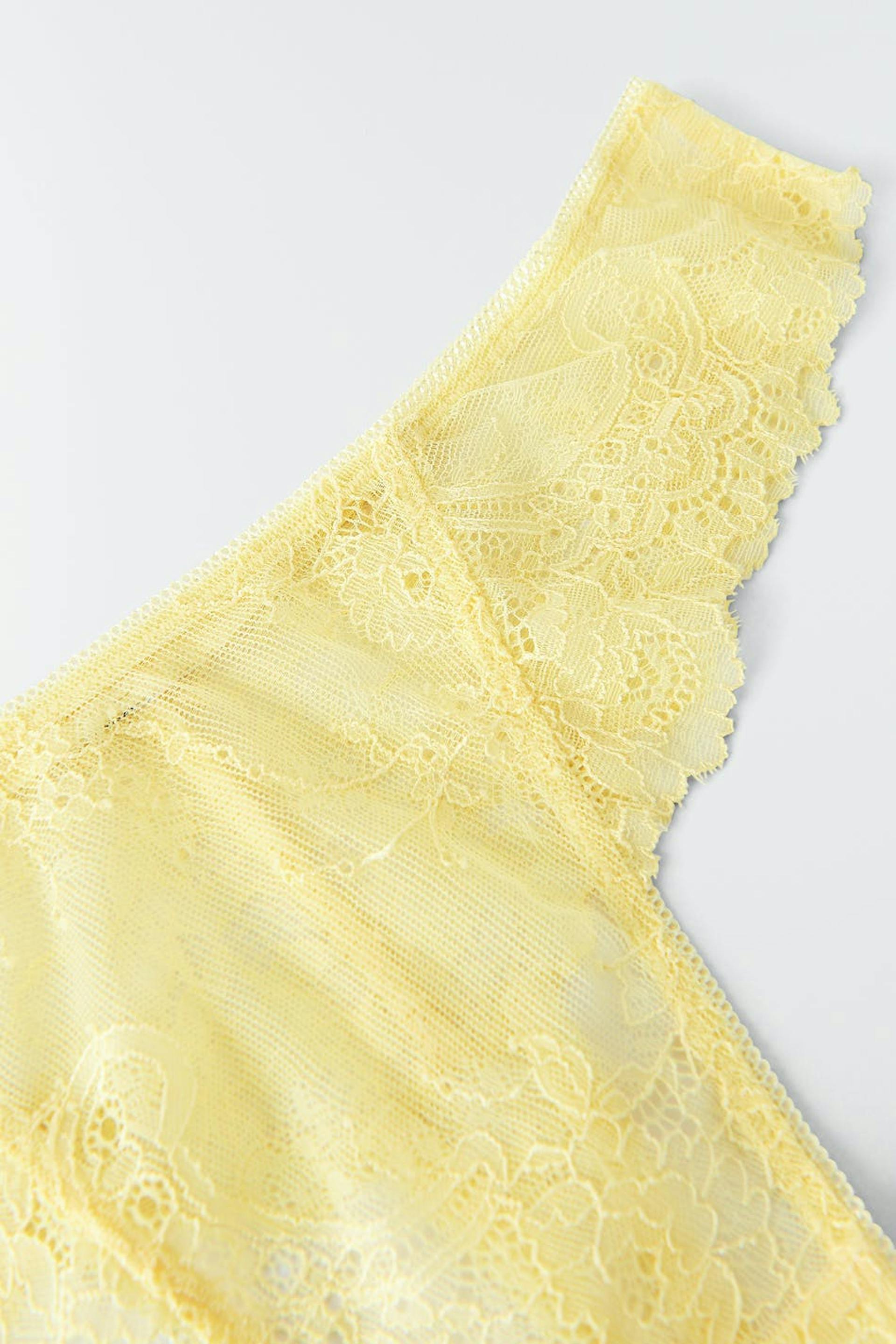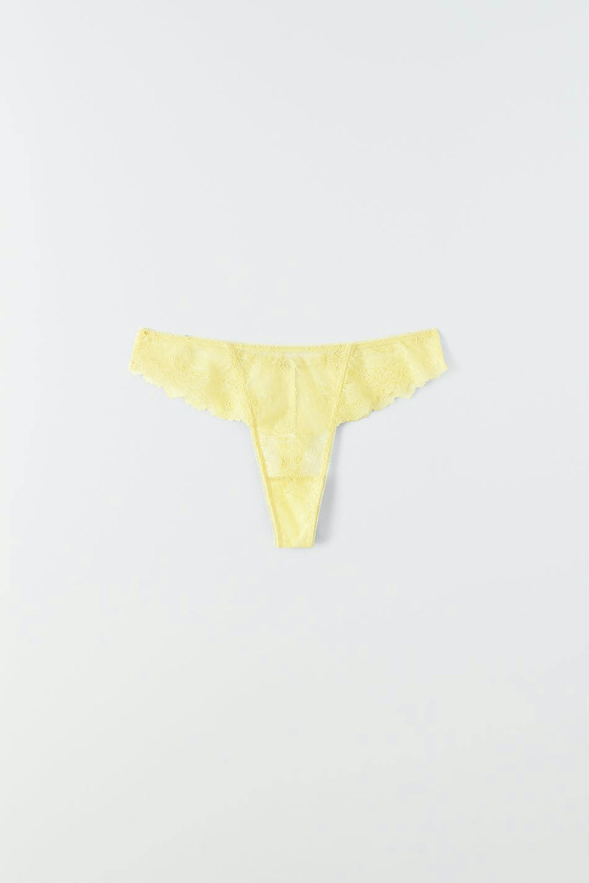 Thong in lace with a crotch lining in cotton. The thong is yellow and has a bow detail at the back.