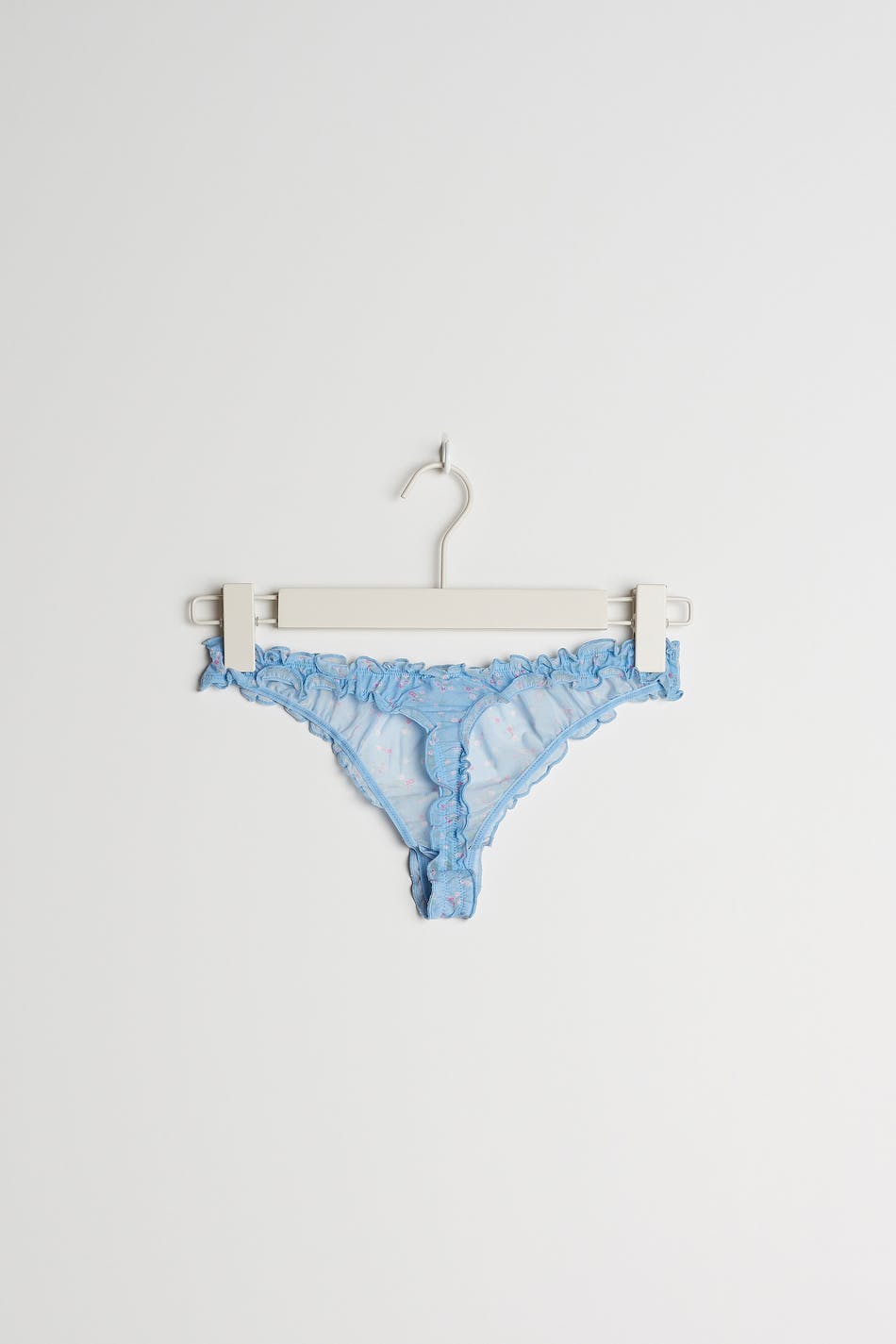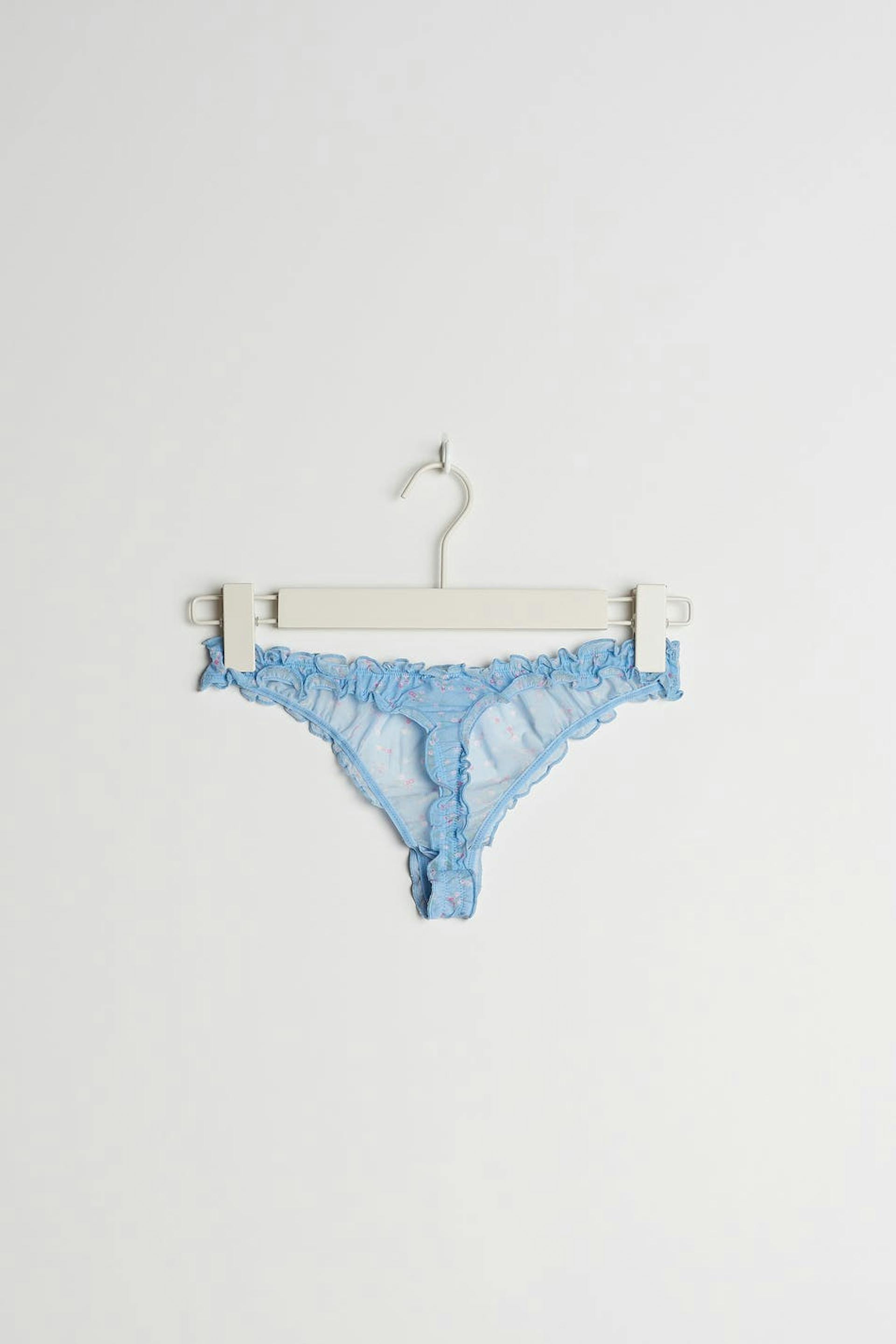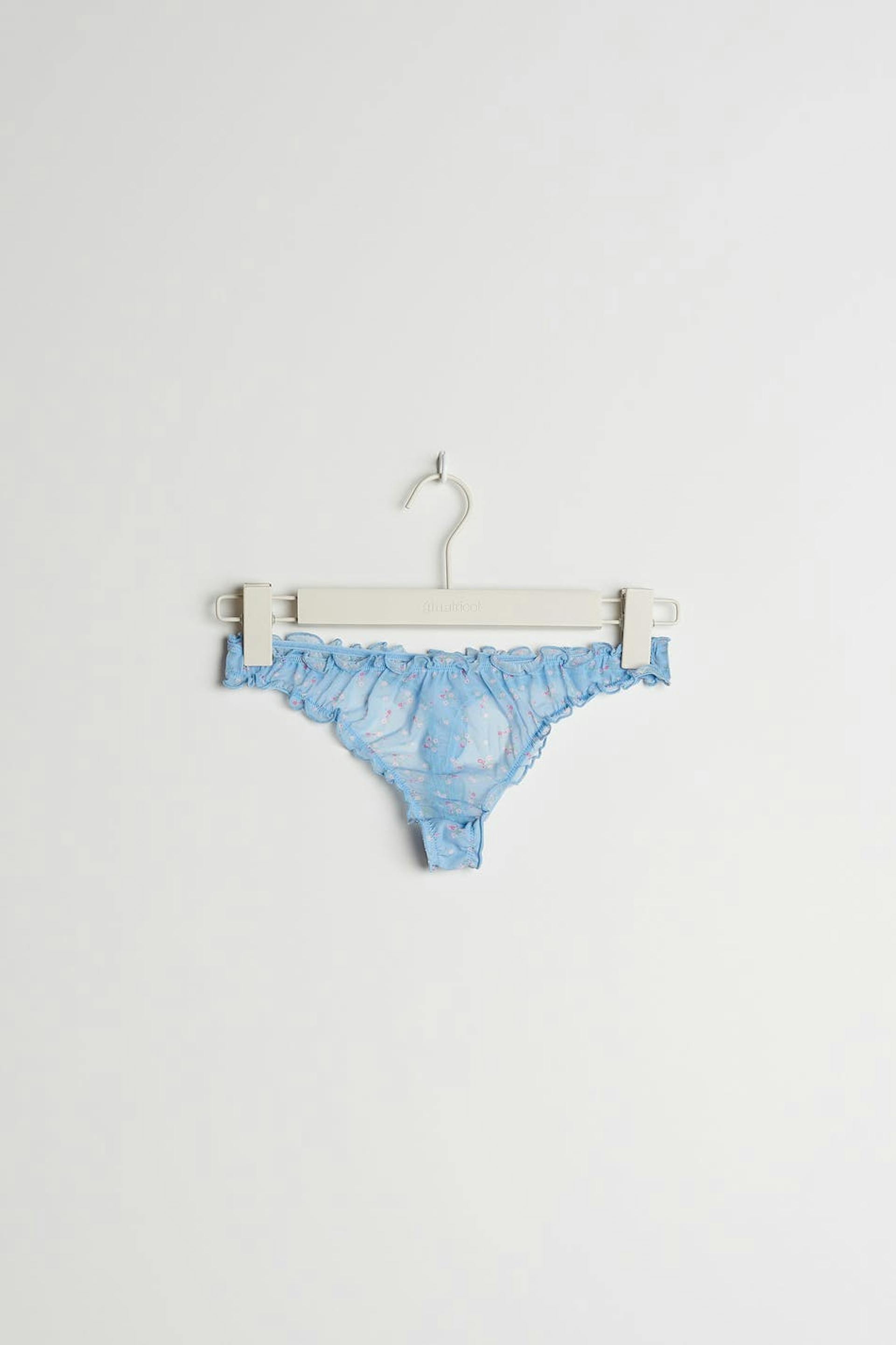 Panties with pink, small flowers. The panties are blue and have a thong design. They are made of mesh and have ruching at the opening and a lining in cotton.