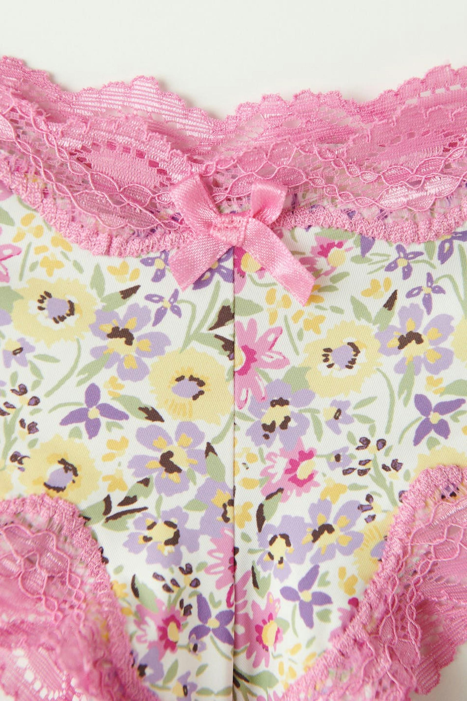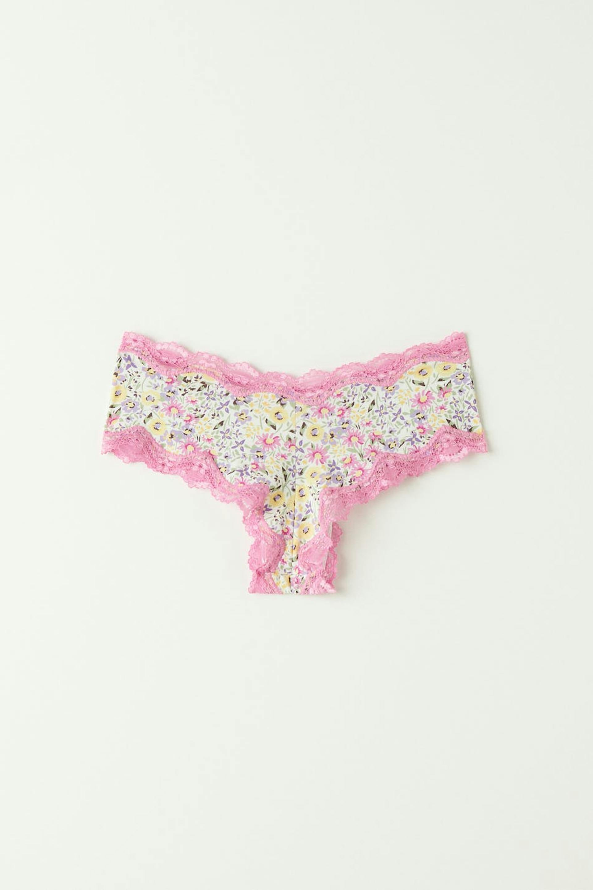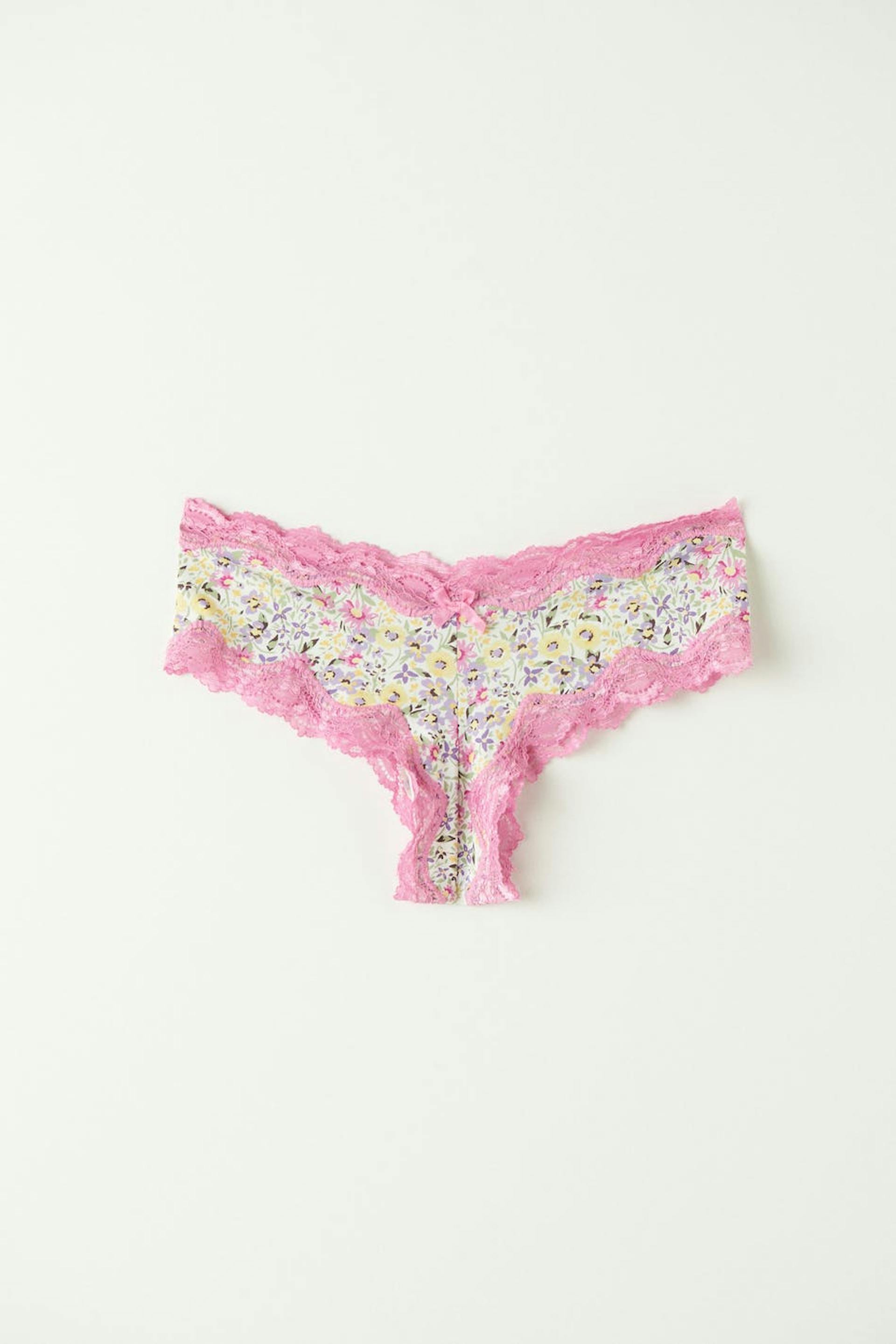 Soft Brazilian panties in microfiber with lace edges. The Brazilian panties are pink and have a small bow at the front.