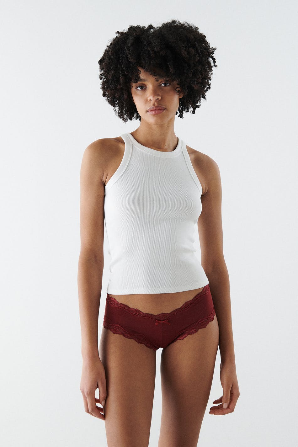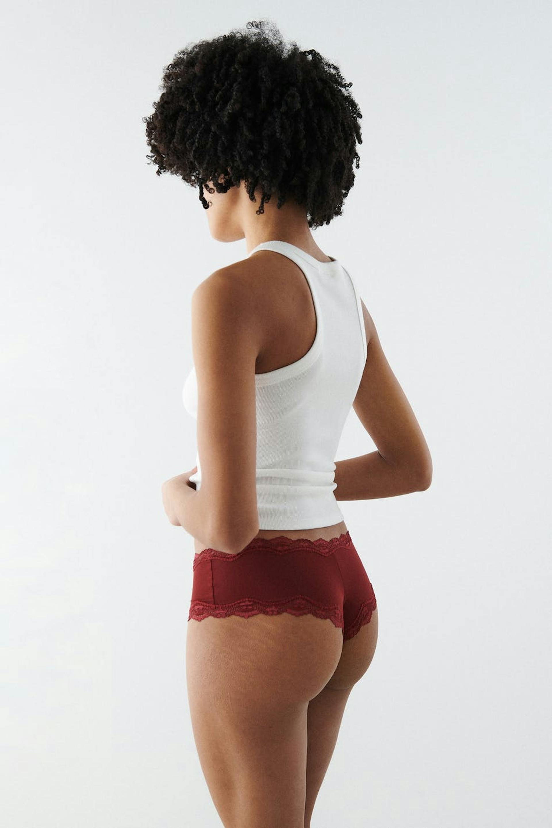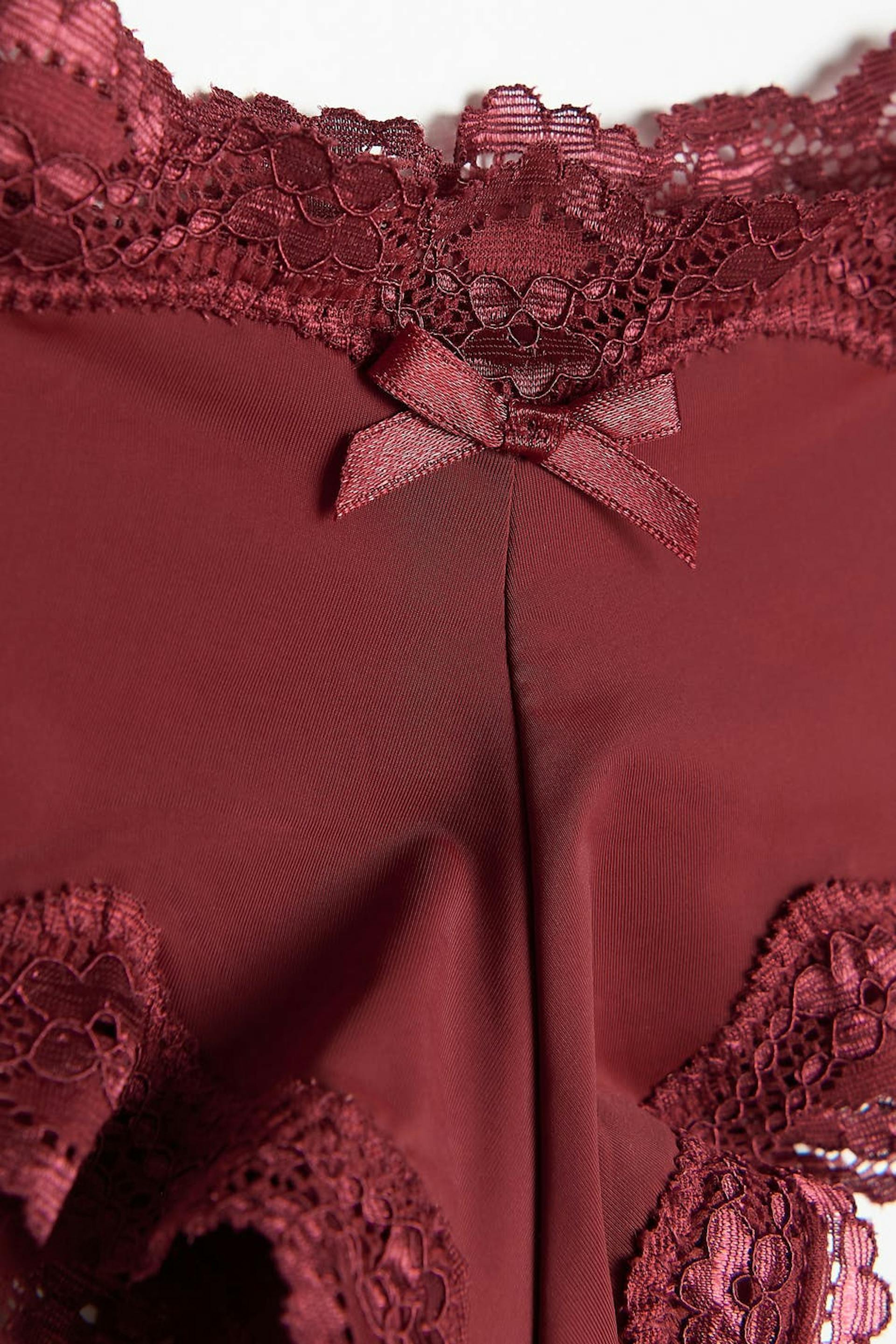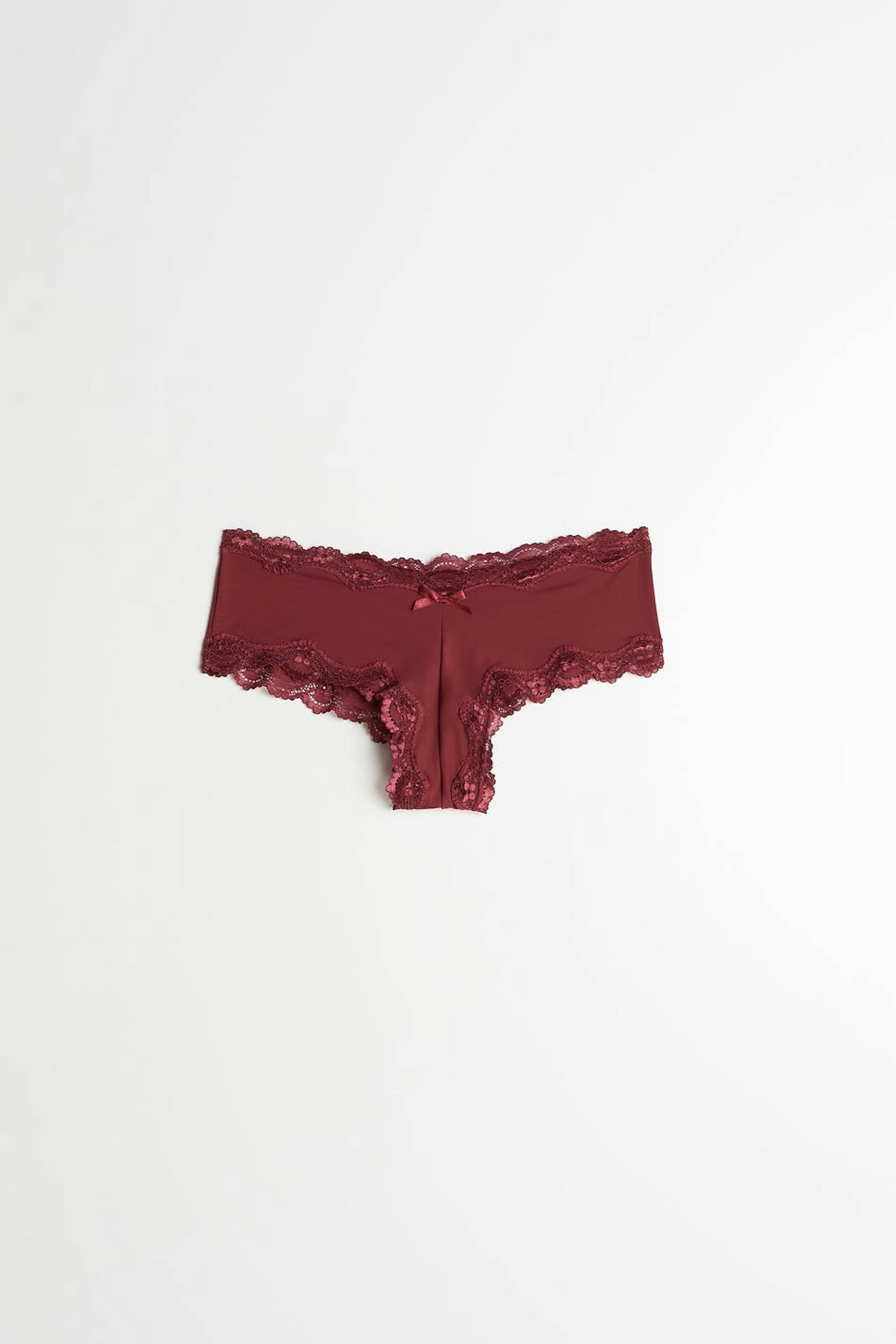 Soft pantie with a small bow at the front. The pantie is maroon and has lace details. It is made of microfiber.