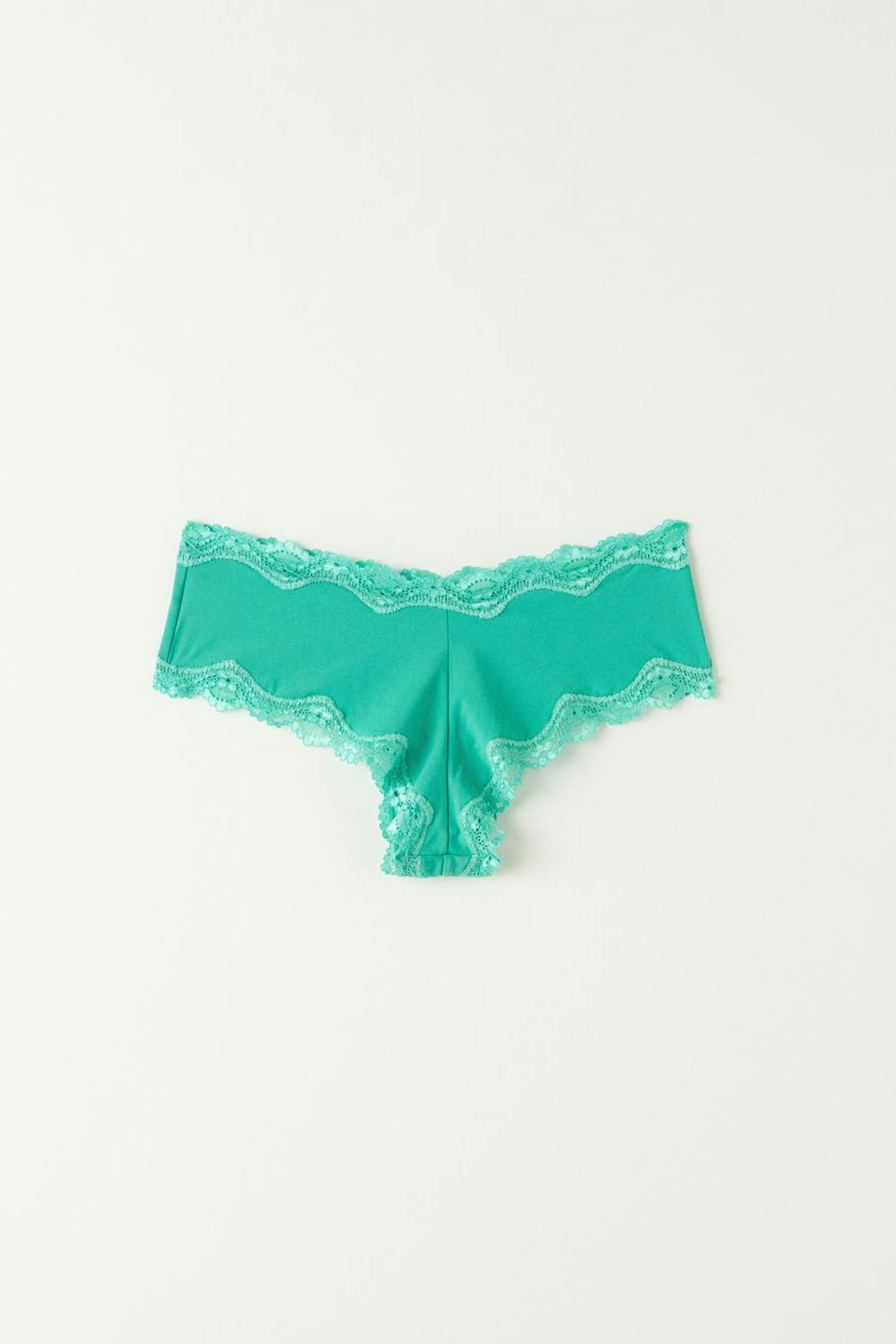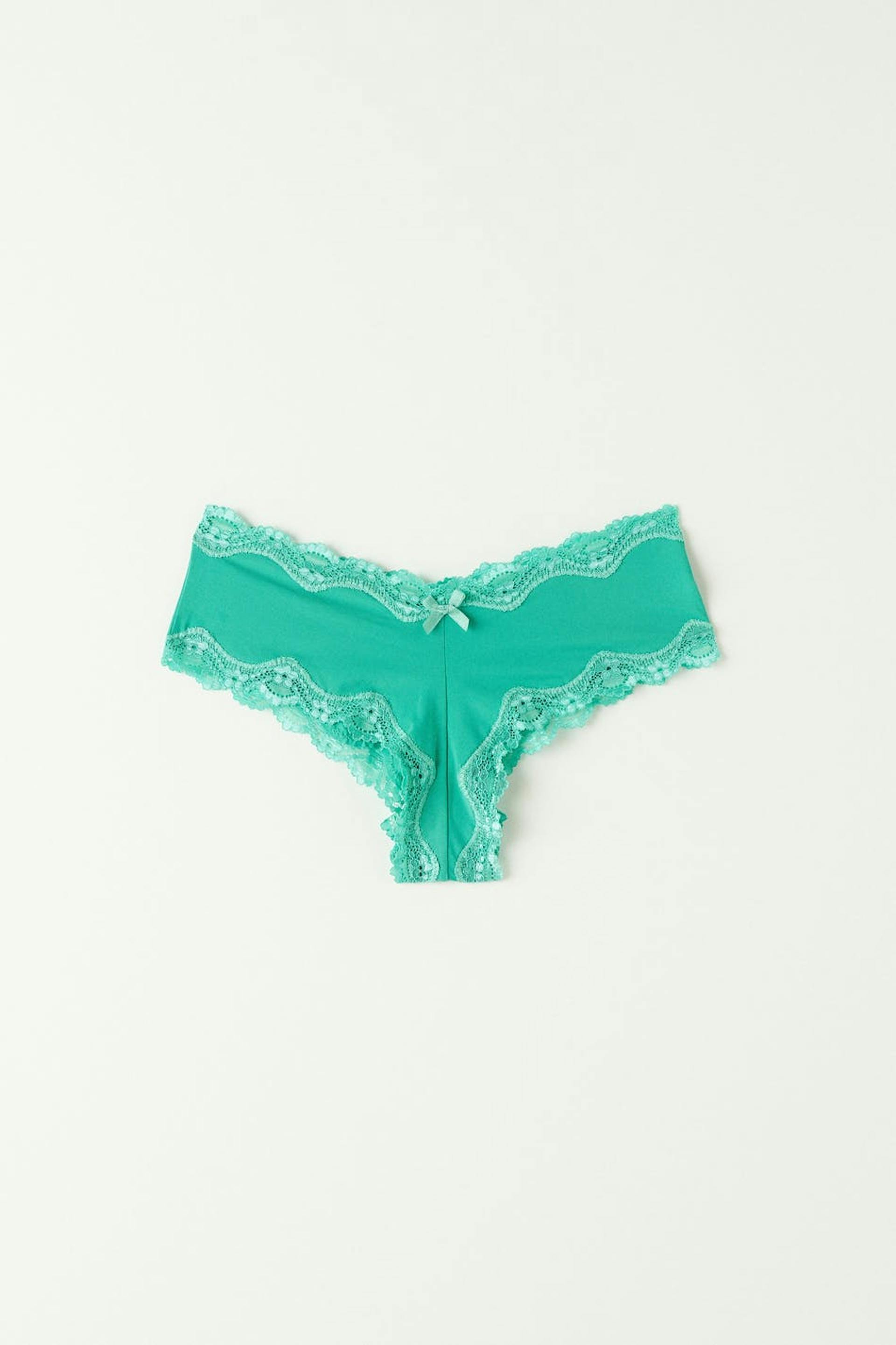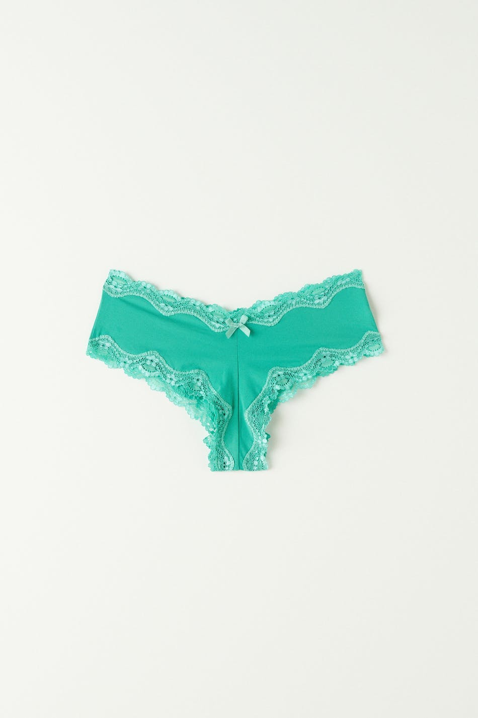 Soft Brazilian panties in microfiber with lace edges. The Brazilian panties are green and have a small bow at the front.