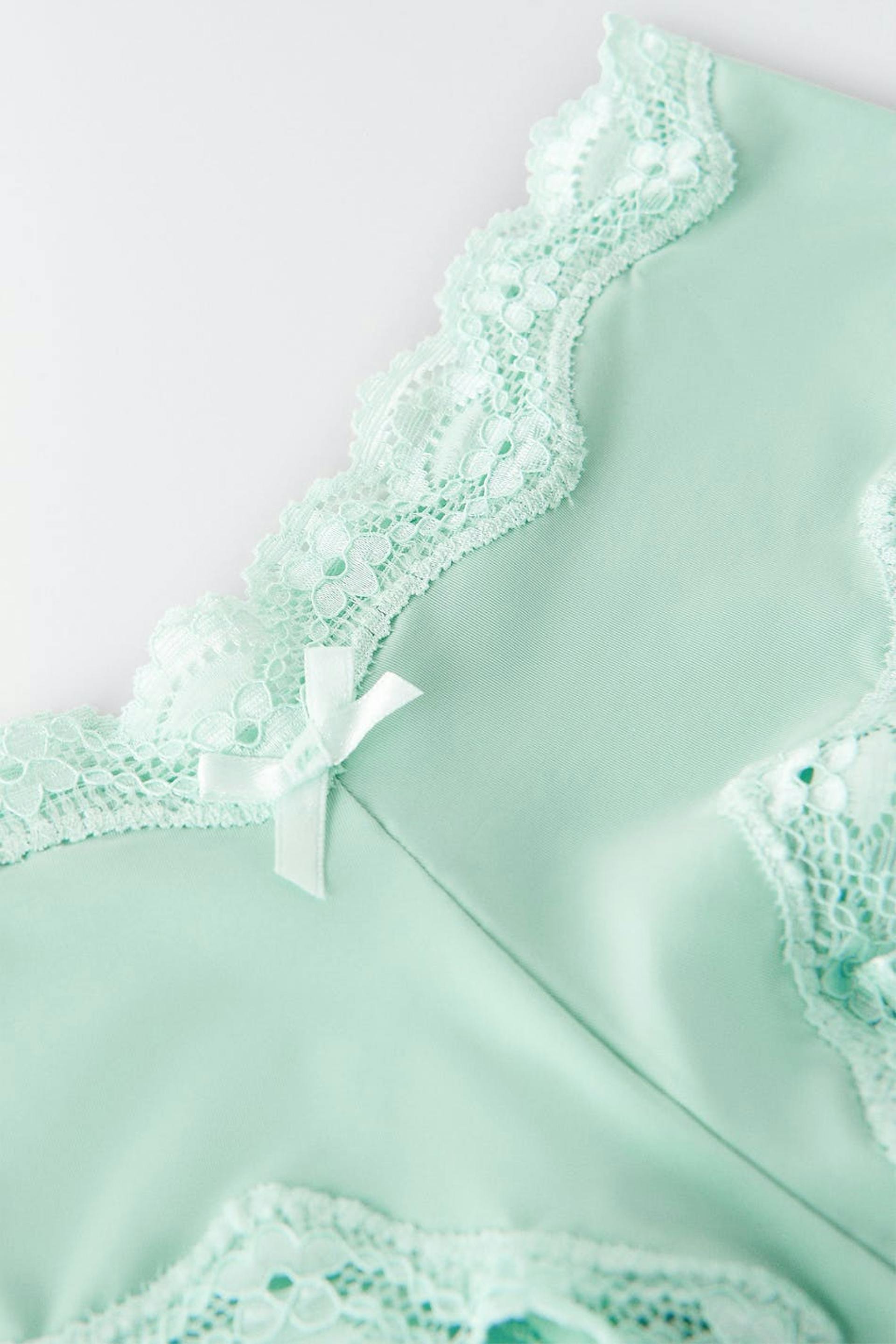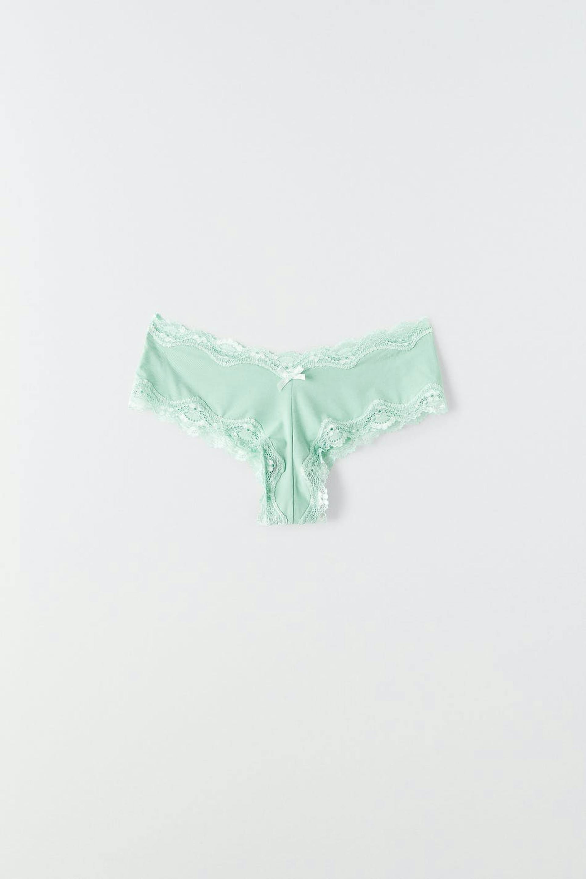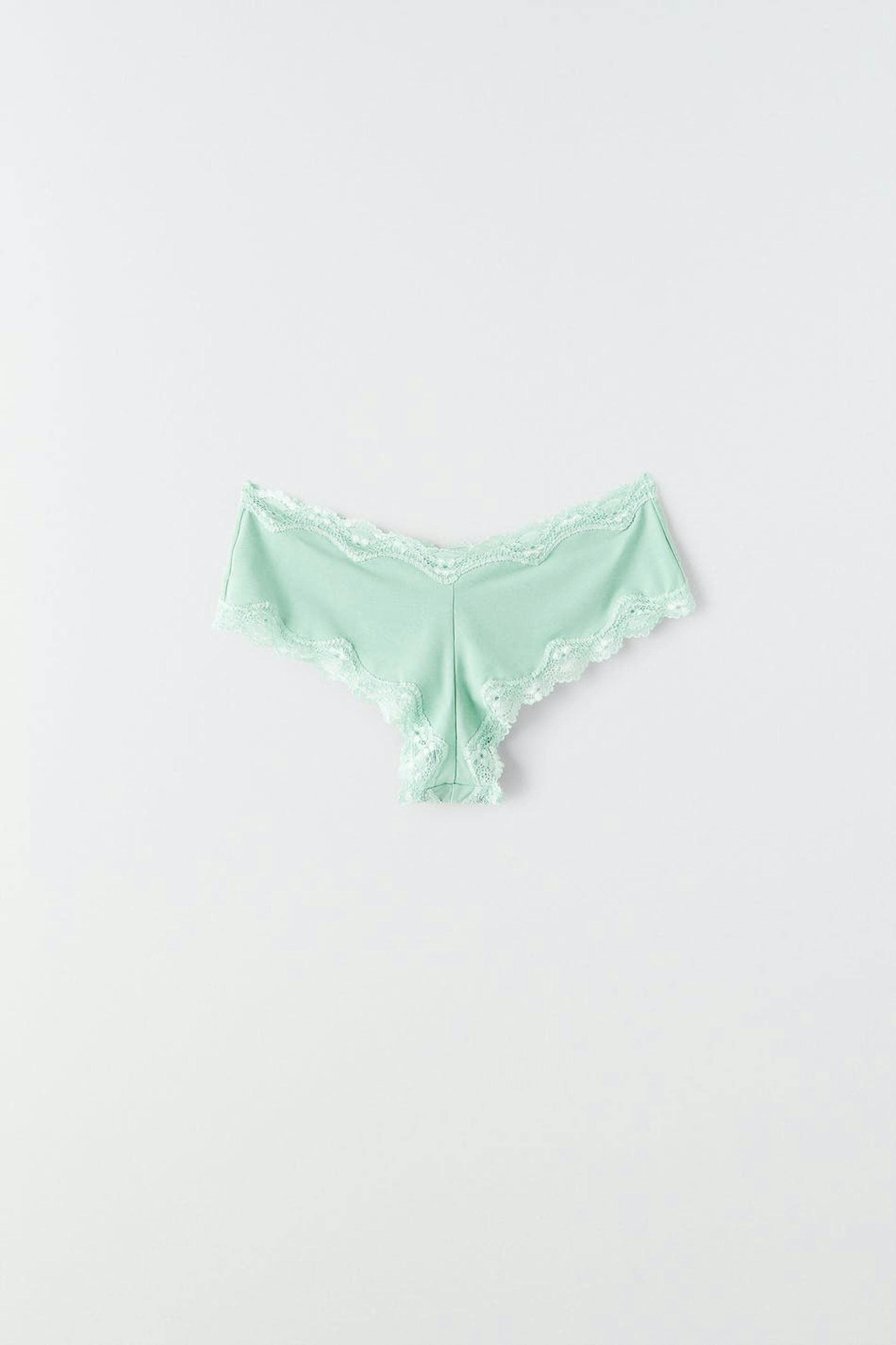 Soft Brazilian panties in microfiber with lace edges. The Brazilian panties are green and have a small bow at the front.