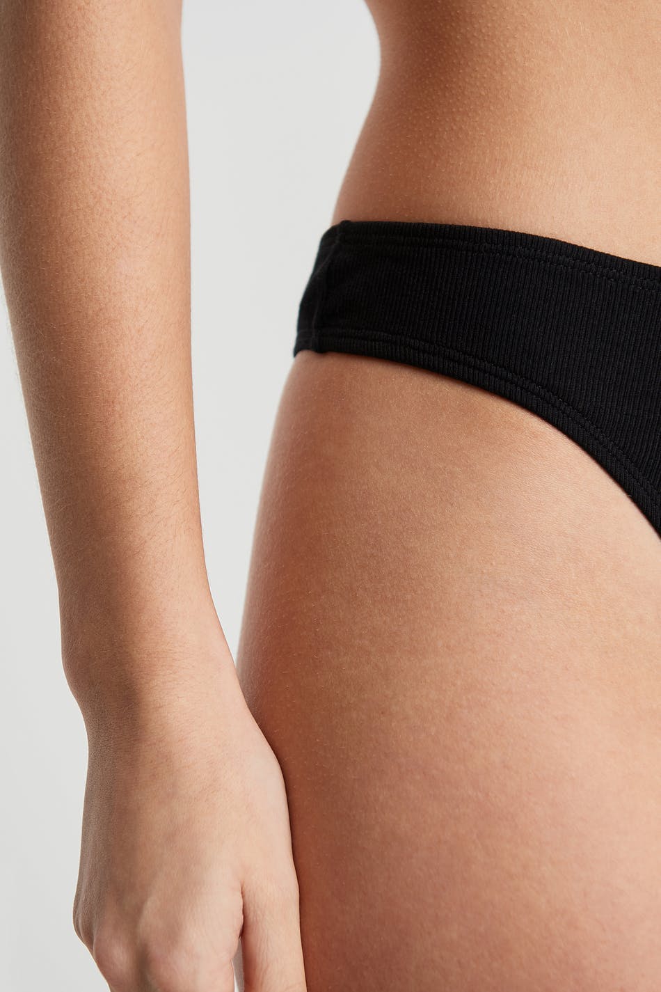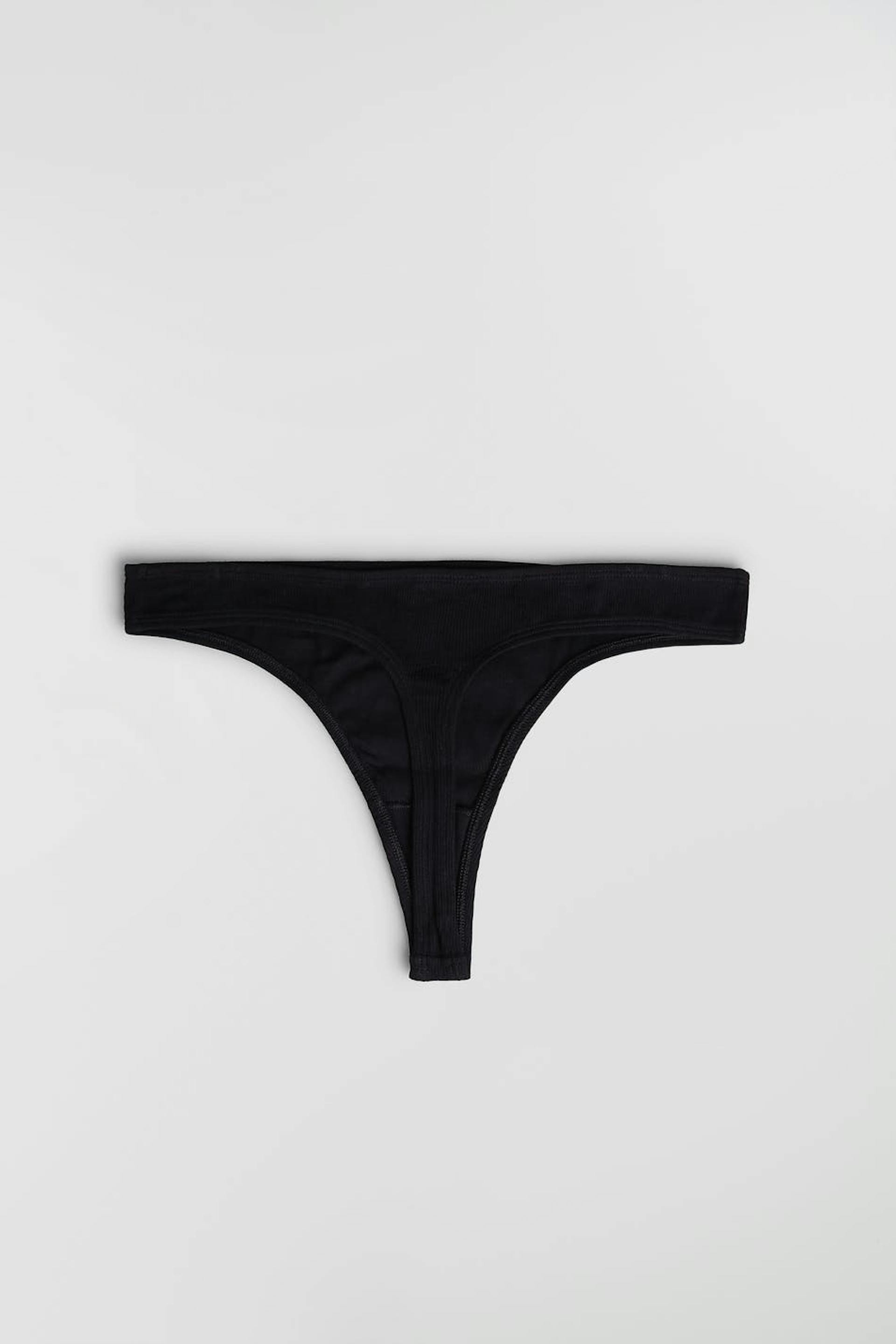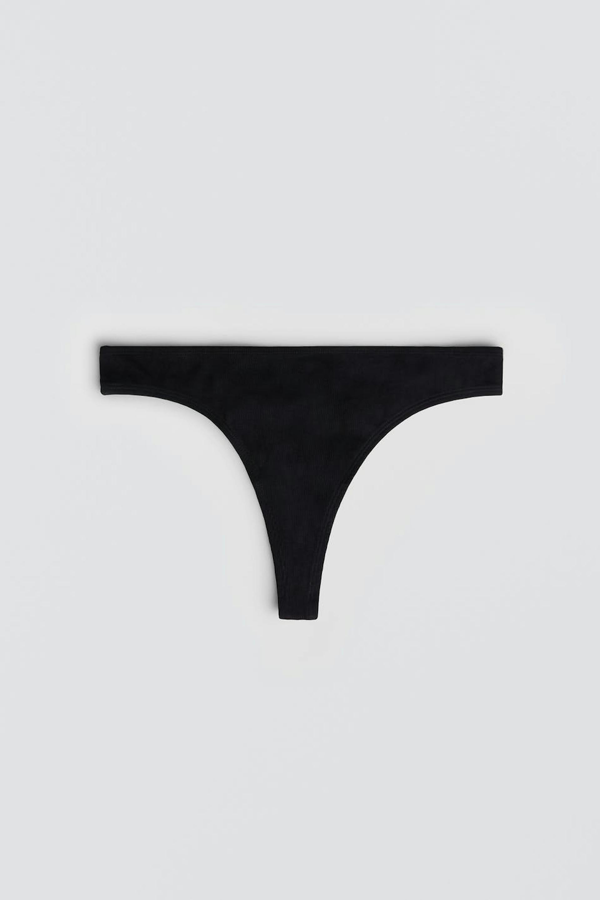 Rib-knit thong. The thong is black. It is made of cotton.