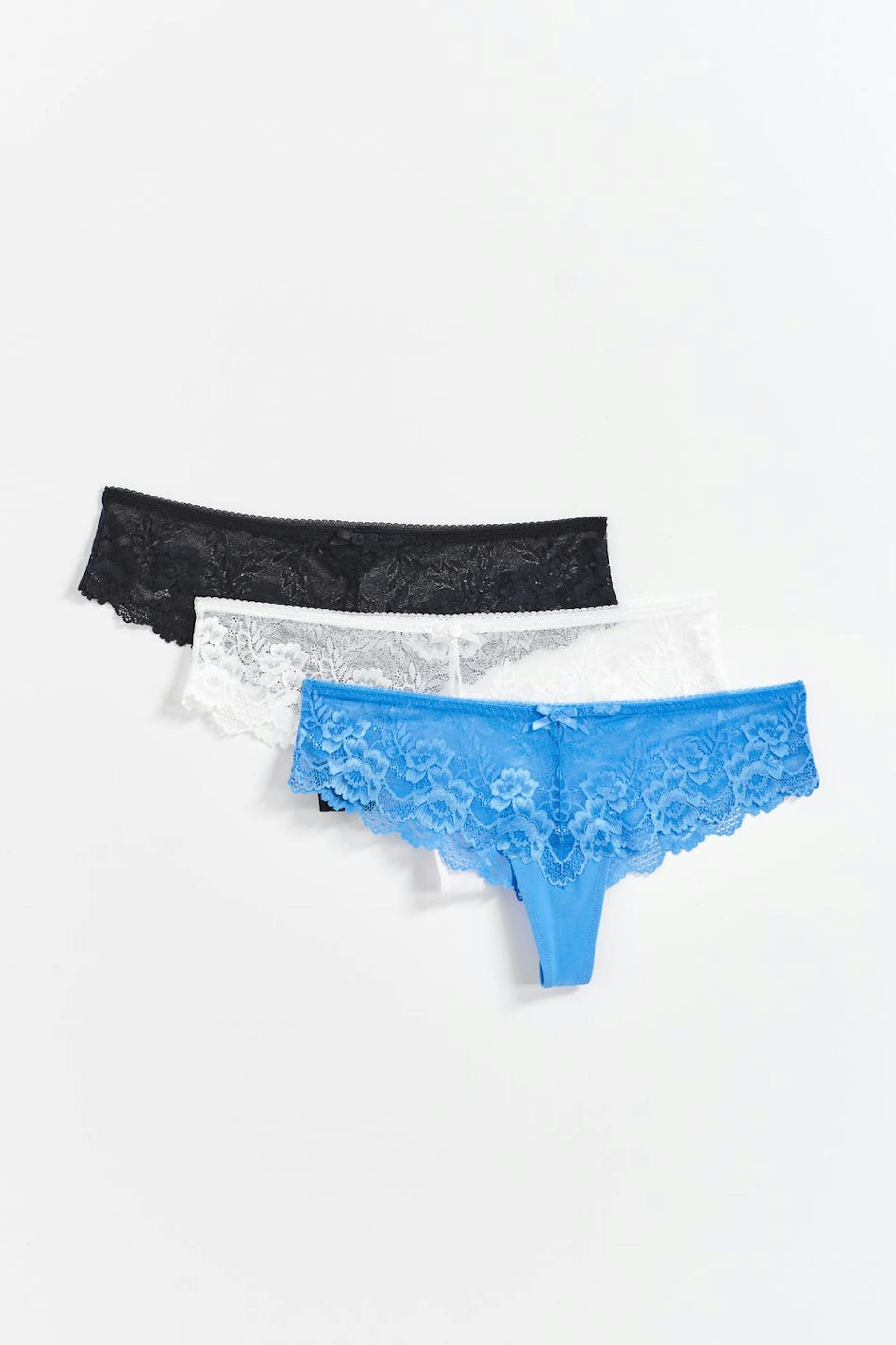 Thongs in lace with crotch lining. The thongs are blue, white and black. They have bow detail at the front.
