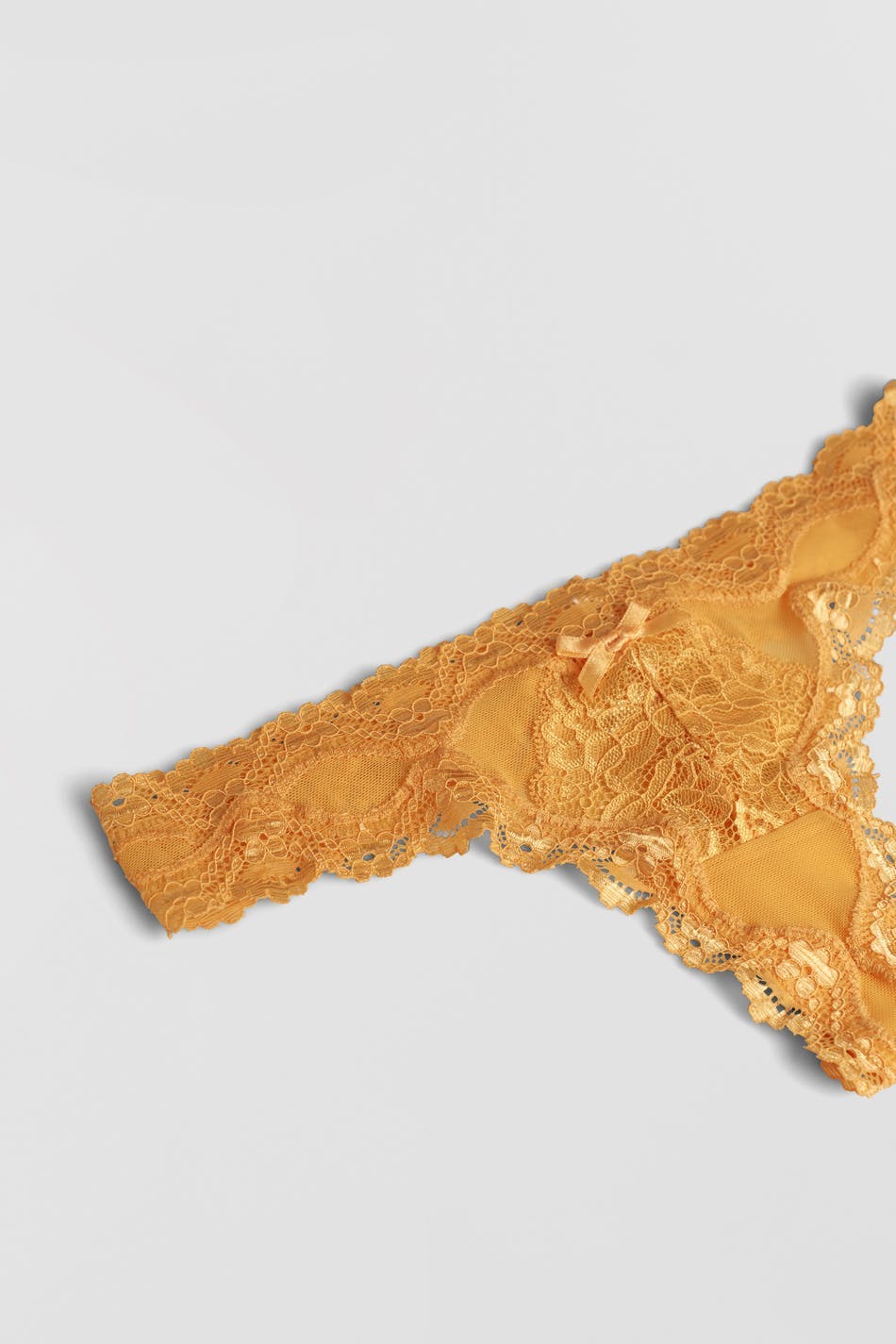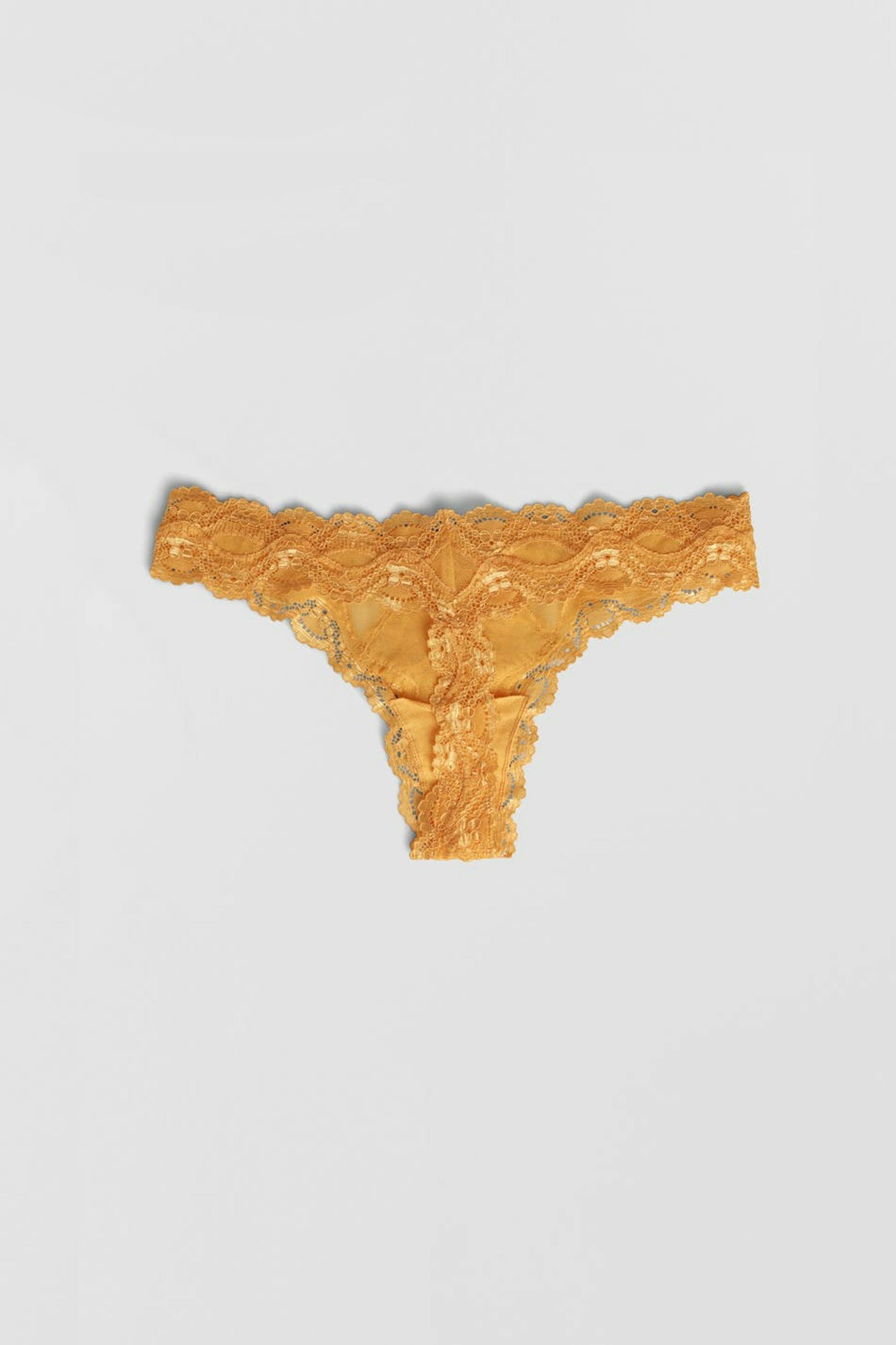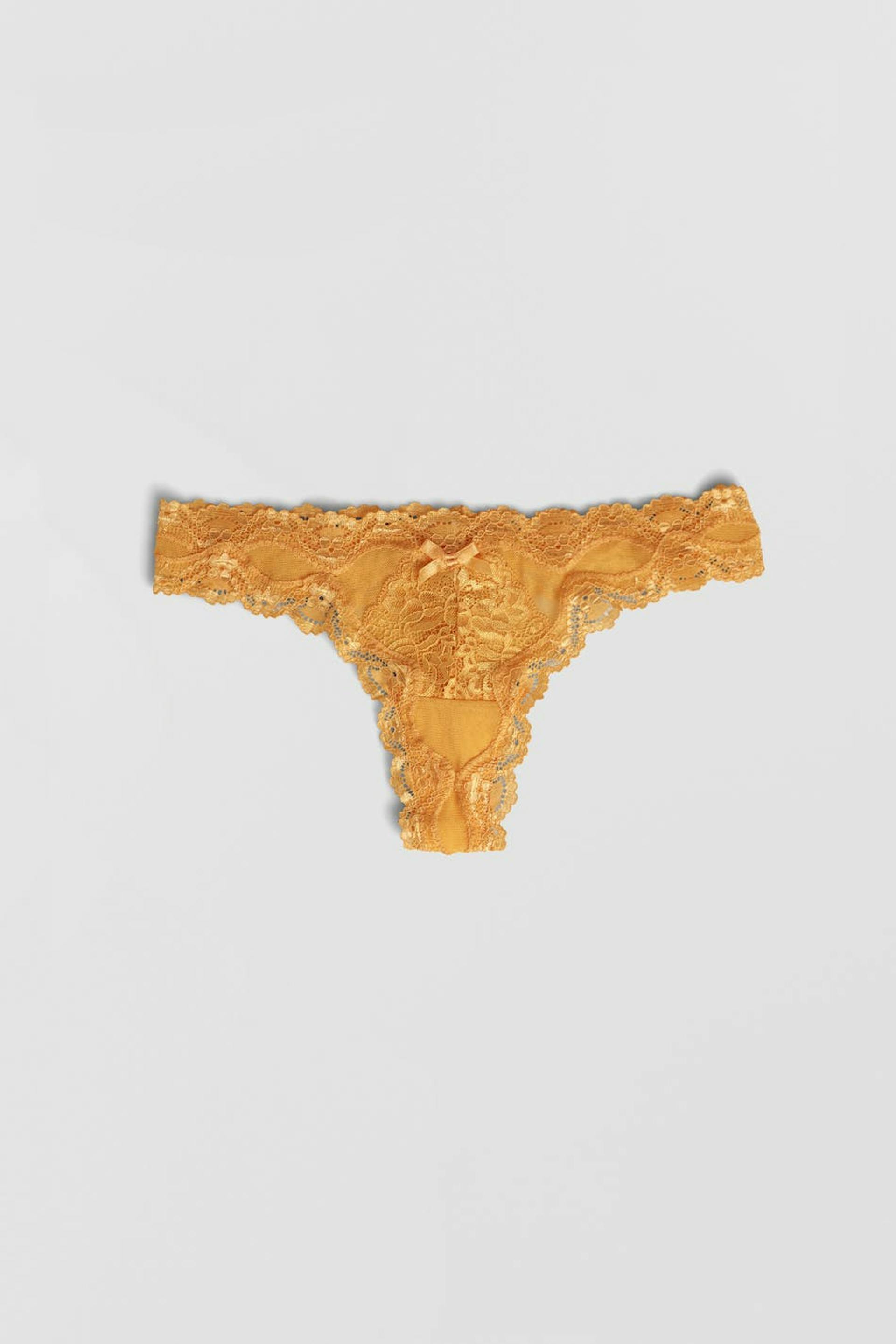Pantie with a thong design. The pantie is yellow and has lace fabric at the front and at the edge.