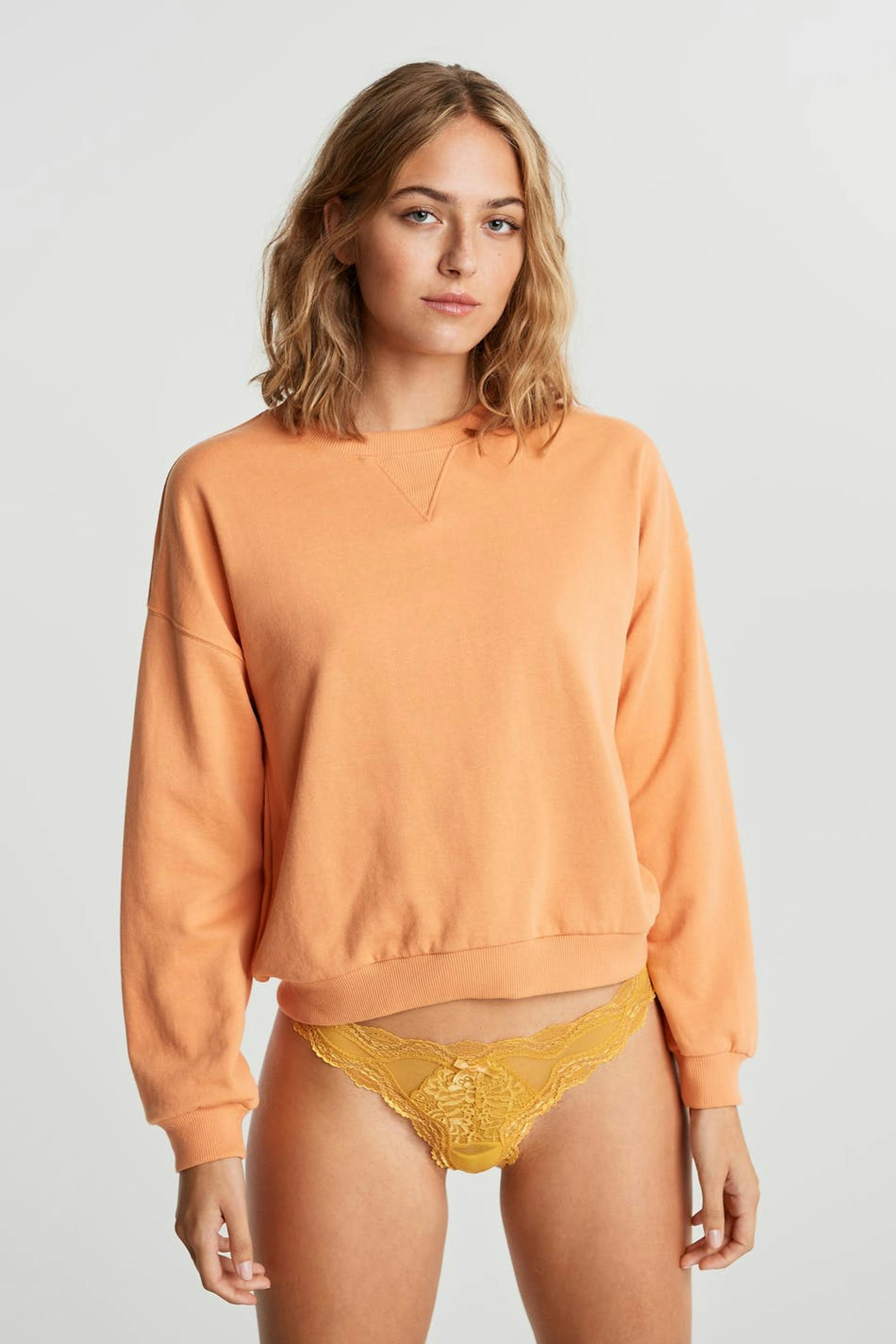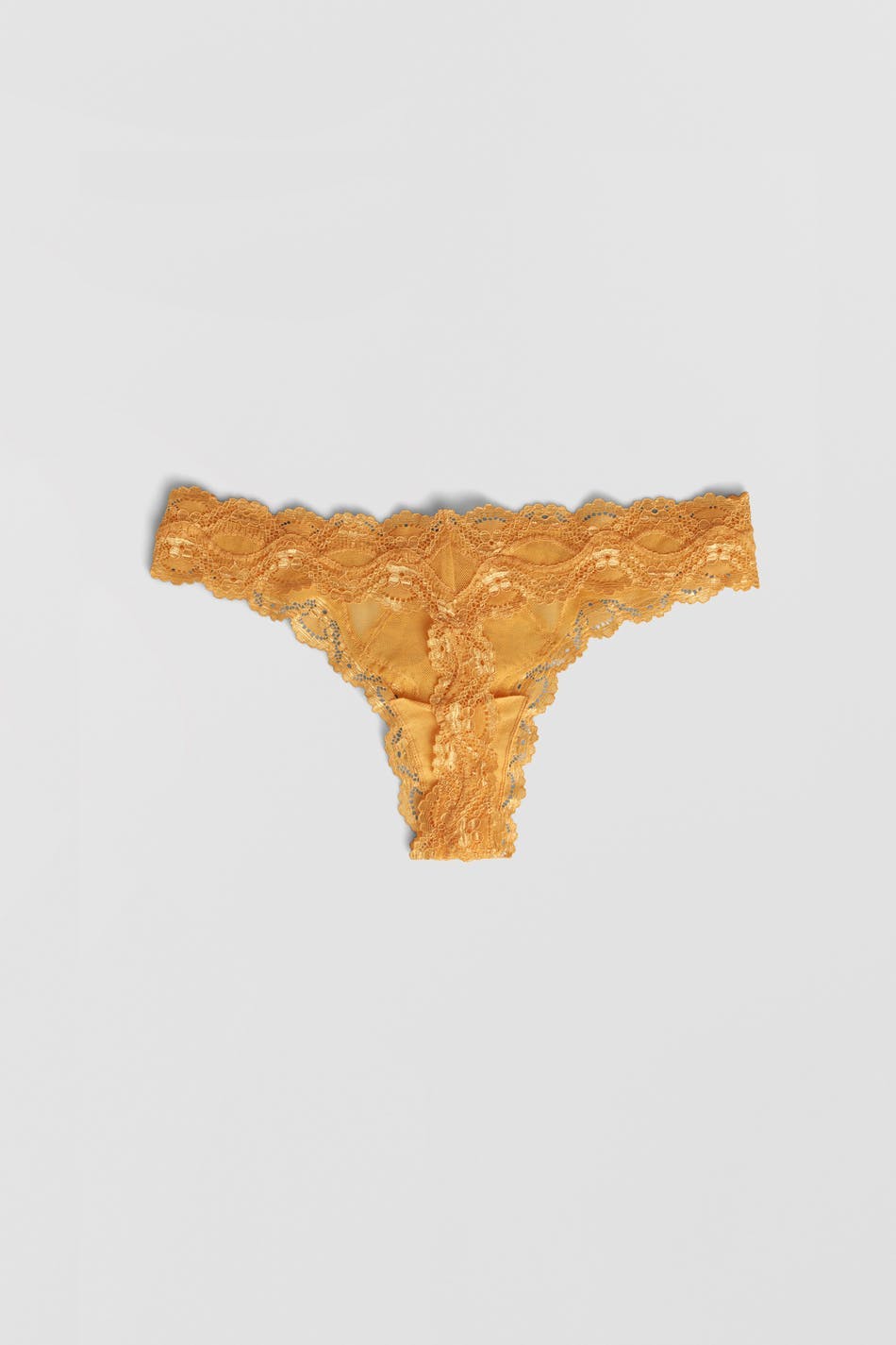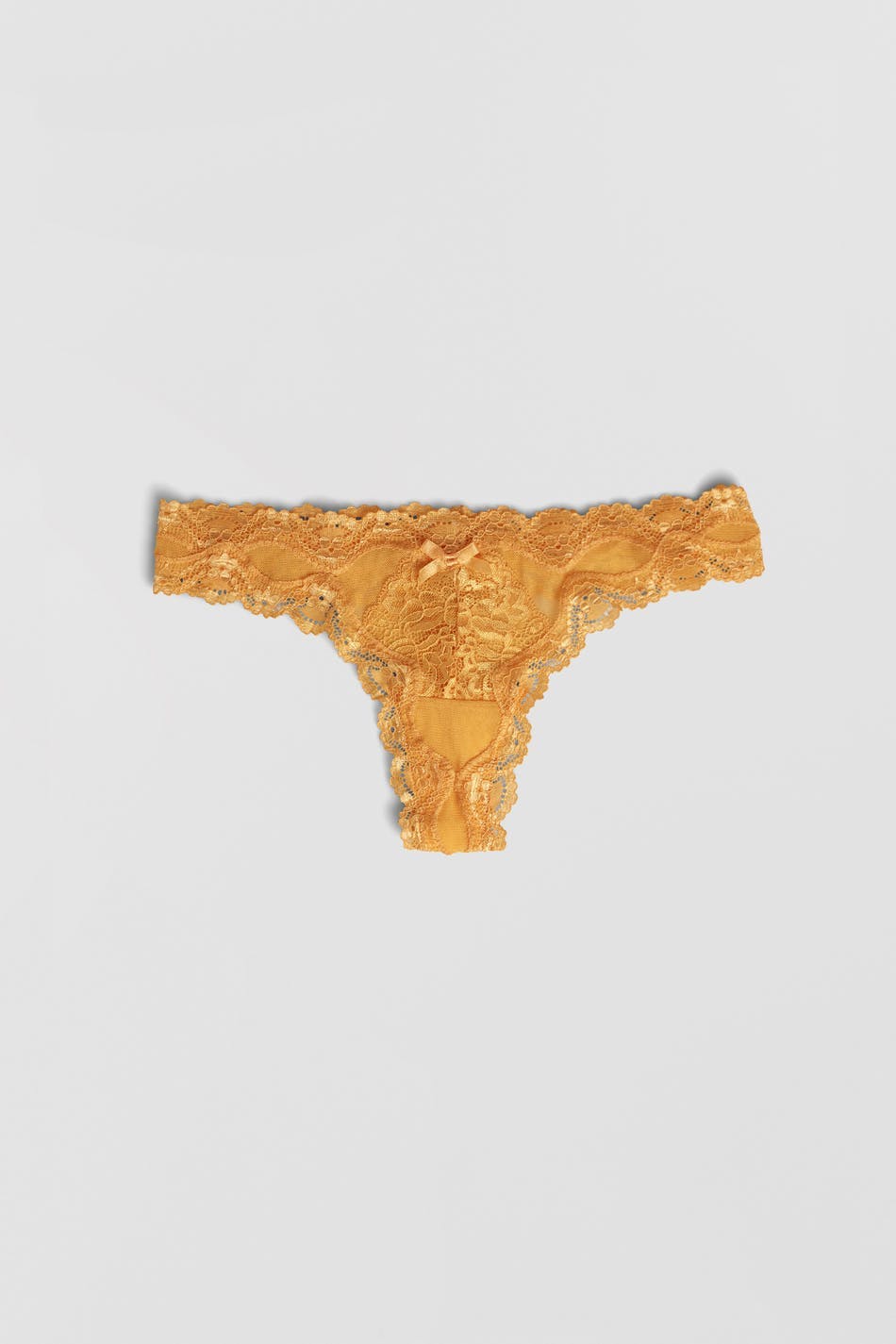 Pantie with a thong design. The pantie is yellow and has lace fabric at the front and at the edge.