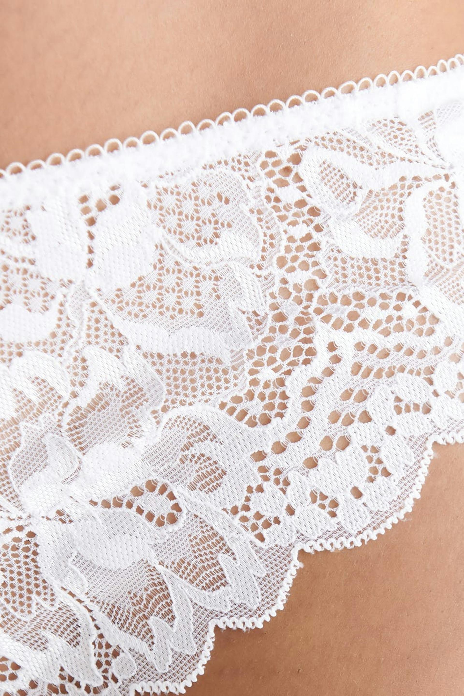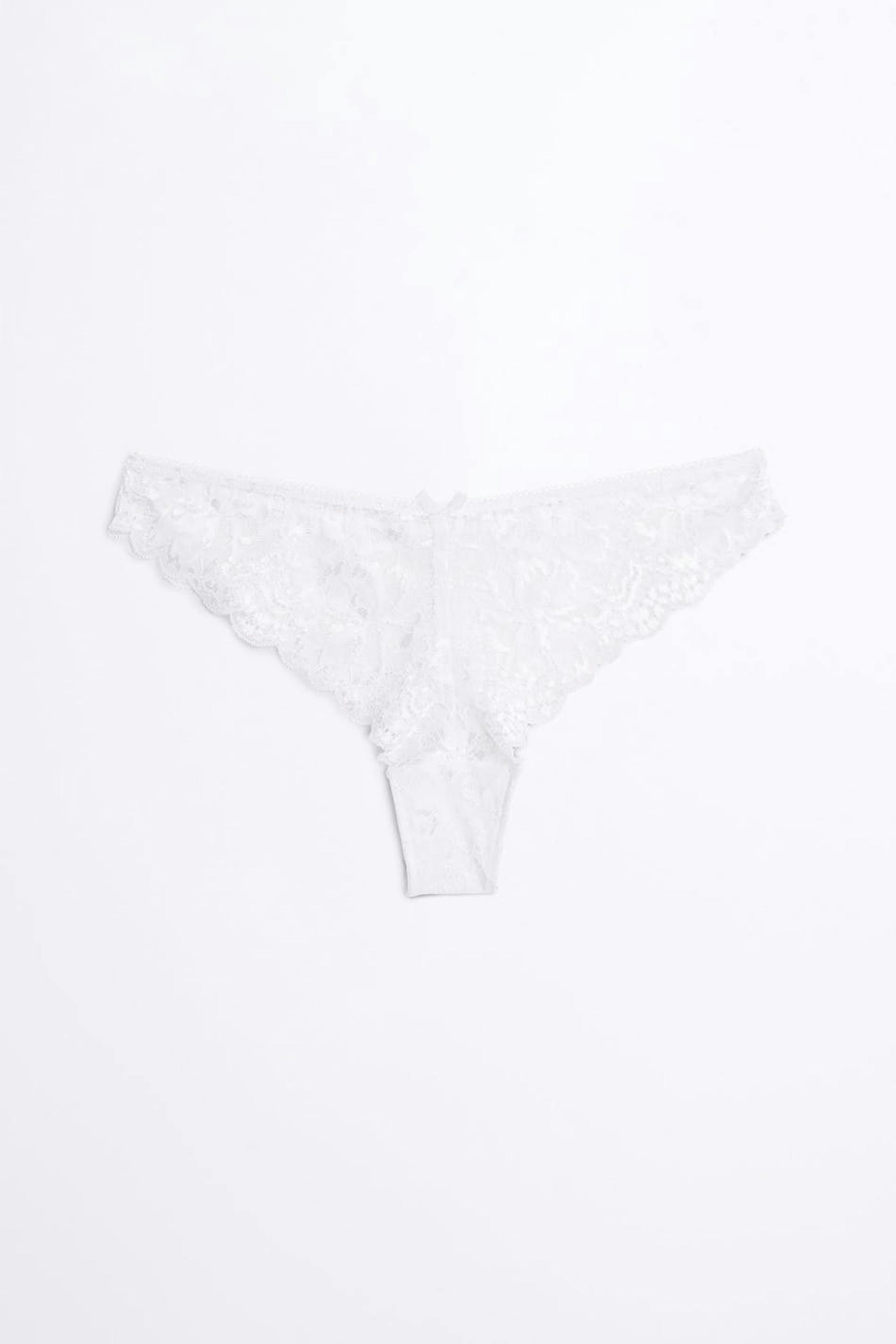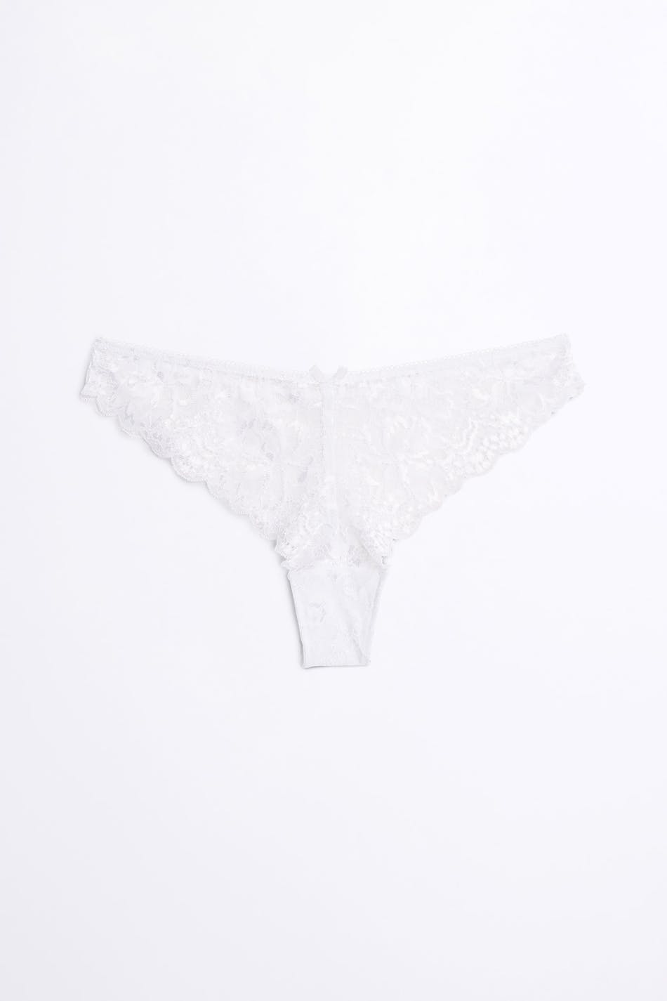 Brazilian pantie with an elastic band at the waist. The pantie is white and has a lining in cotton between the legs. It is made of lace.