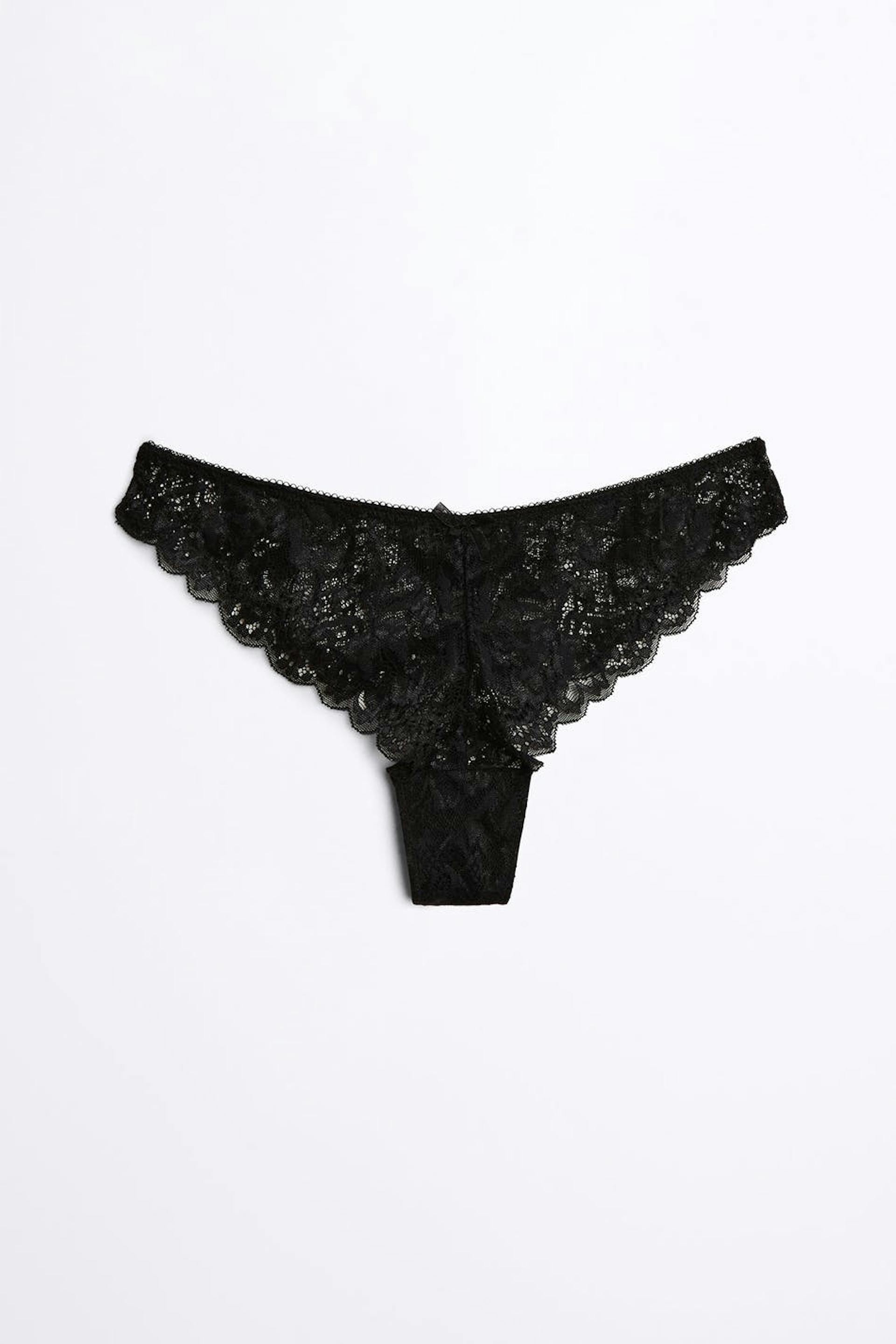 Brazilian pantie with an elastic band at the waist. The pantie is black and has a lining in cotton between the legs. It is made of lace.