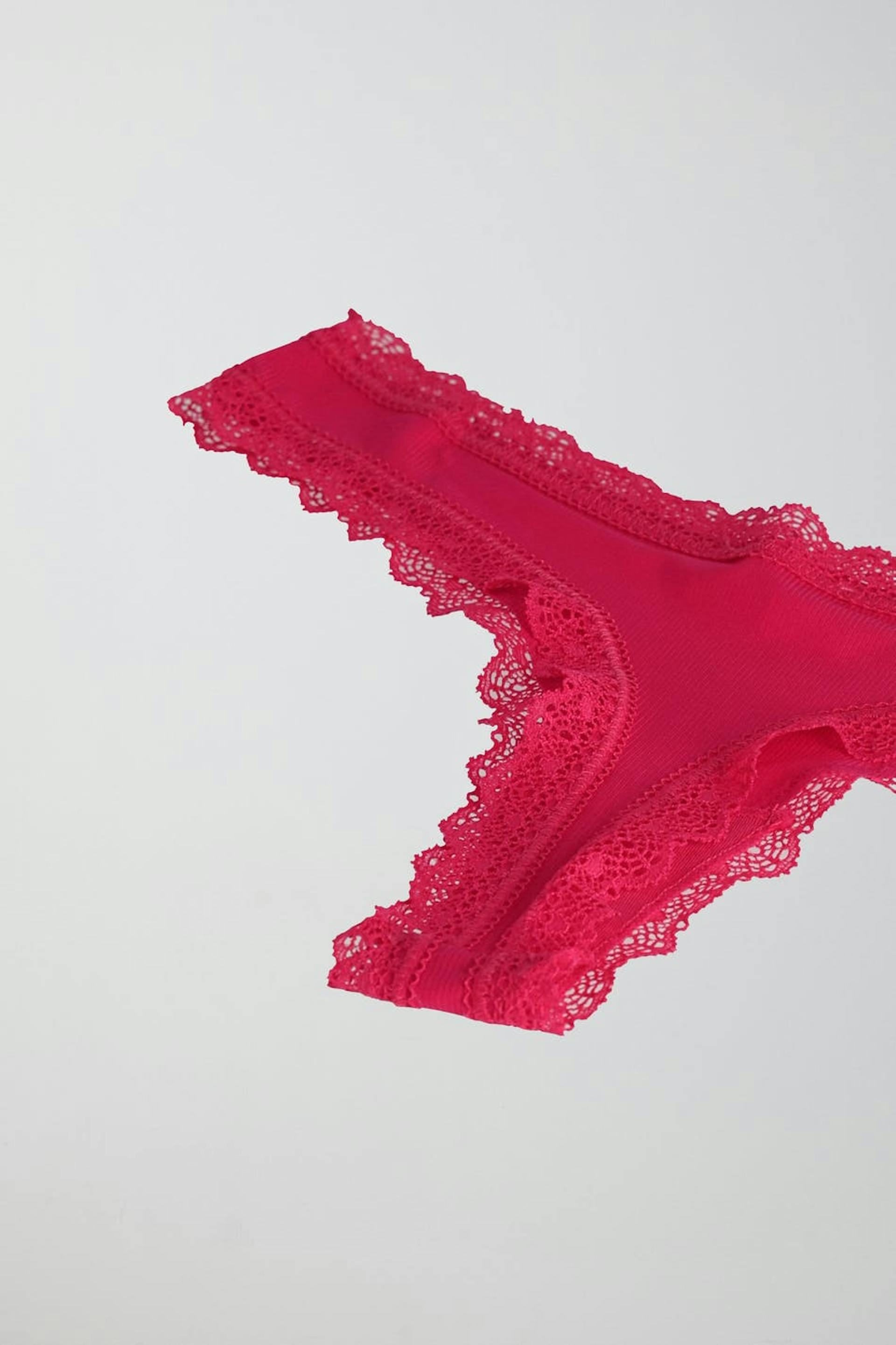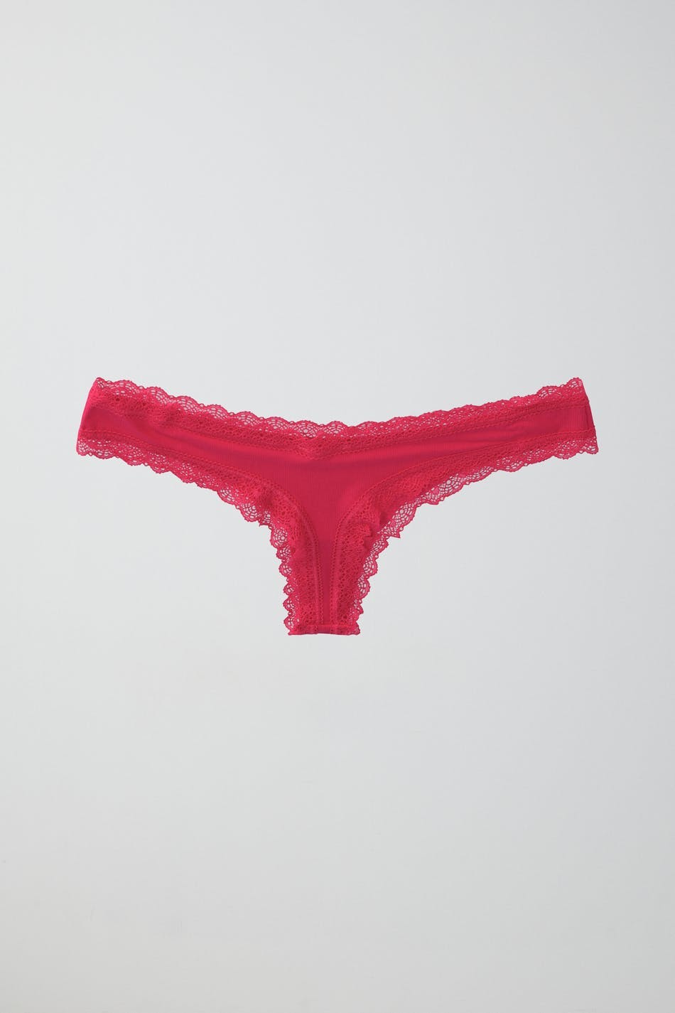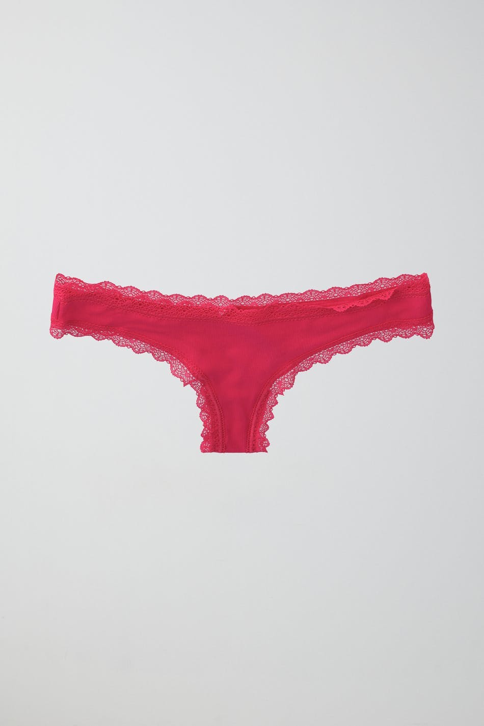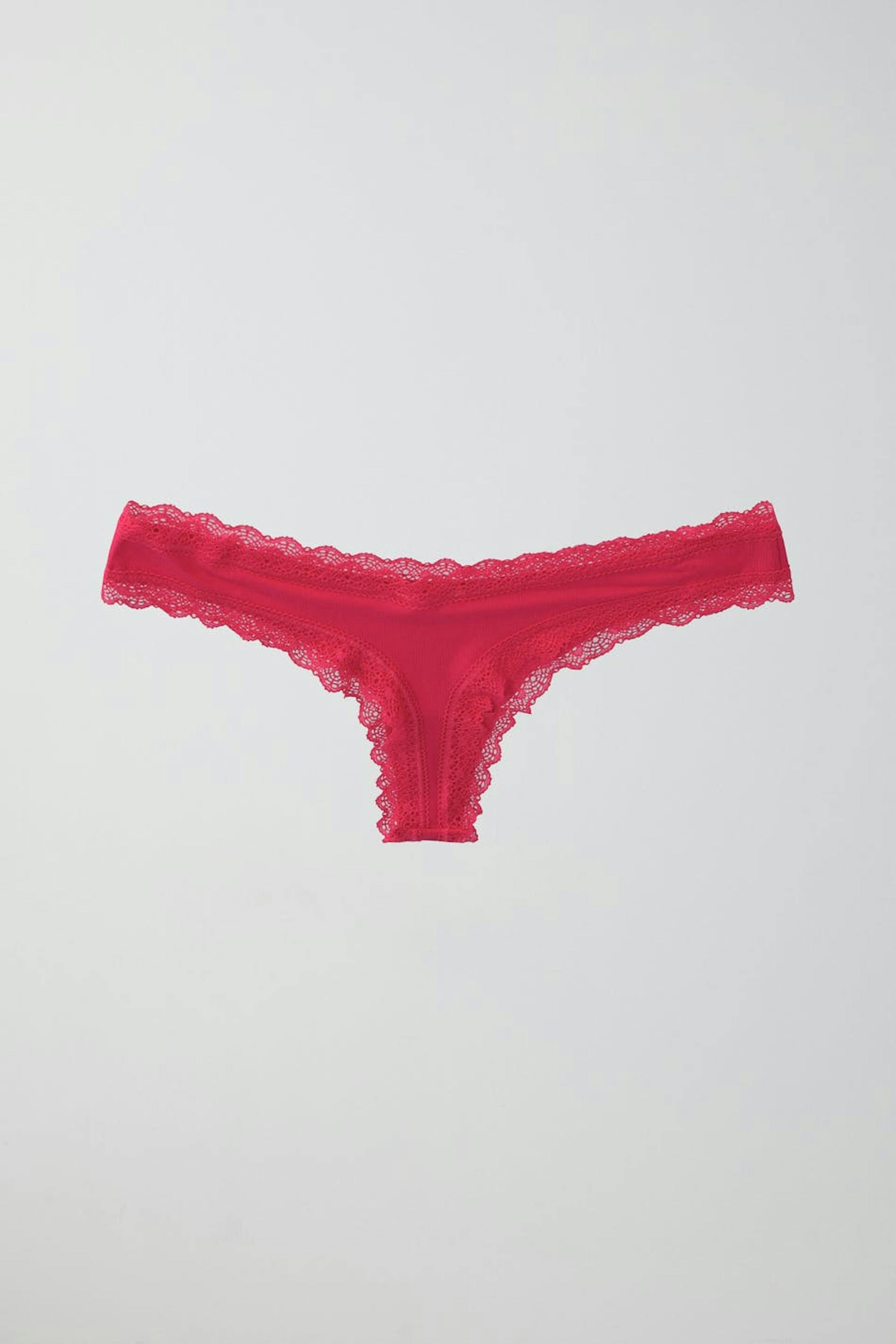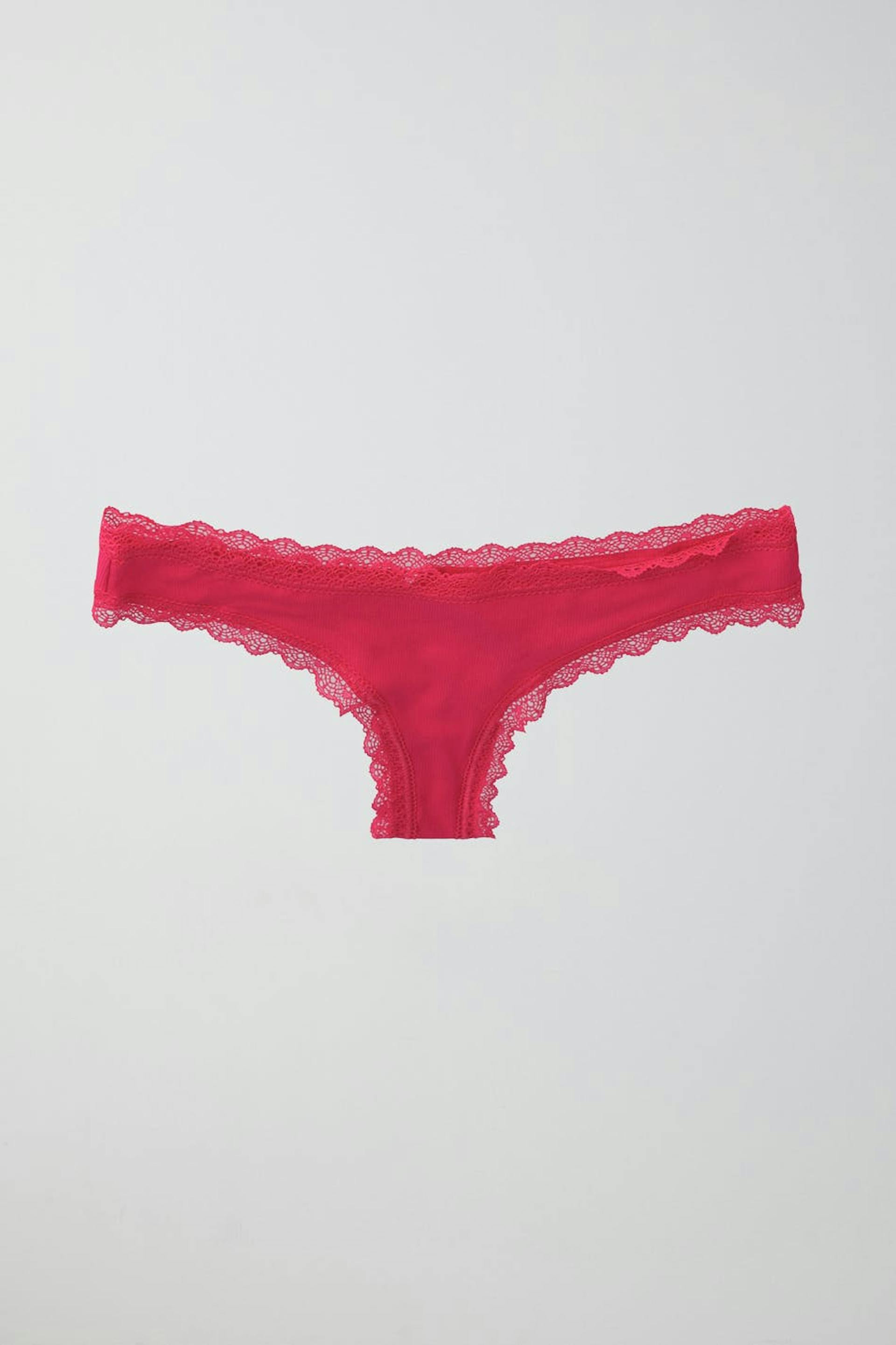 Ribbed thongs with lace edges. The thongs are pink and have a lined crotch in cotton.