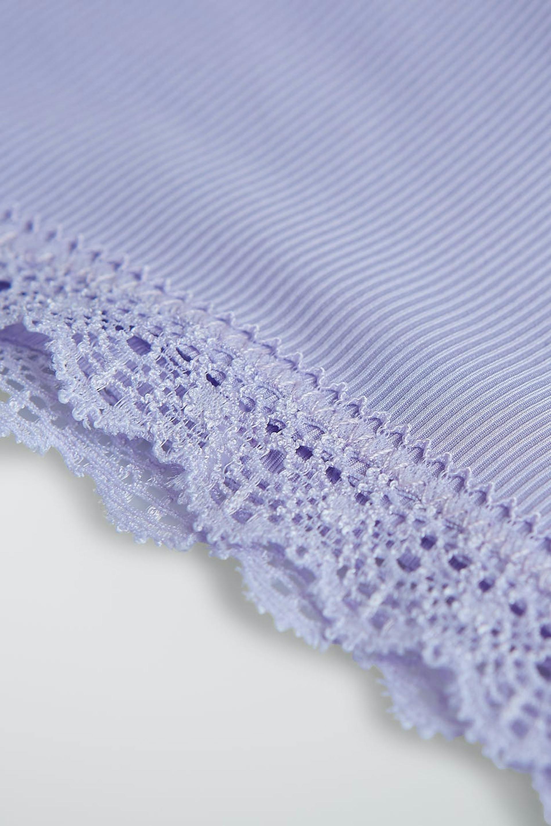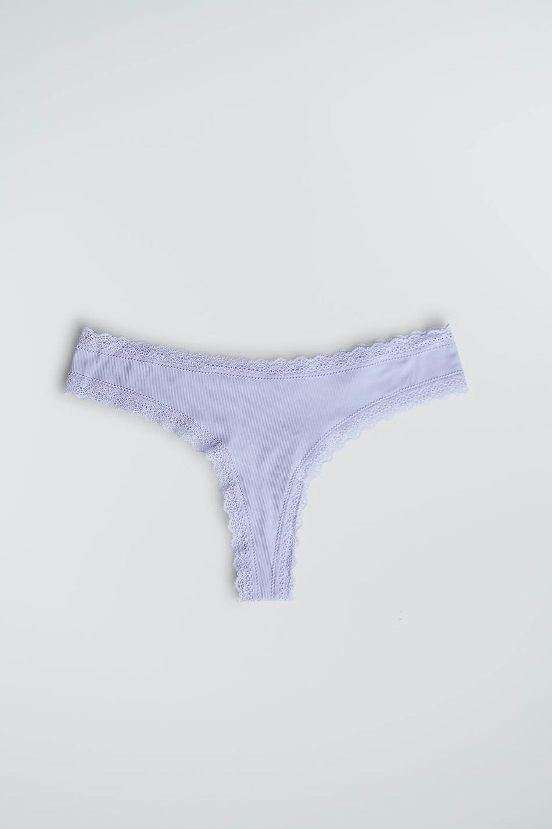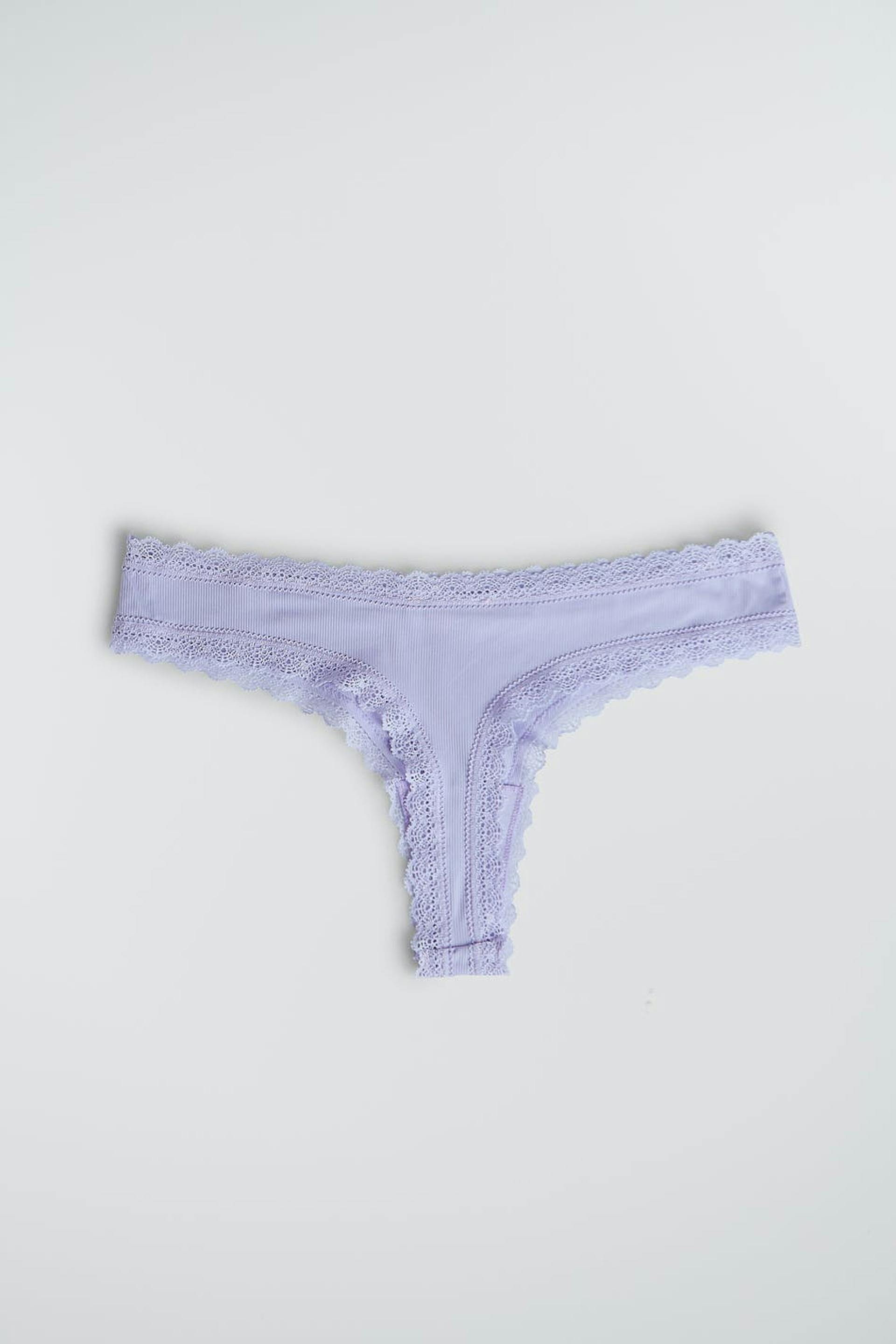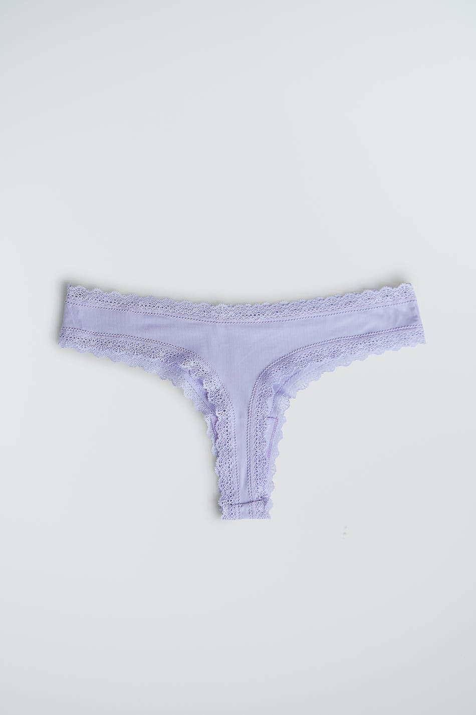 Rib-knit thong with edges in lace. The thong is purple and soft.