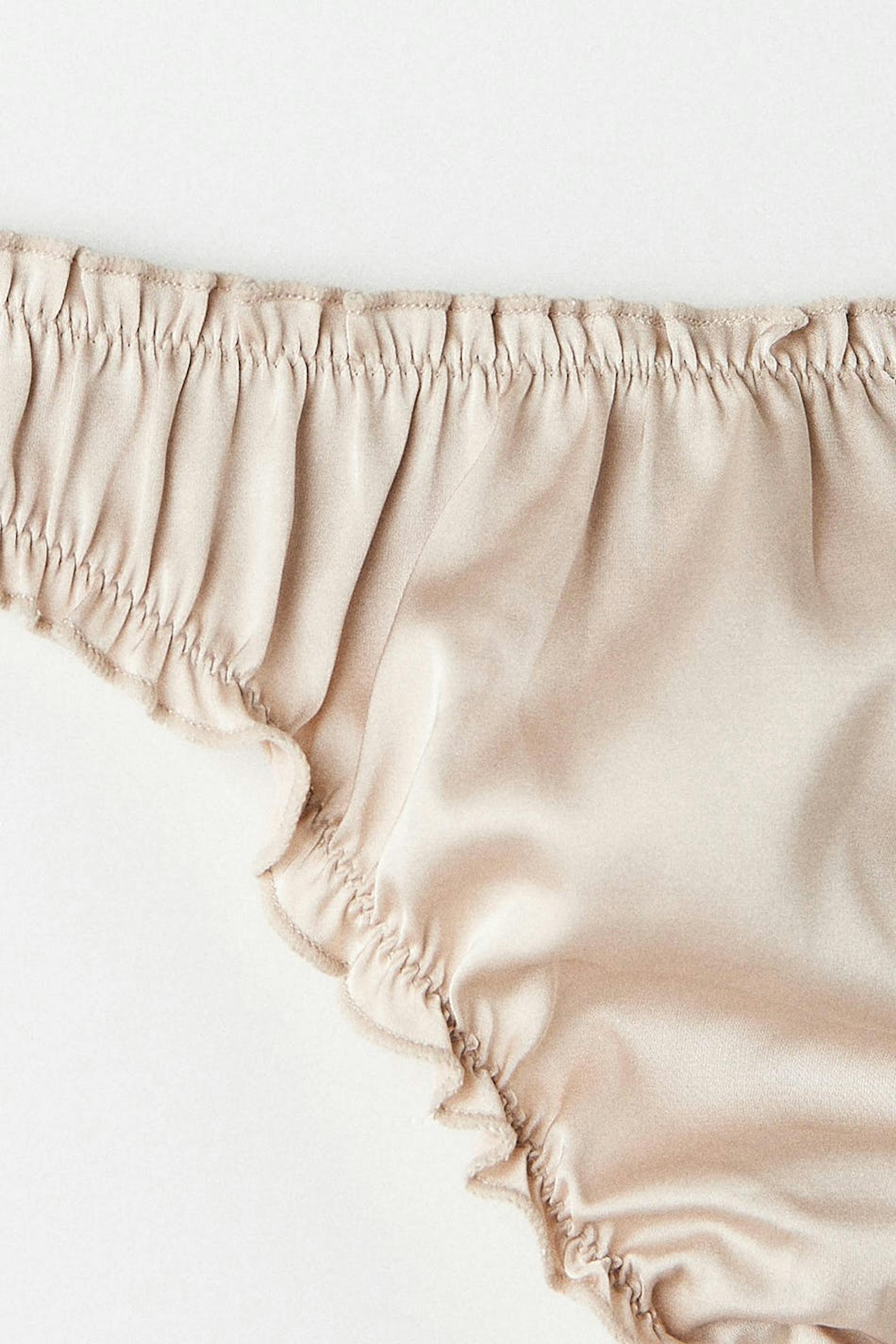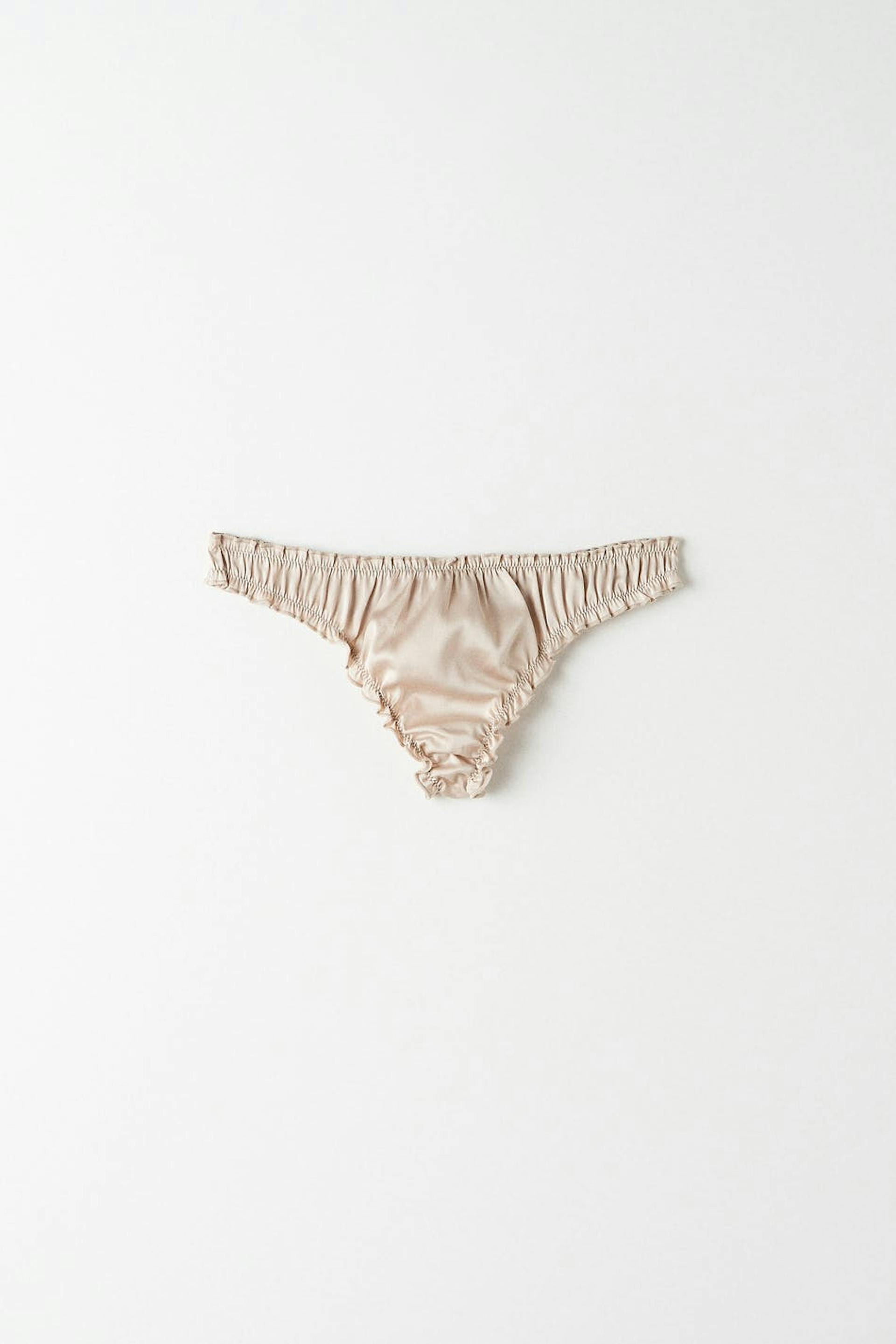 Satin thongs with ruffled edges. The thongs are champagne colour and have a lined crotch in cotton.