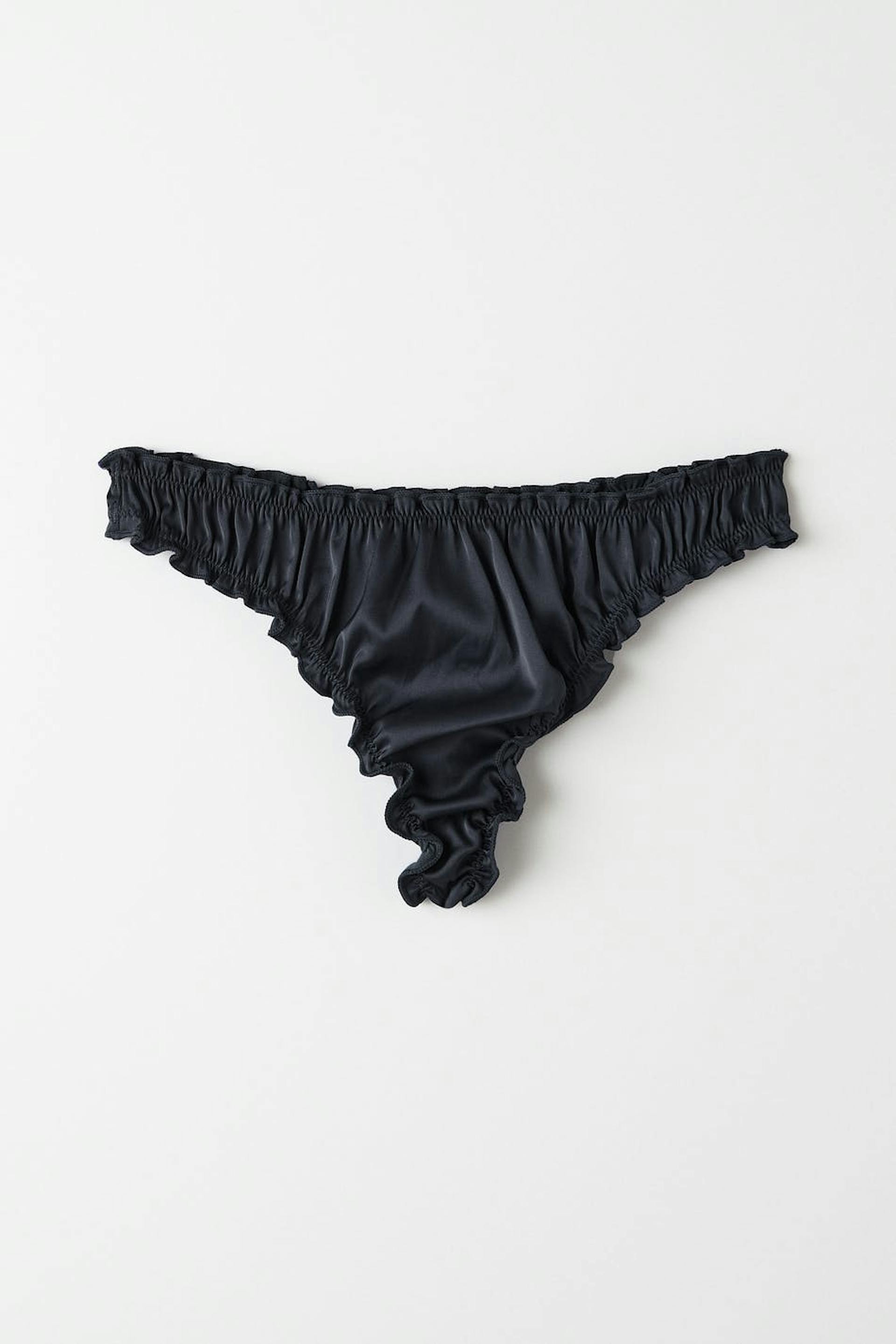 Thongs in satin with ruffled edges. The thongs are black and have a lined crotch in cotton.