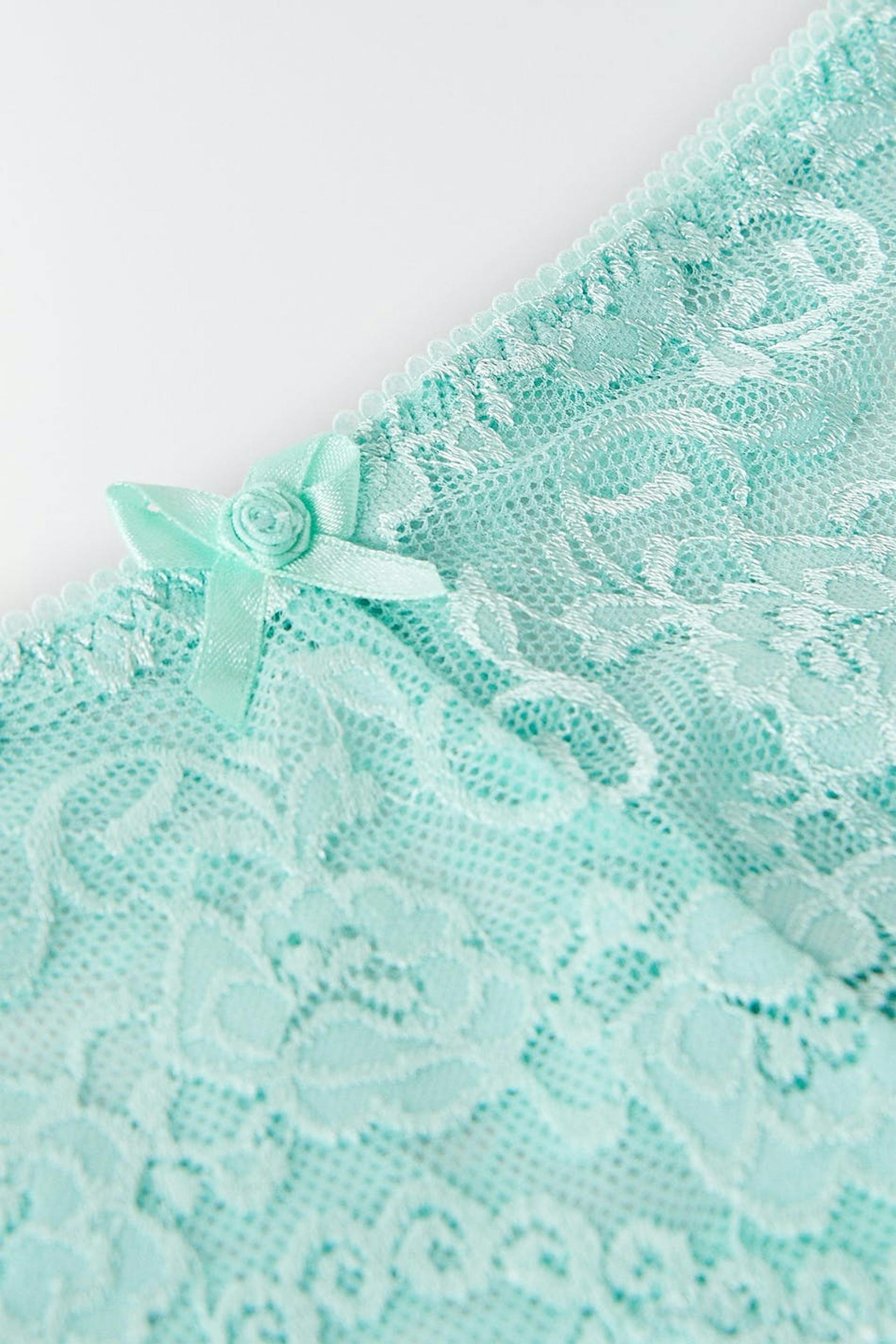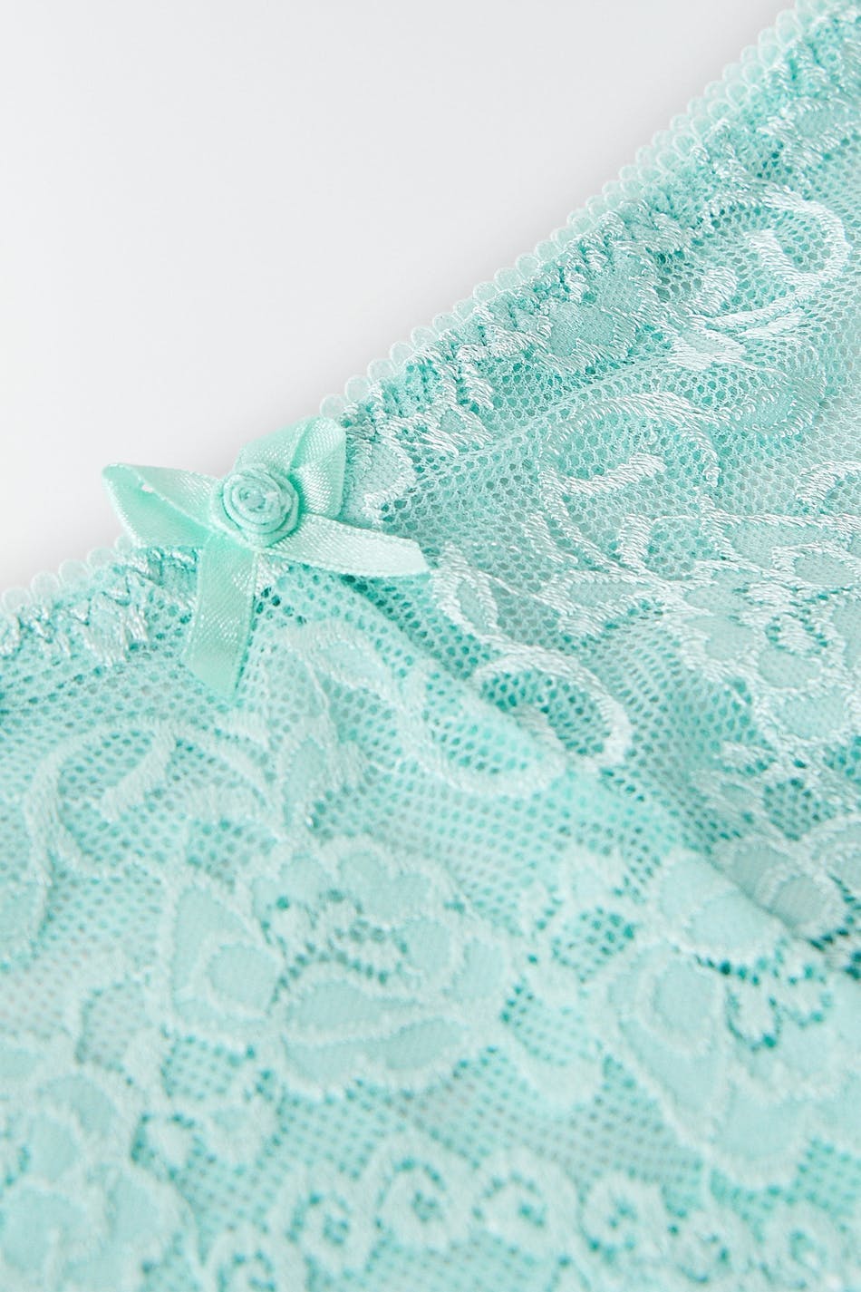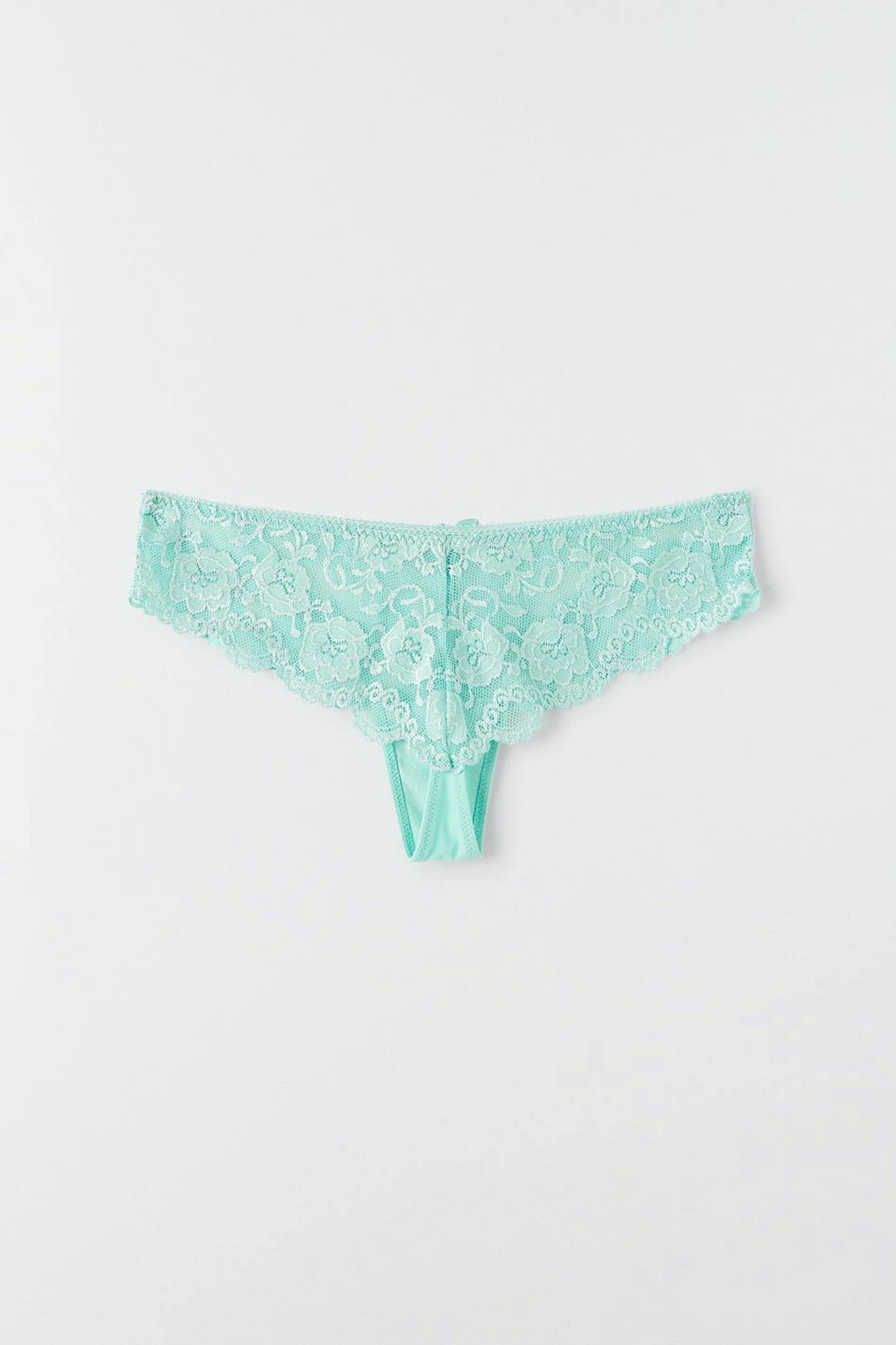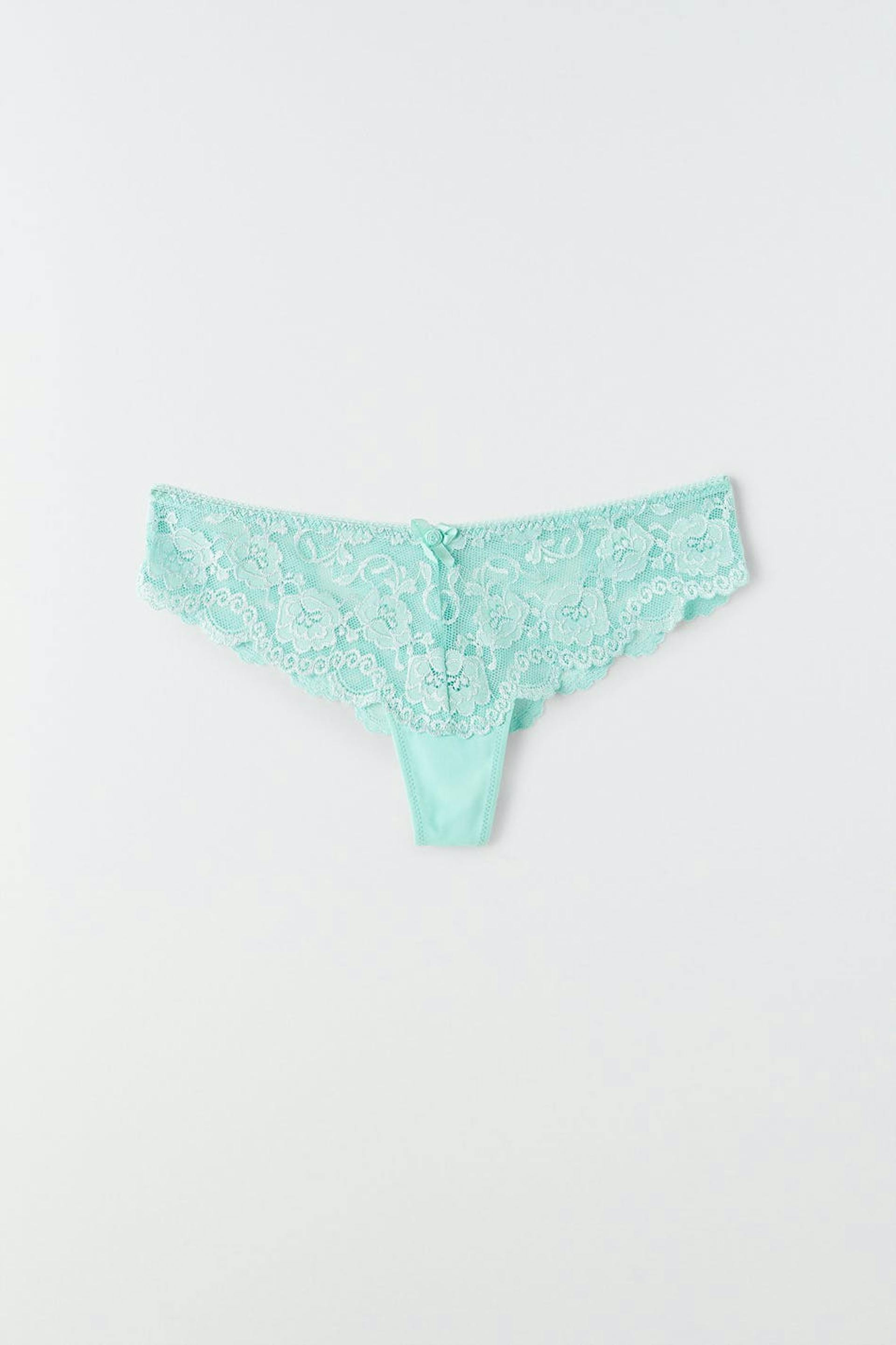 Lace thongs with lined crotch. The thongs are blue and have a bow detail at the front.