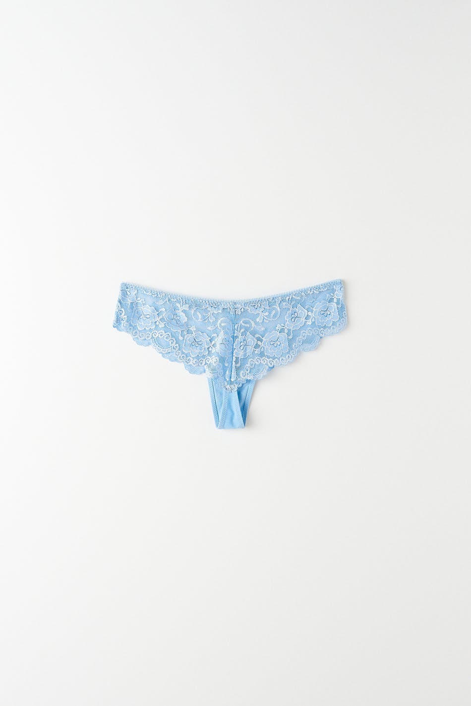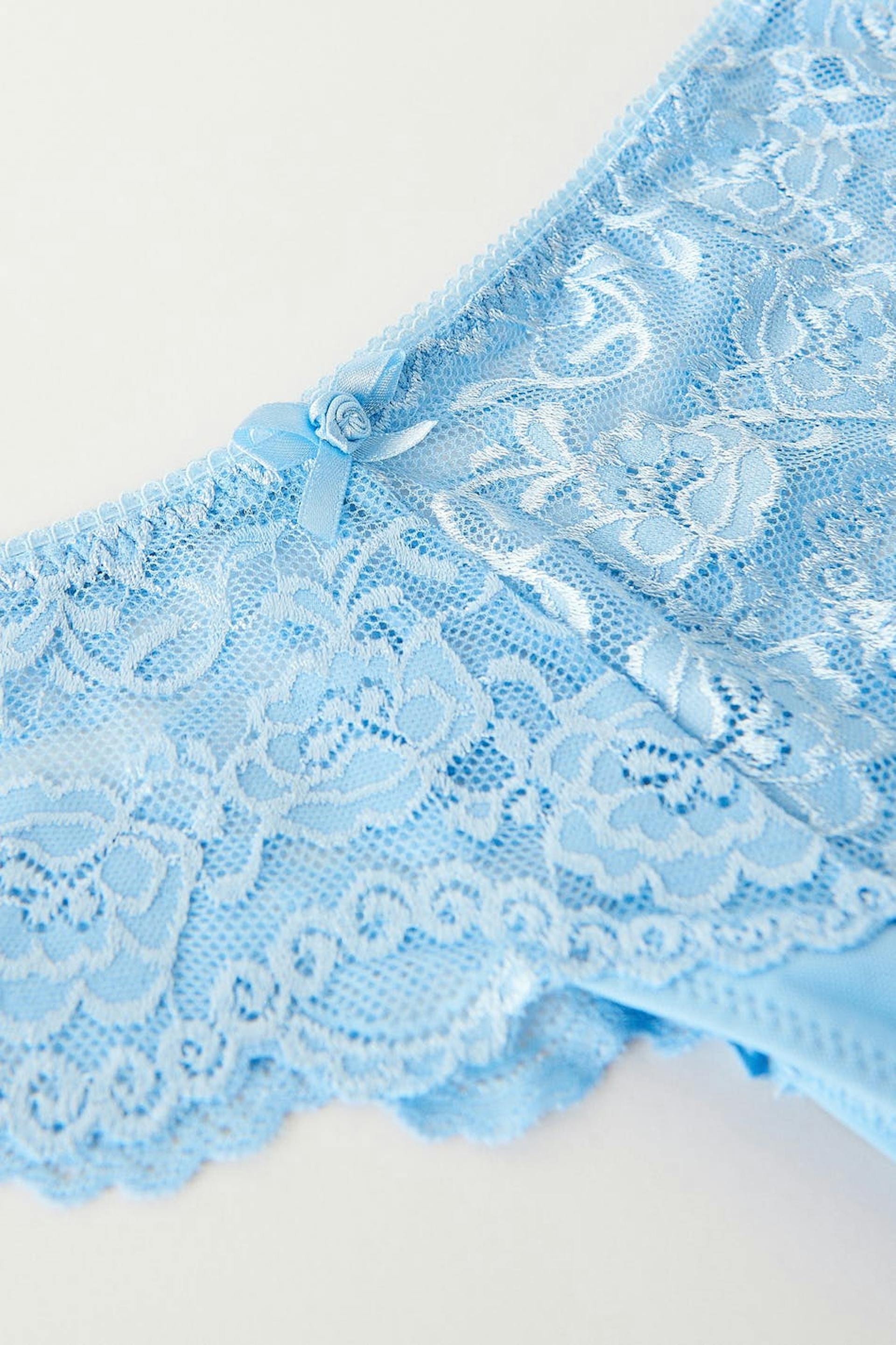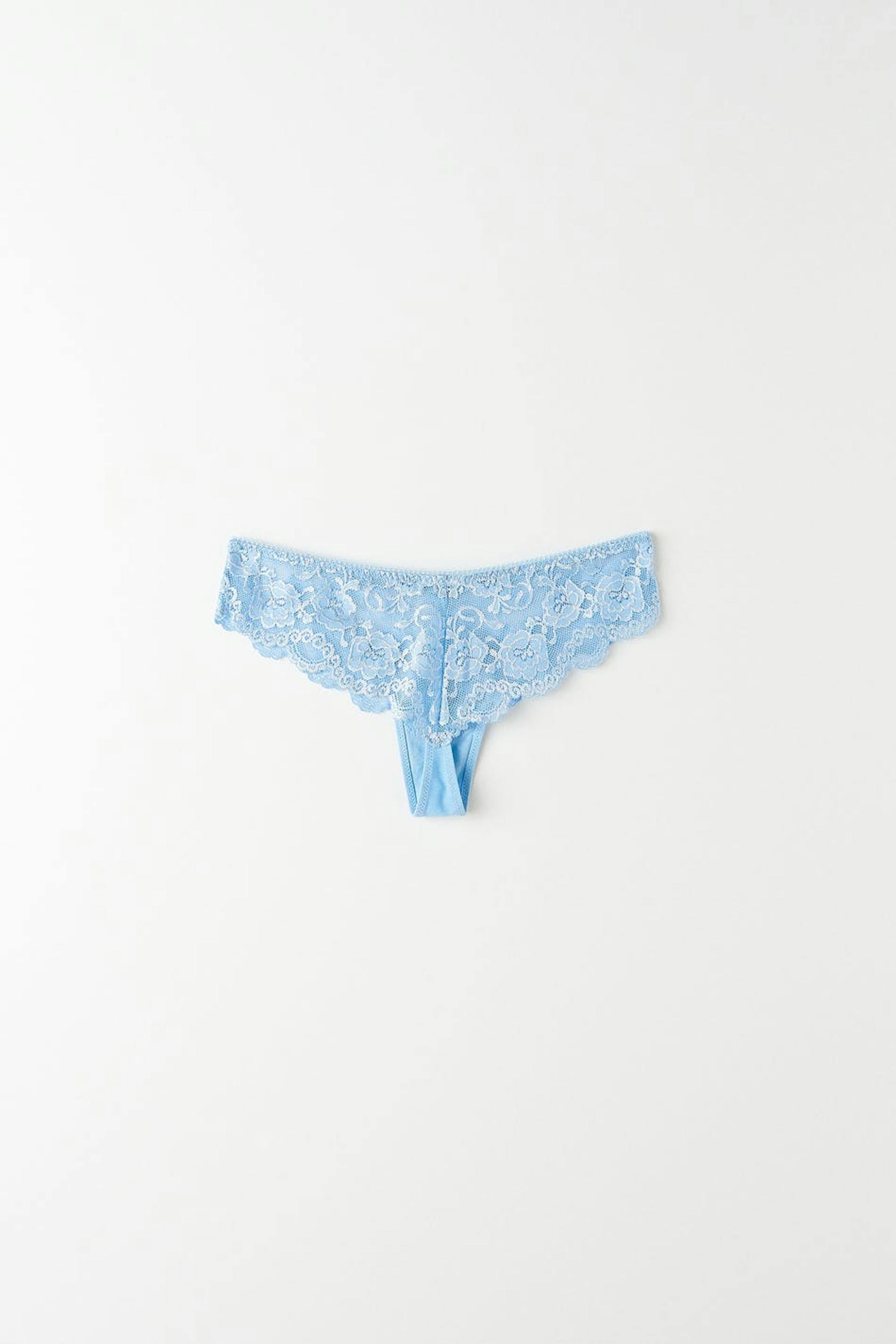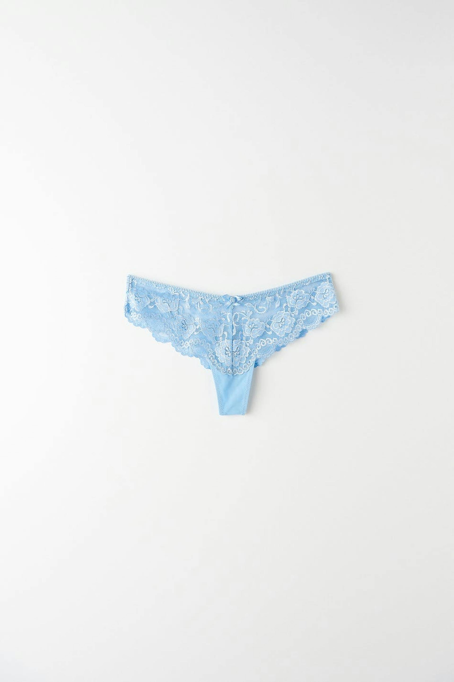 Lace thongs with lined crotch. The thongs are blue and have a bow detail at the front.