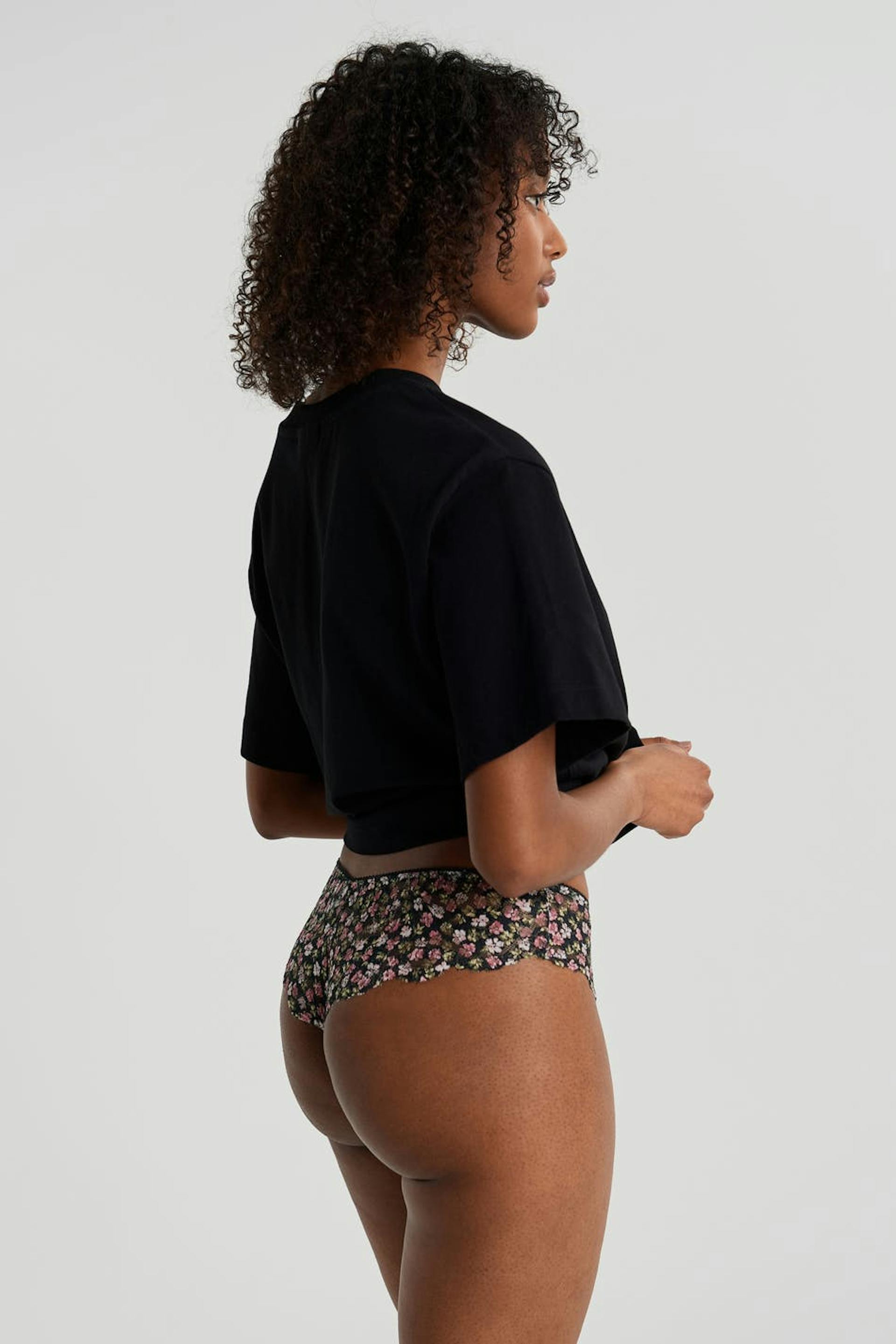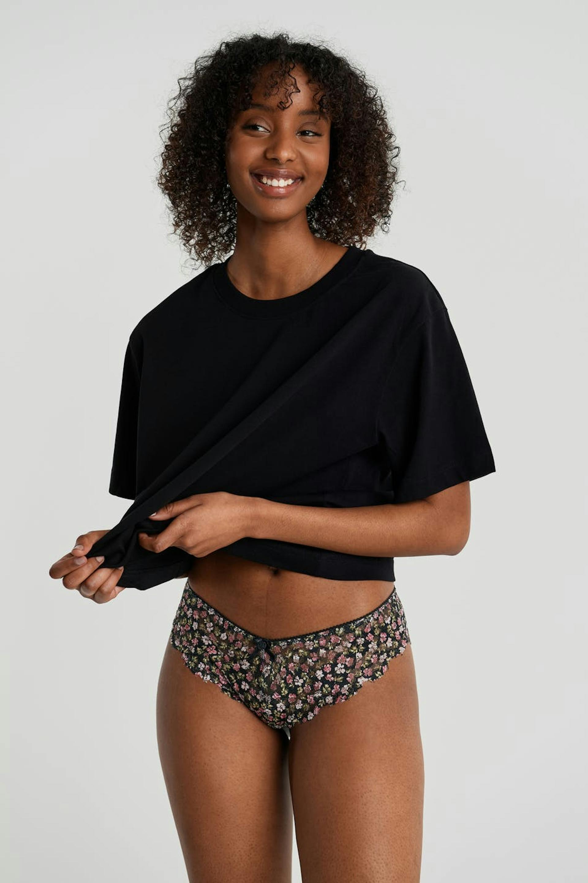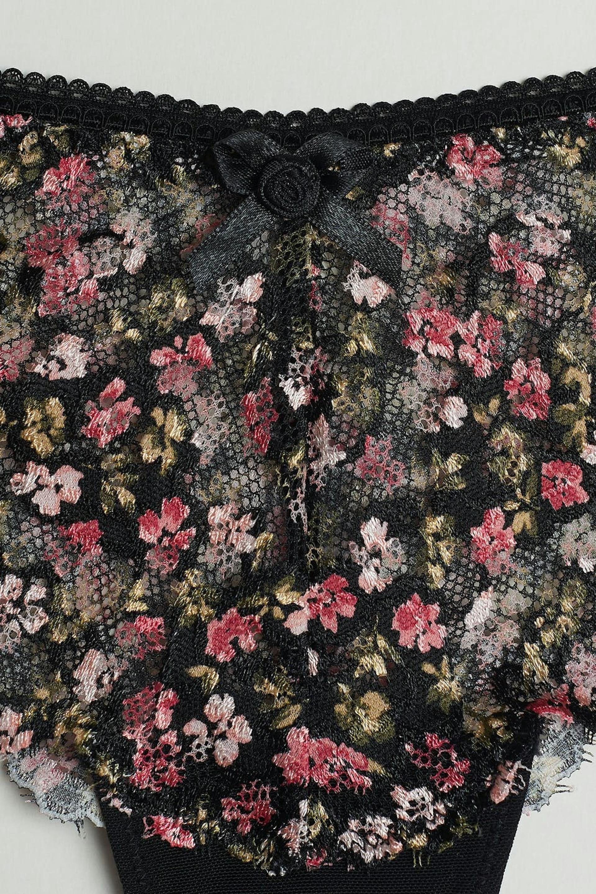 Floral panties with a lining in cotton at the crotch. The panties are black. They are made of lace.
