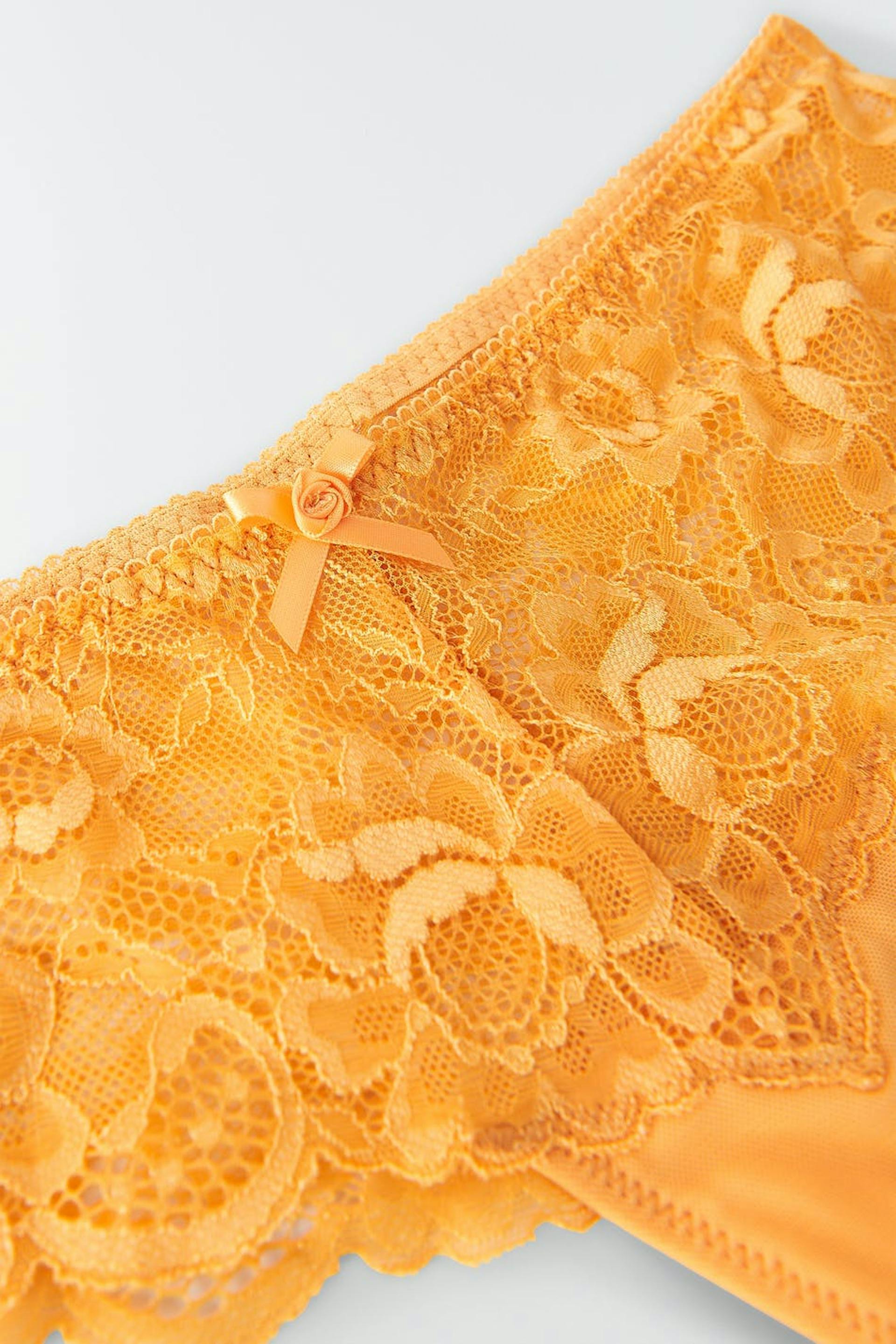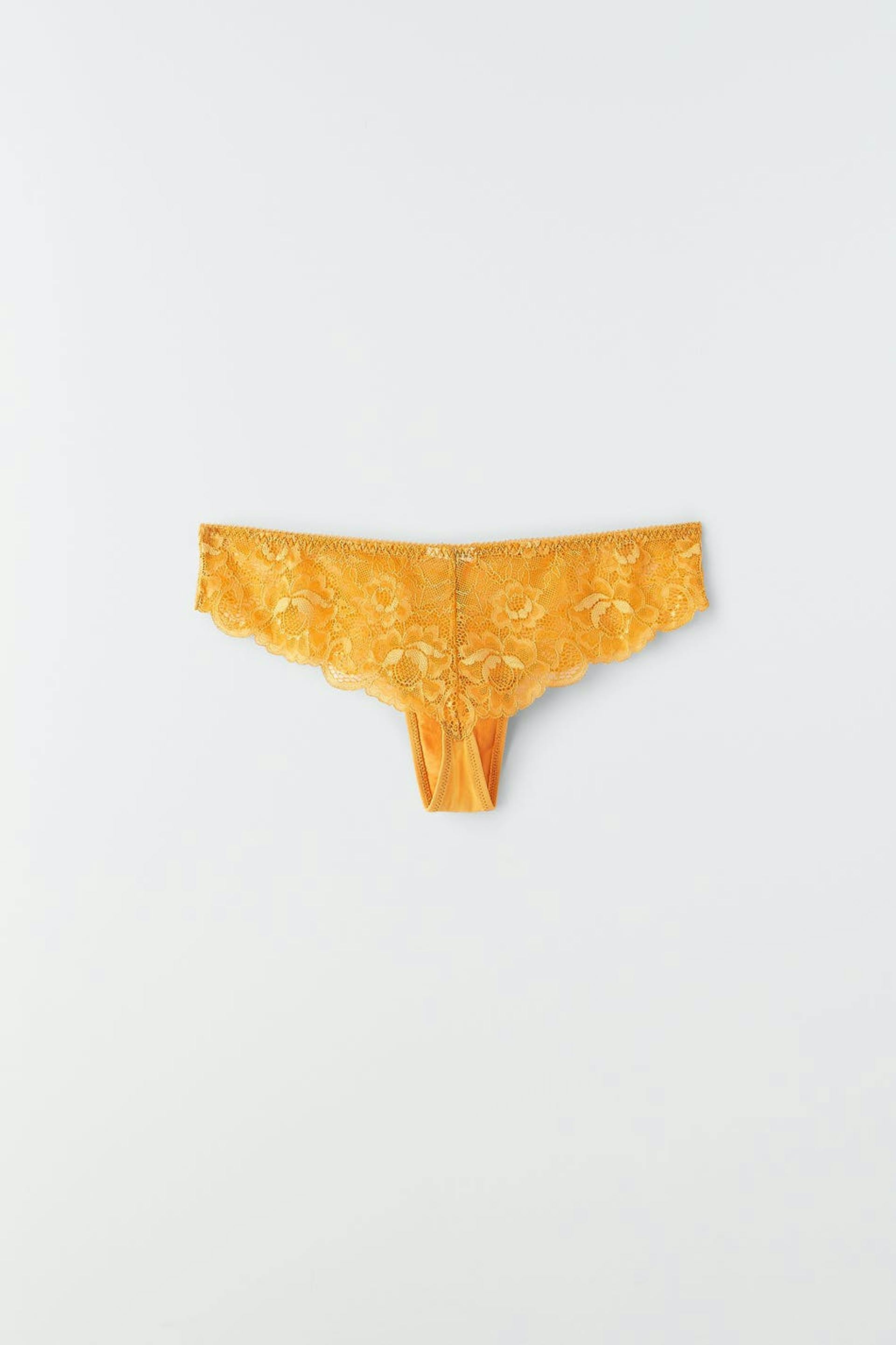 Soft thongs in lace with lined crotch. The thongs are yellow and have a bow detail in front.