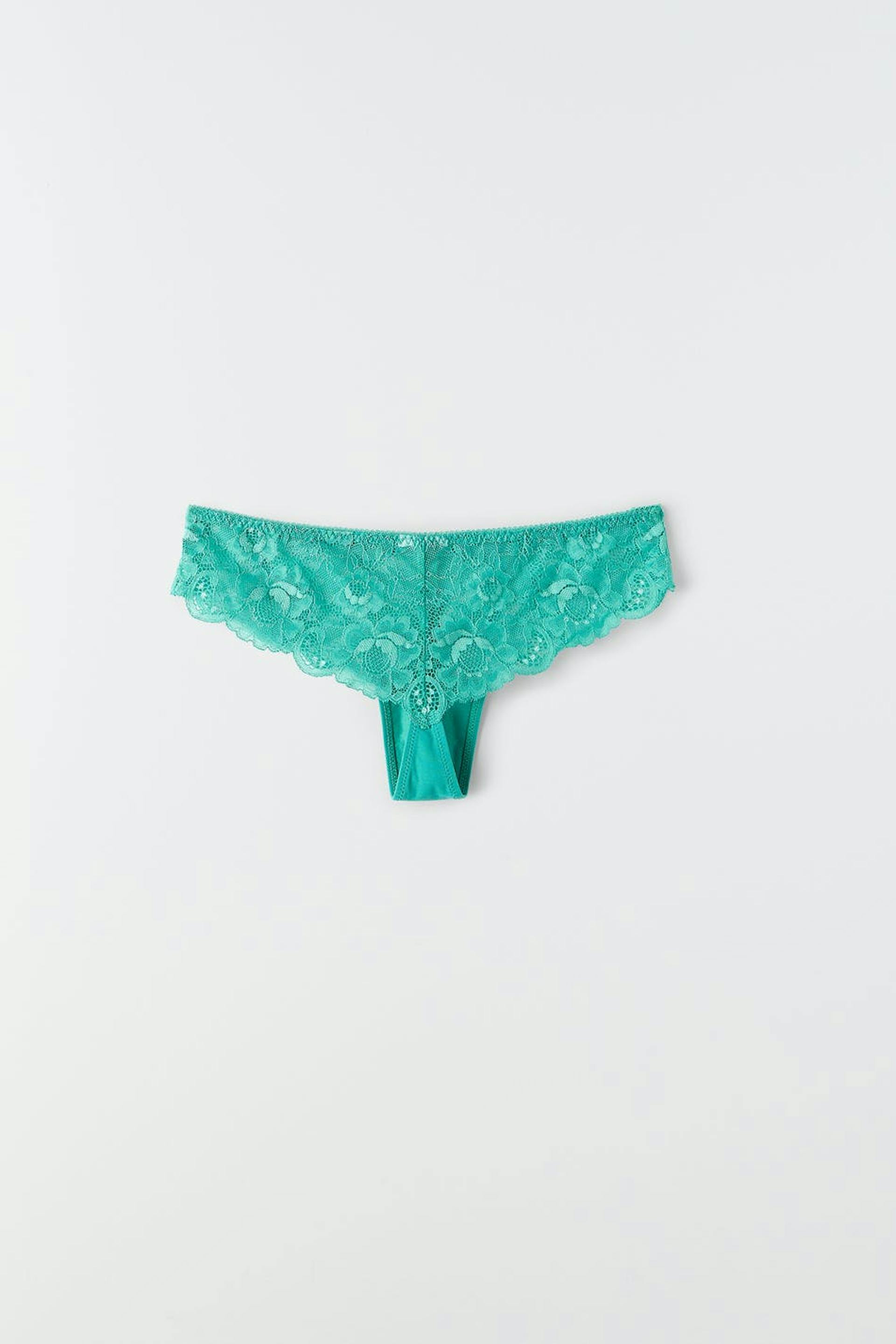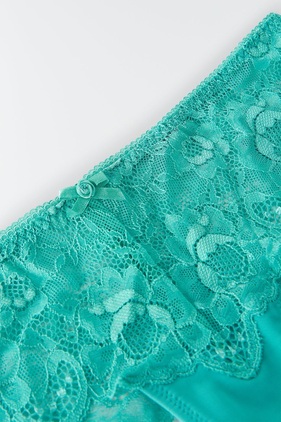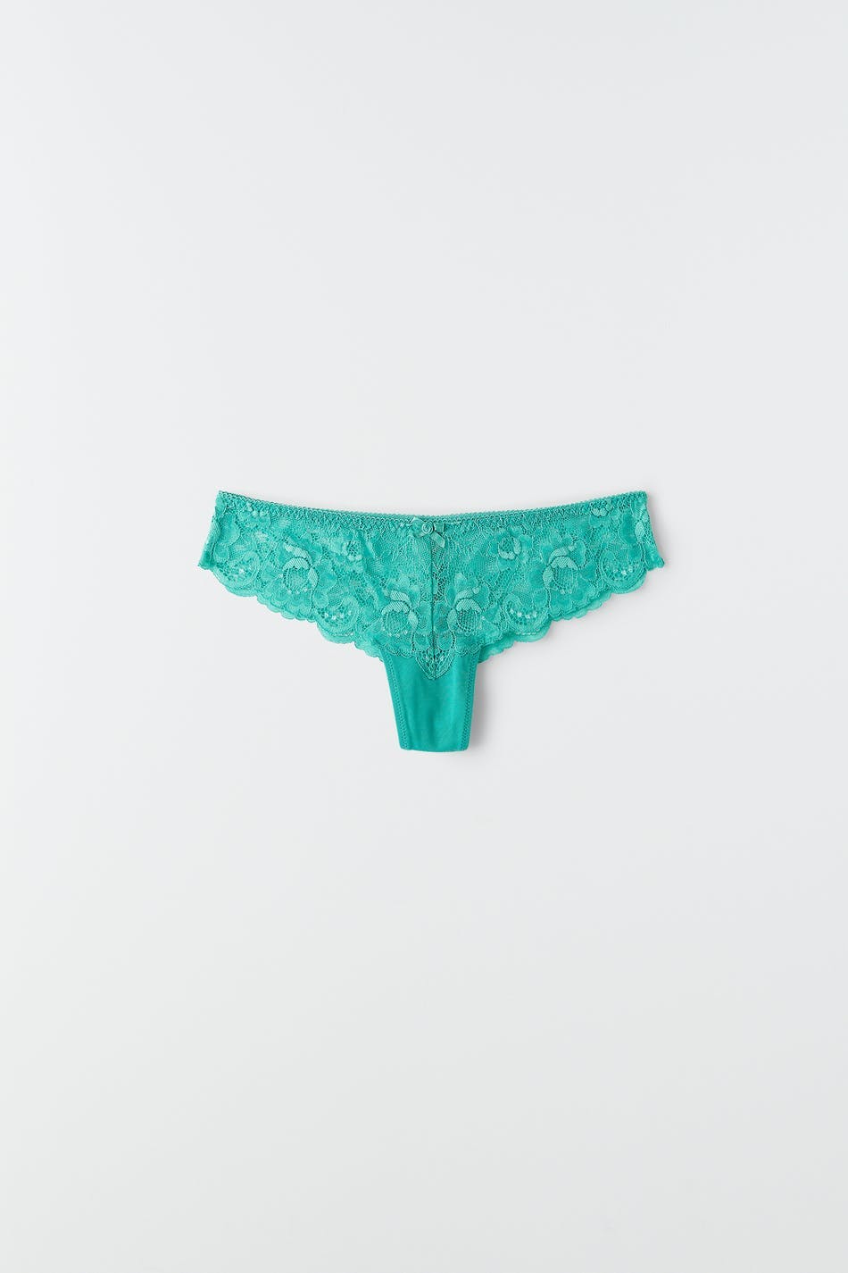 Soft thongs in lace with lined crotch. The thongs are blue and have a bow detail in front.