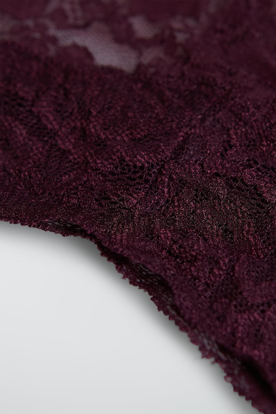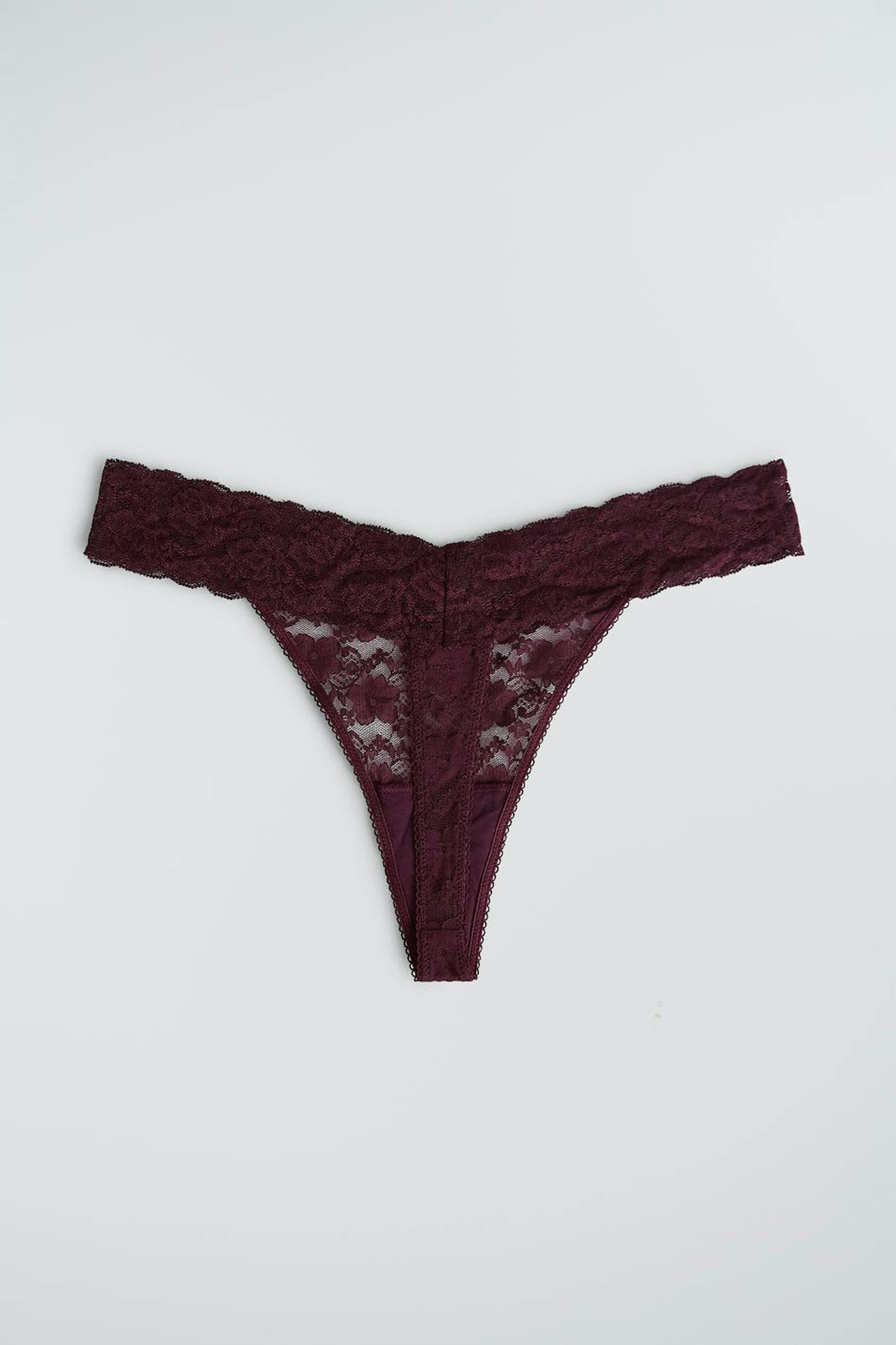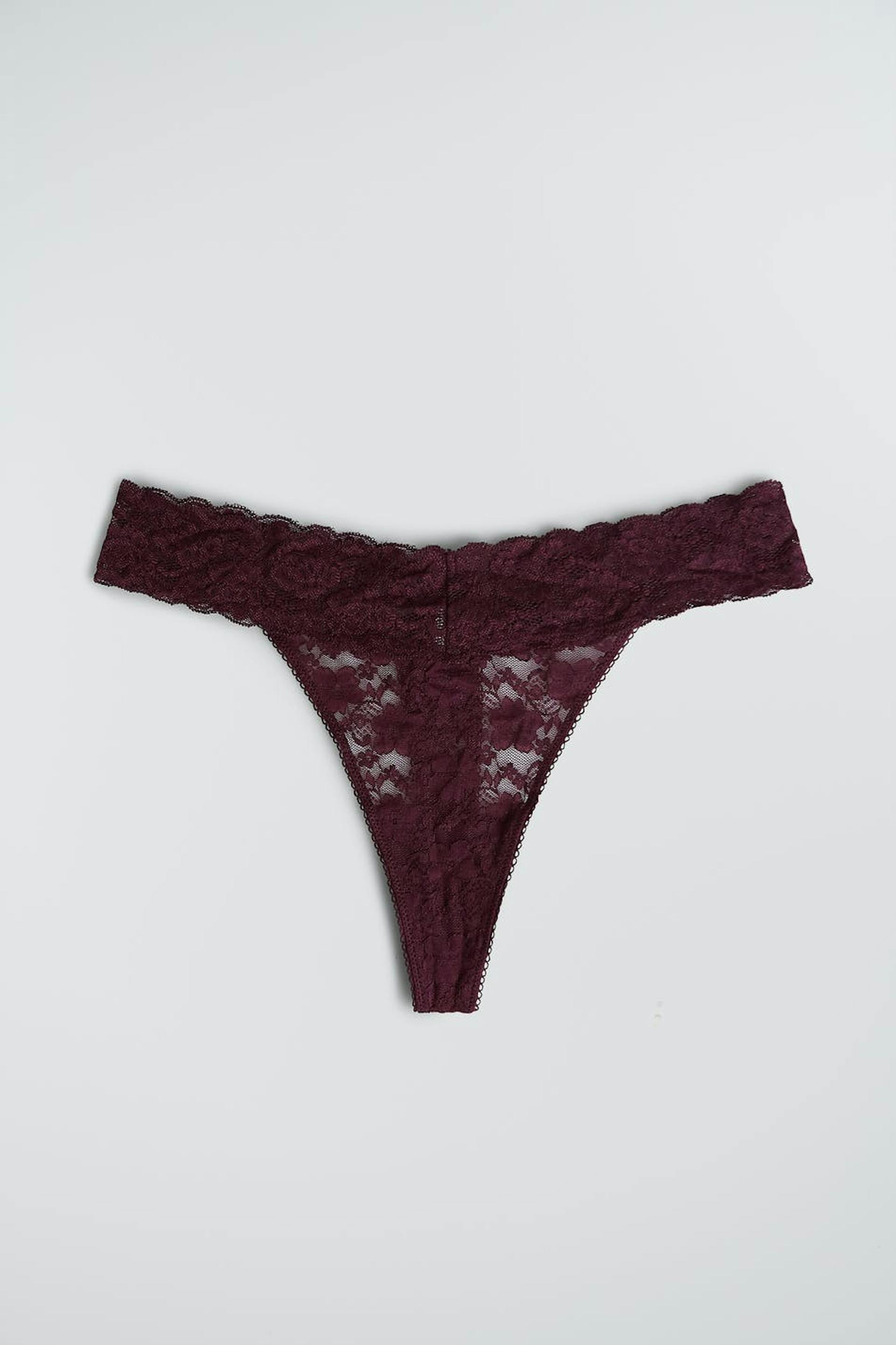 Pantie with a thong design. The pantie is red. It is made of lace.