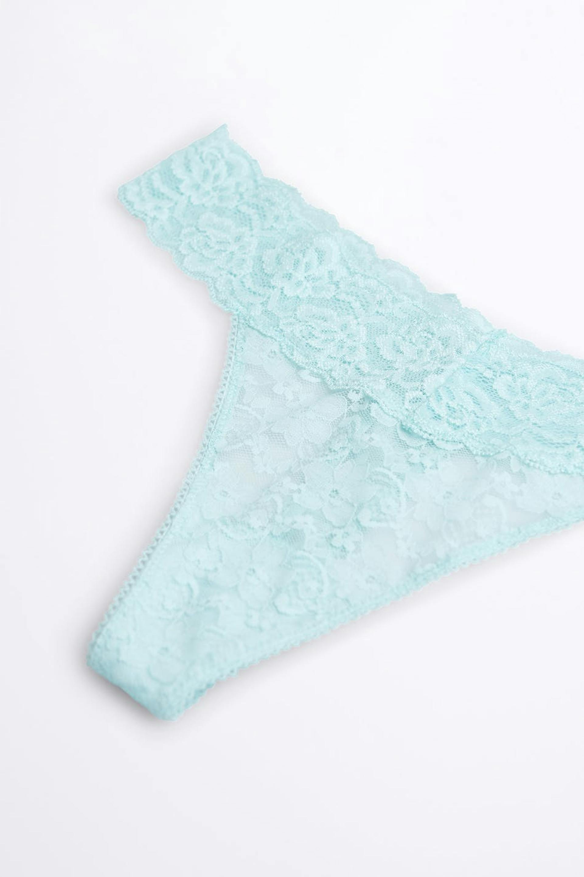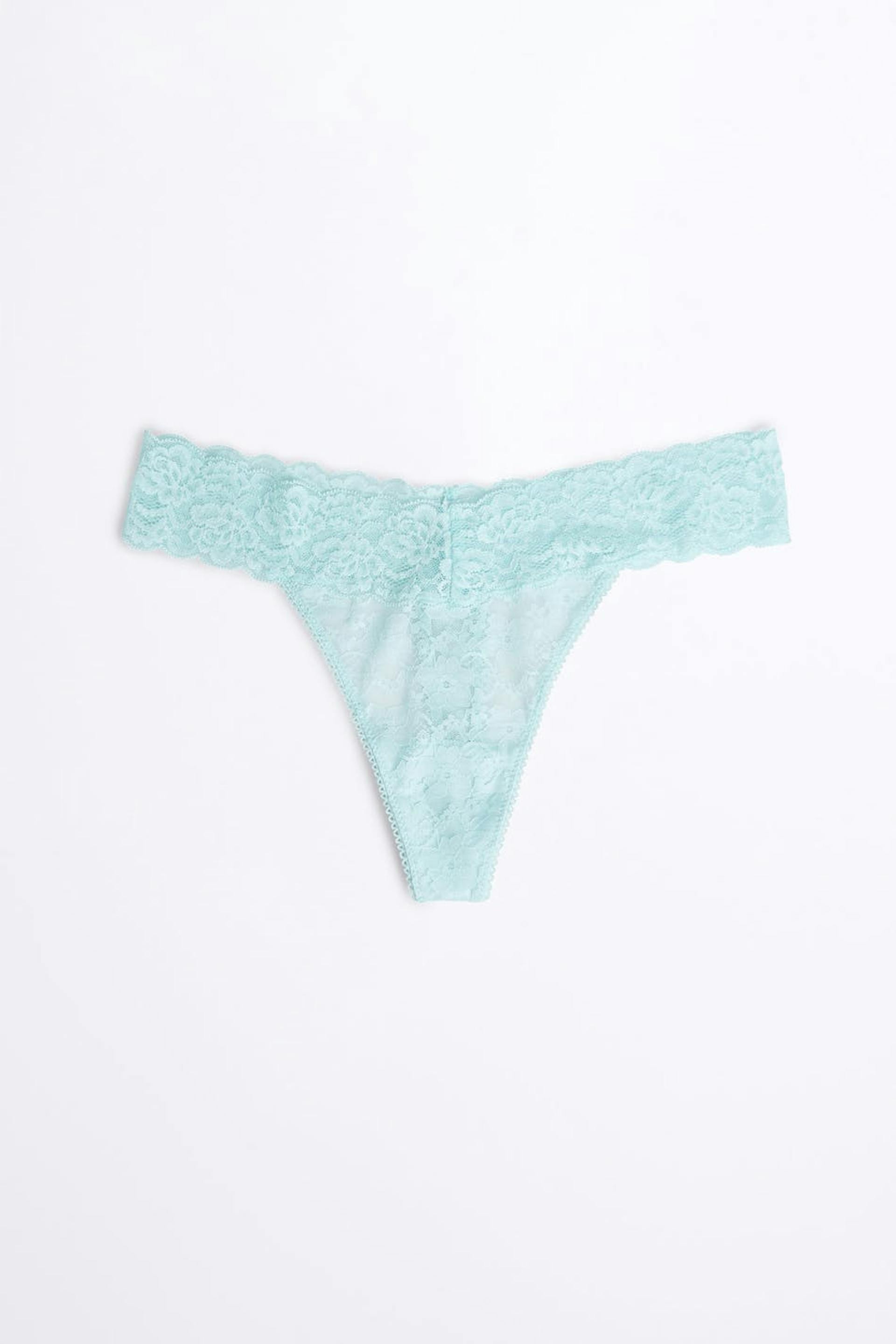 Pantie with a thong design. The pantie is blue. It is made of lace.