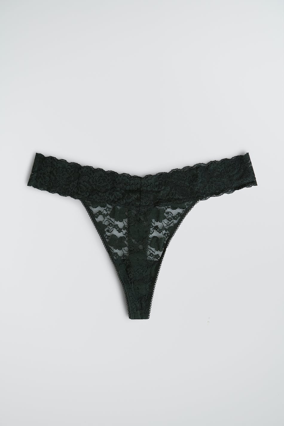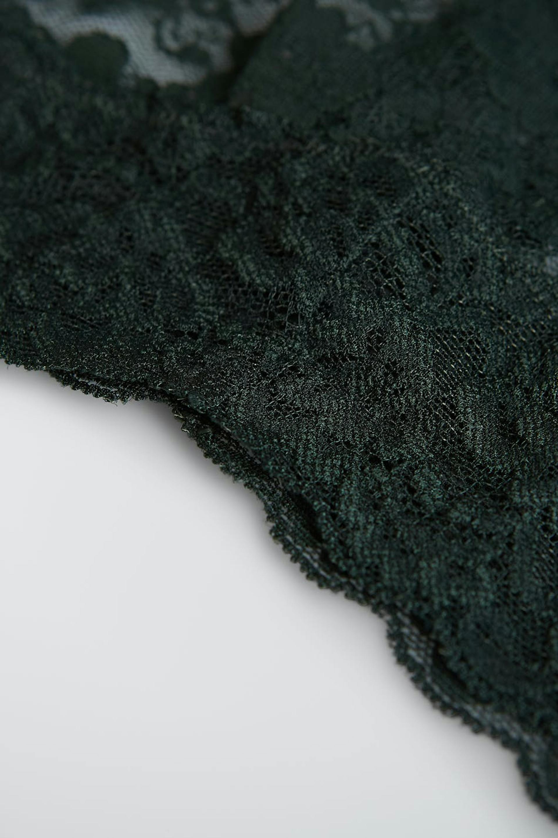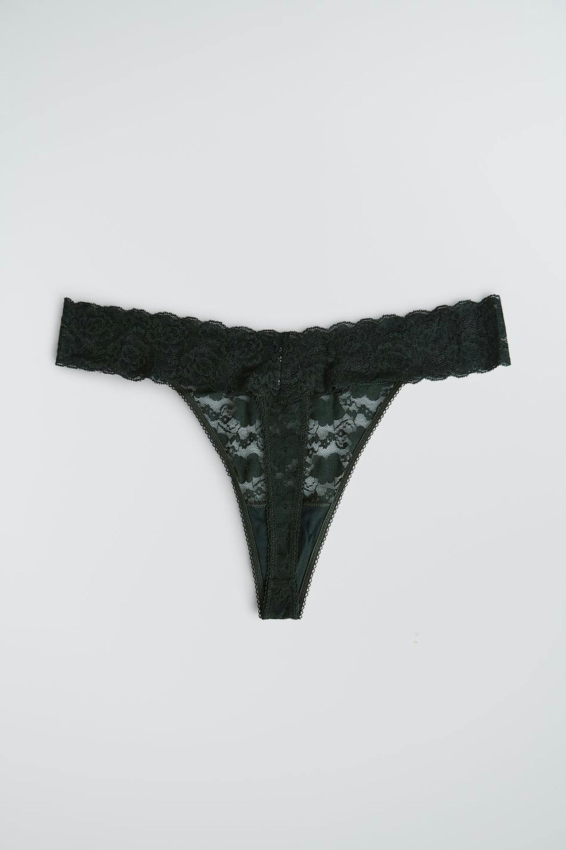 Pantie with a thong design. The pantie is dark green. It is made of lace.