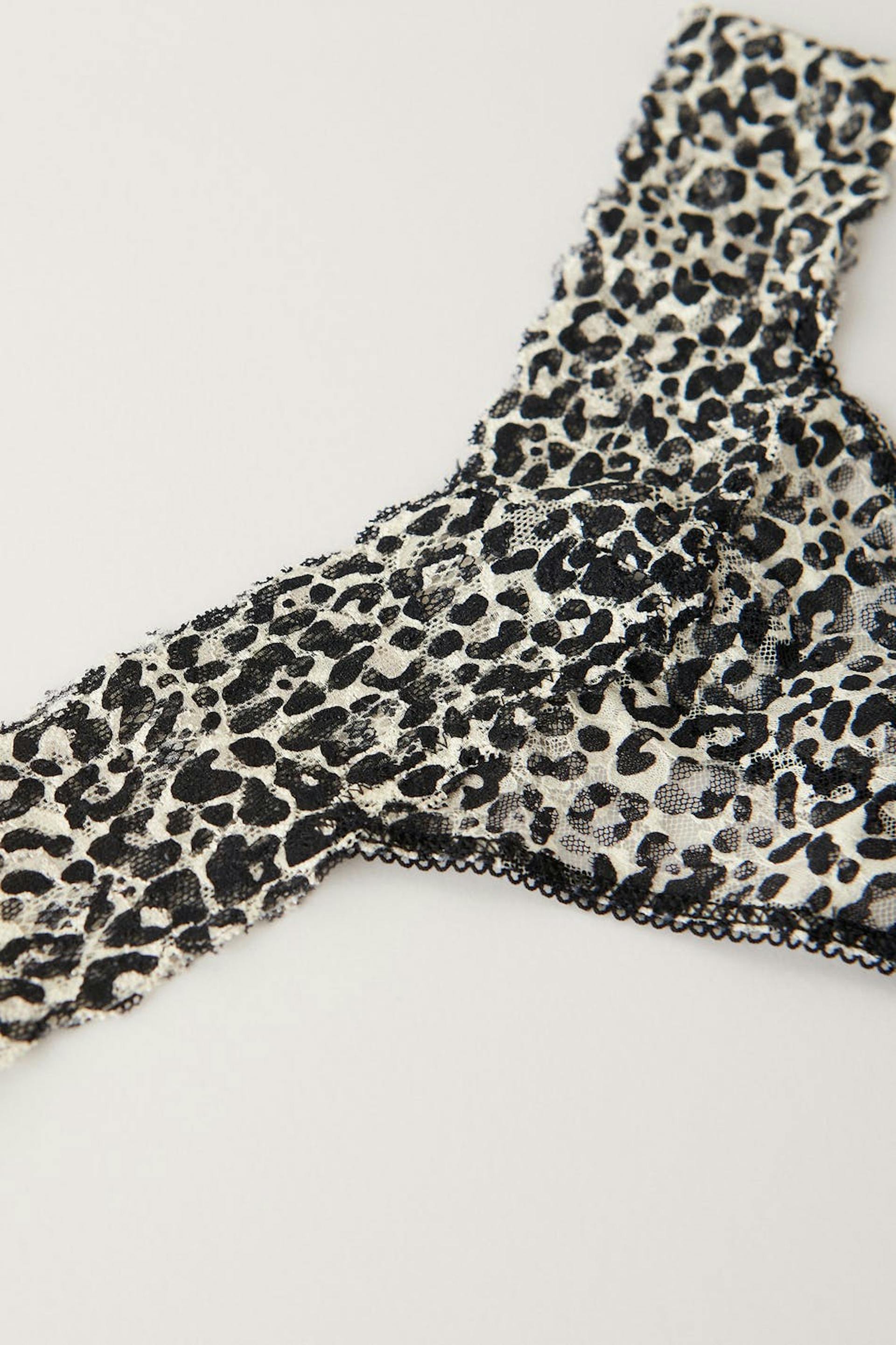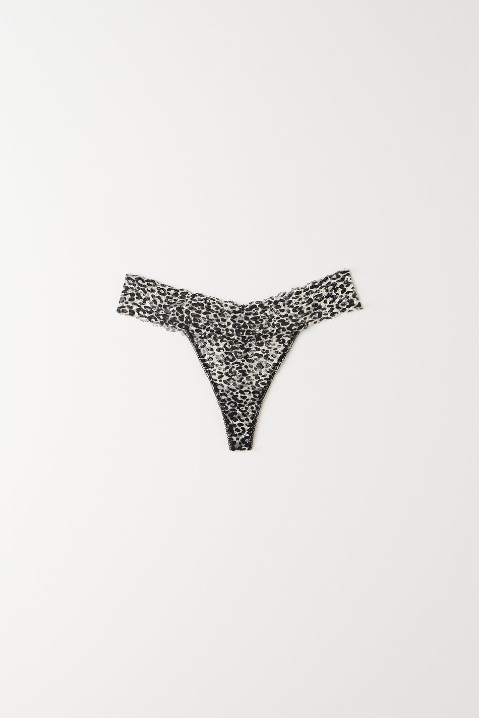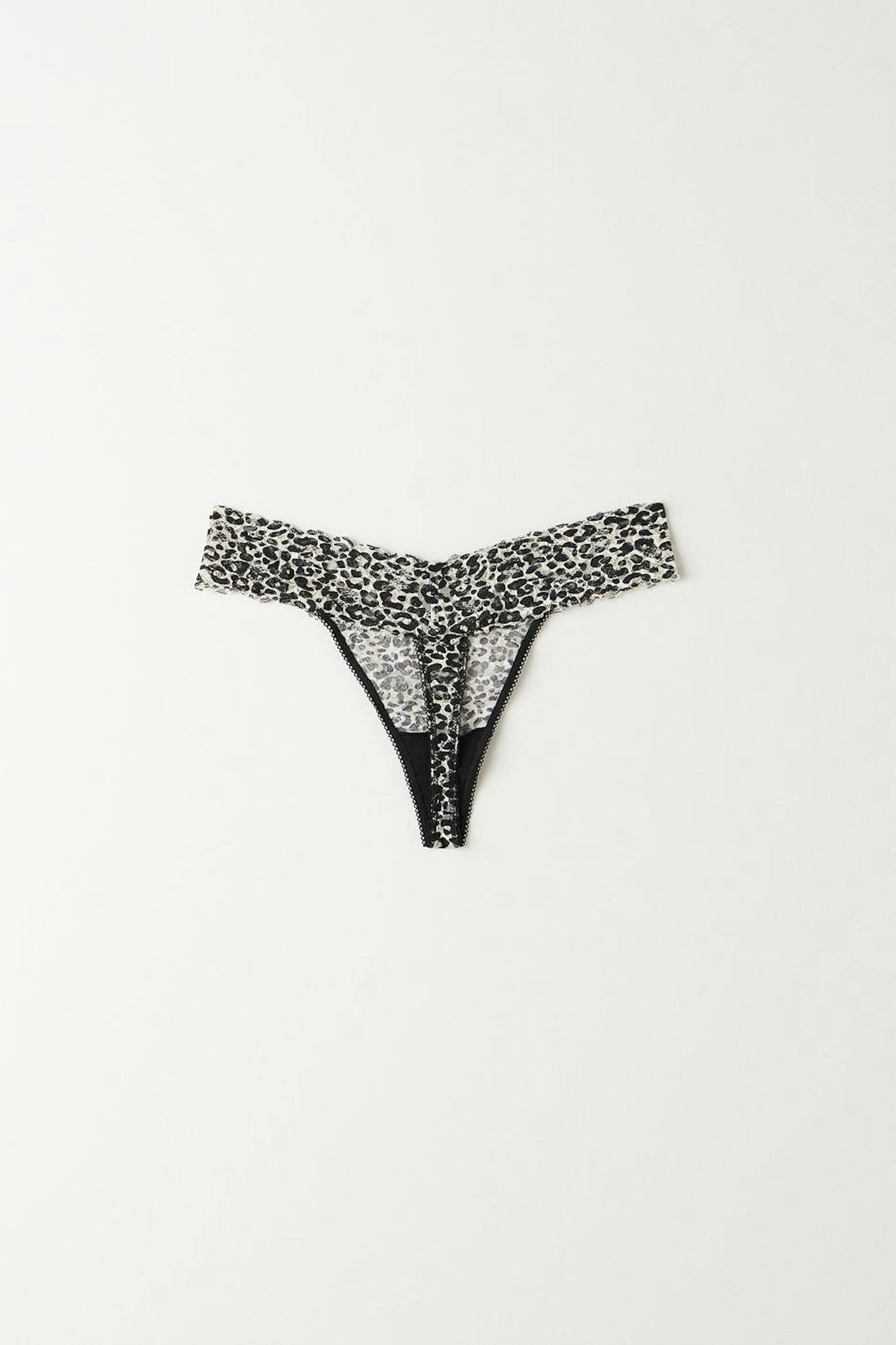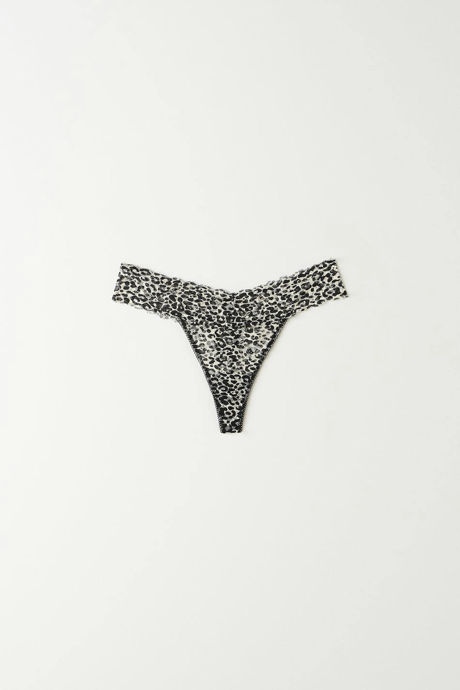 Leopard patterned thongs with soft, elastic lace fabric. The thongs are black and have a lined crotch.