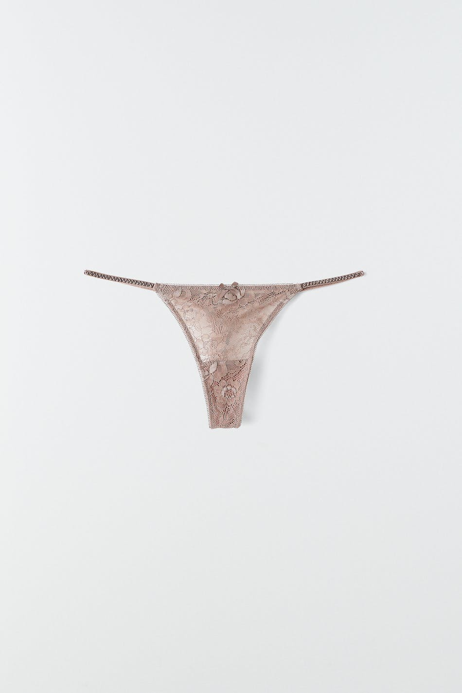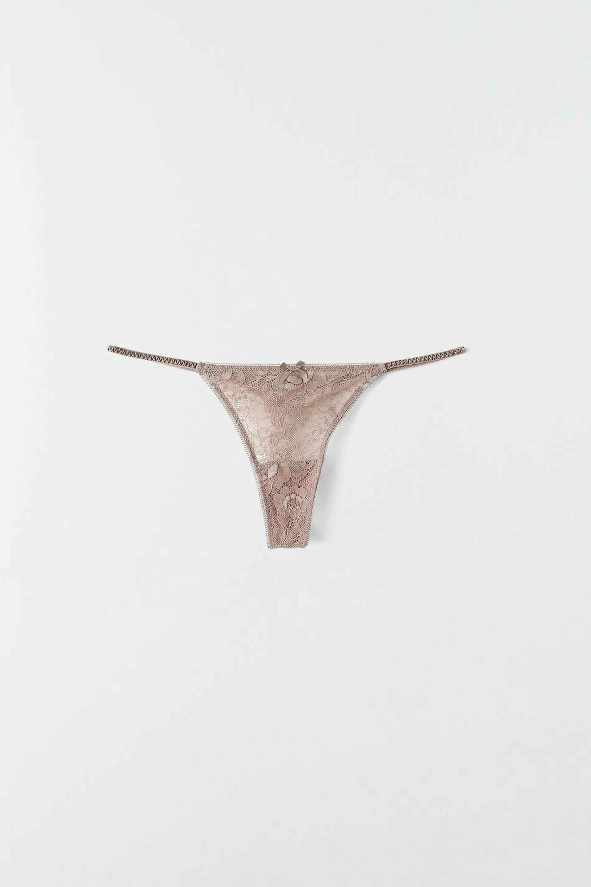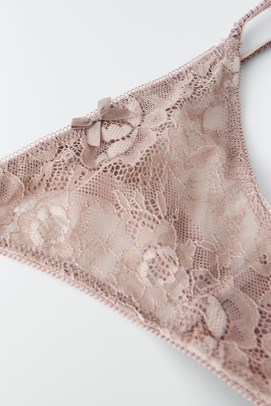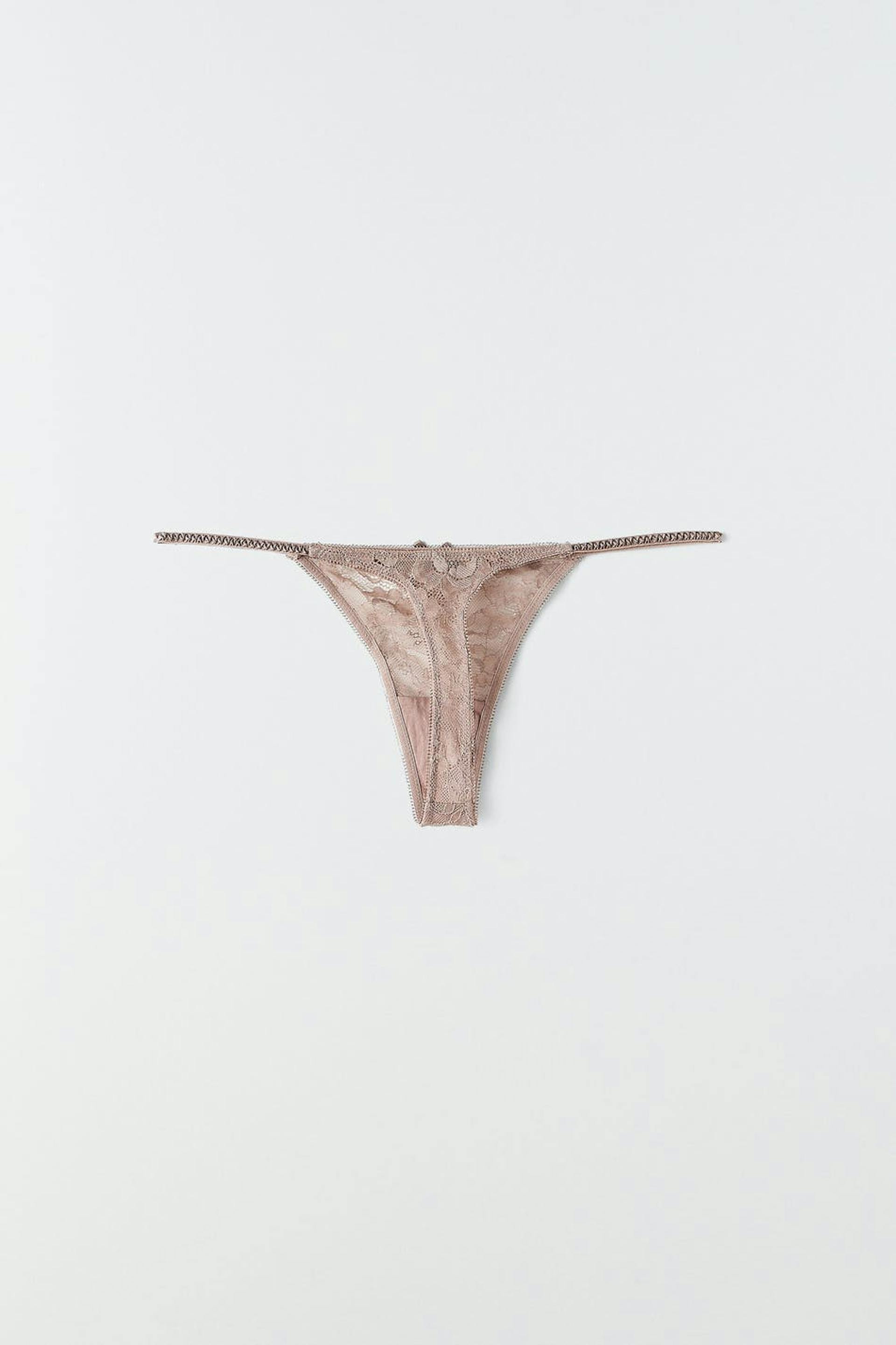 Thongs in lace with thin elastic straps in the sides. The thongs are beige and have a crotch lining in cotton.