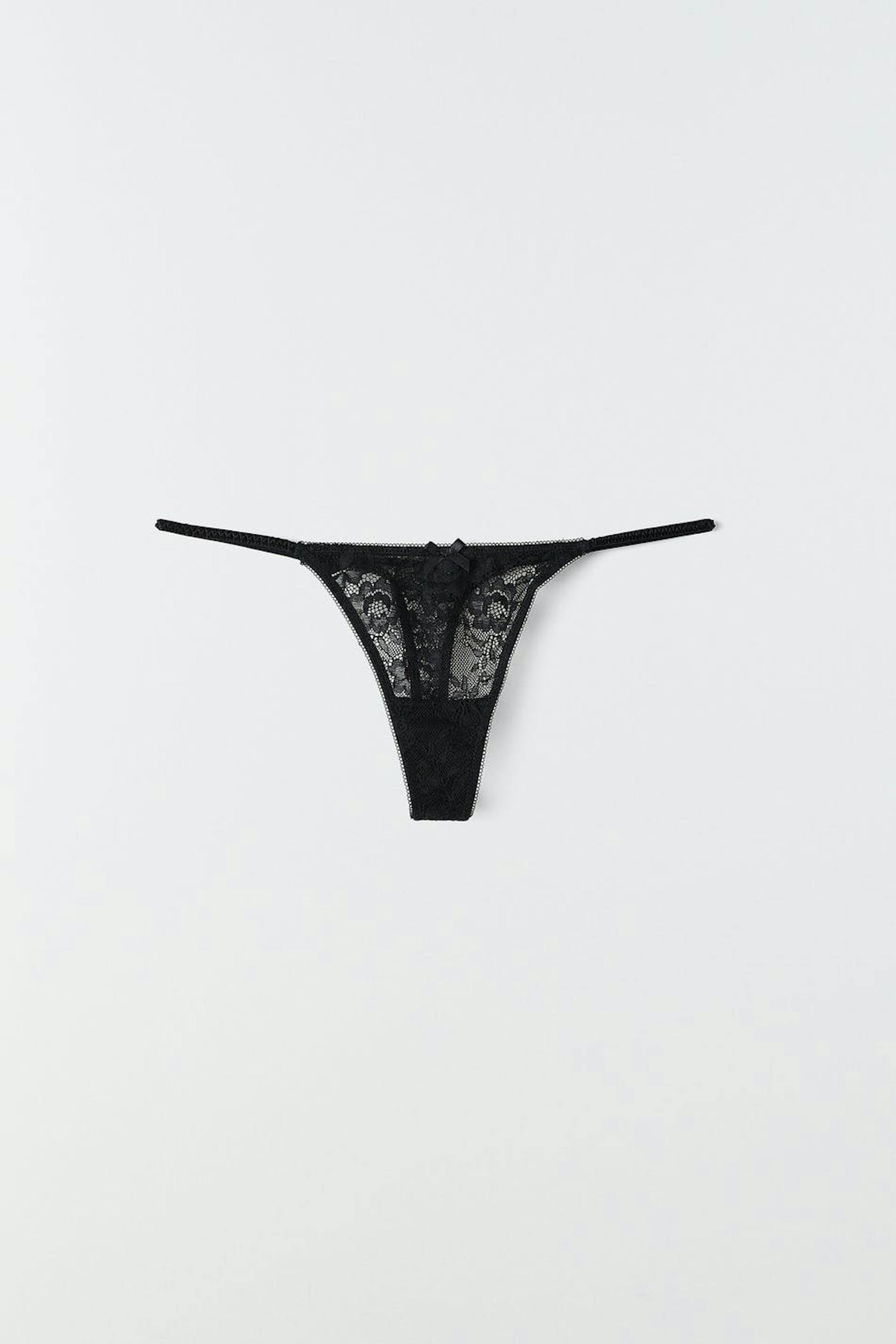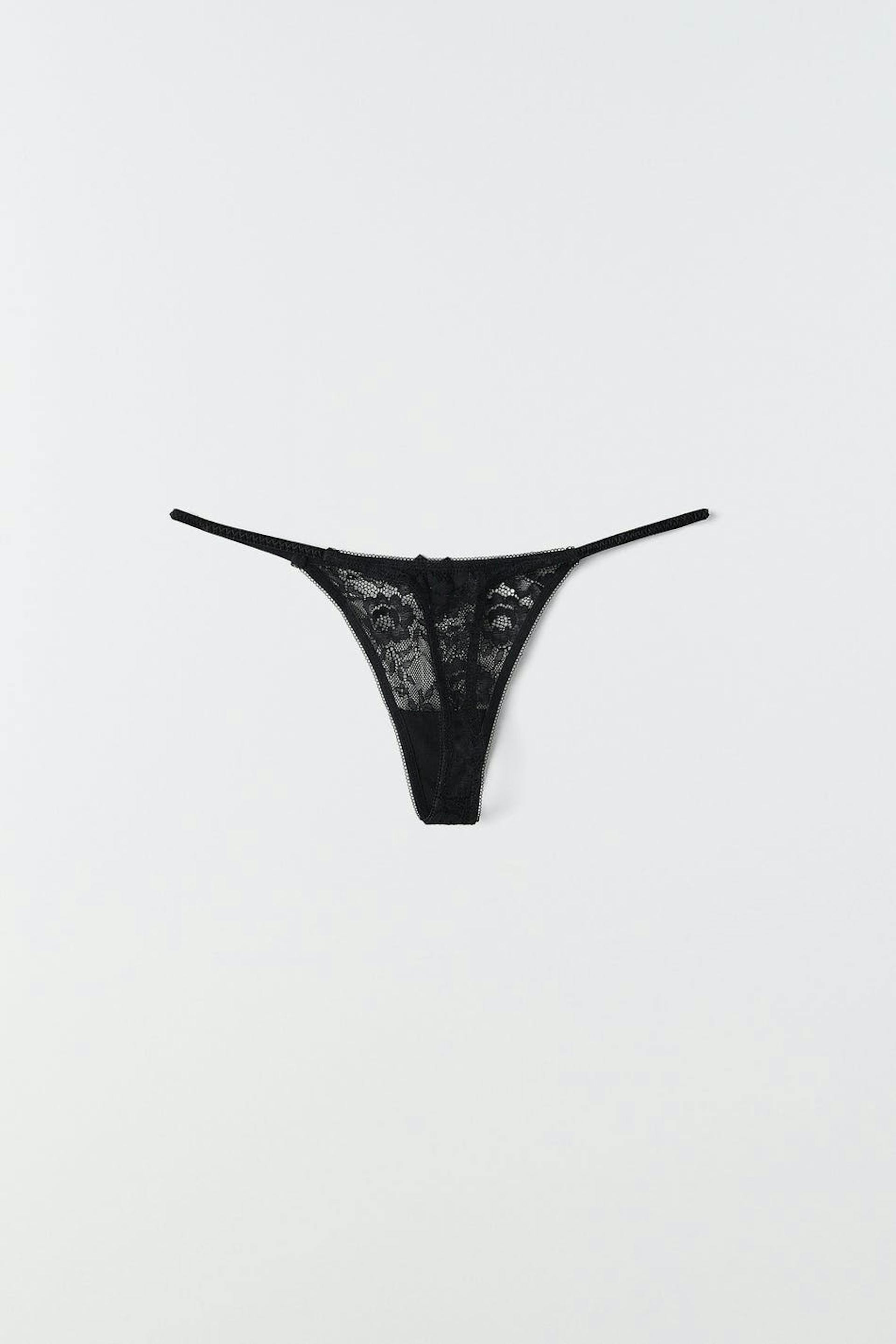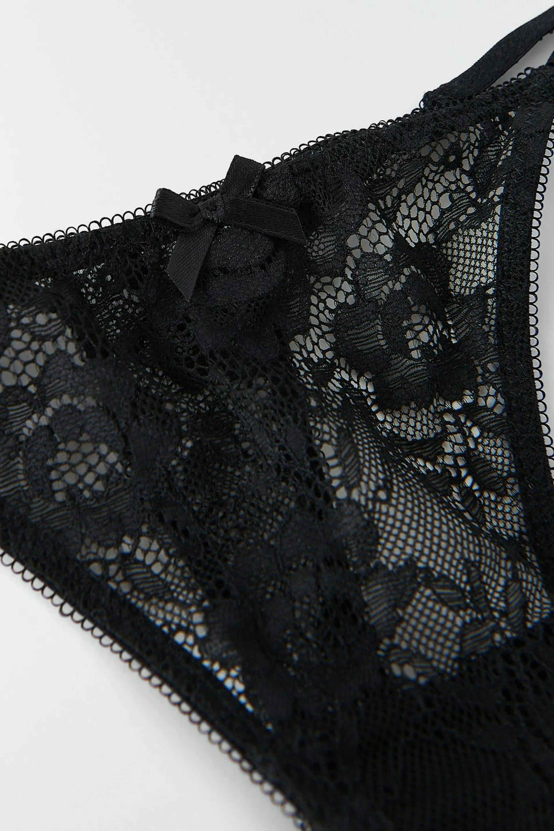 Thongs in lace with thin elastic straps in the sides. The thongs are black and have a crotch lining in cotton.
