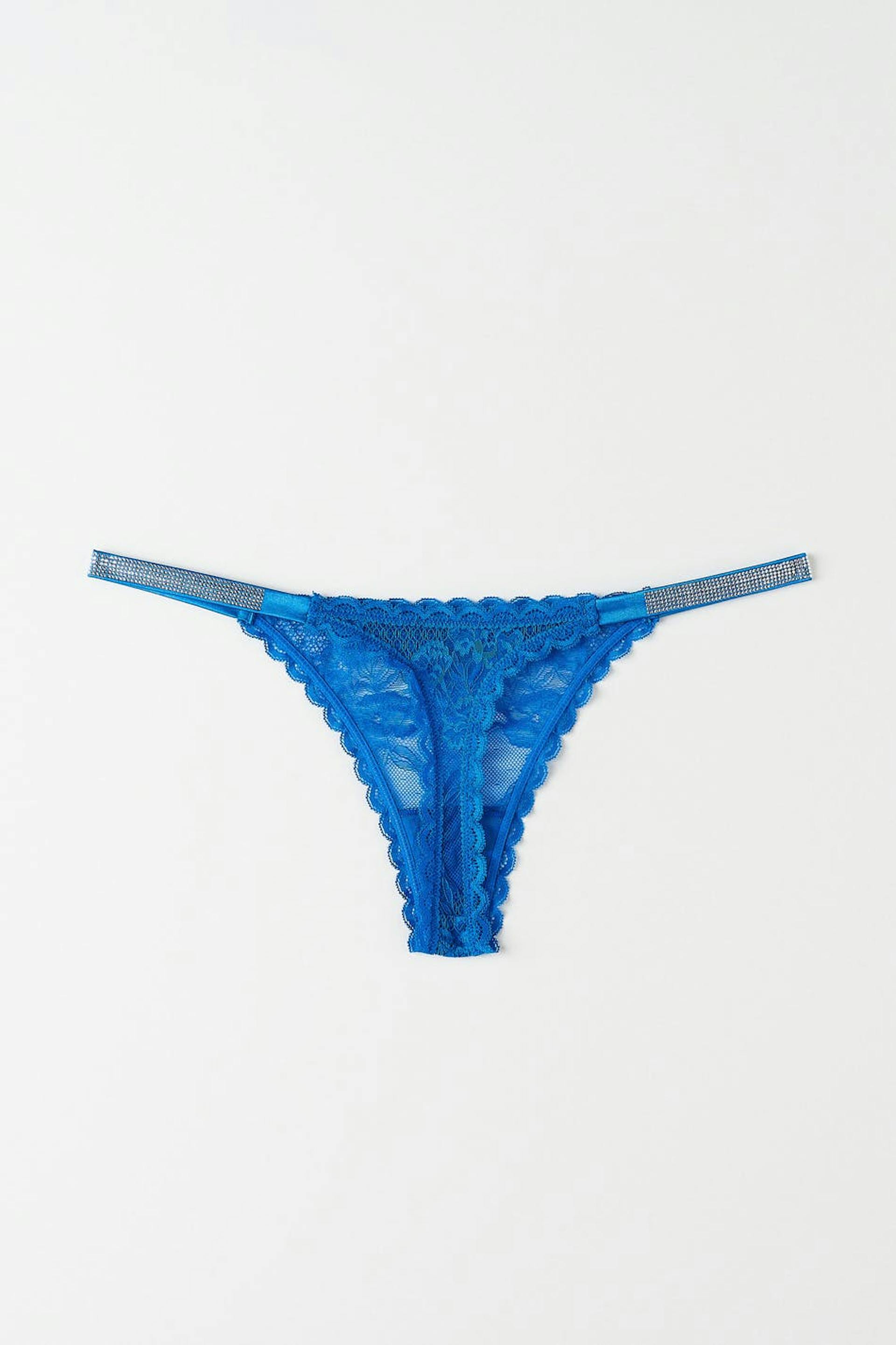 Thongs in lace with crotch lining. The thongs are blue and have thin elastic straps with rhinestone in the sides.
