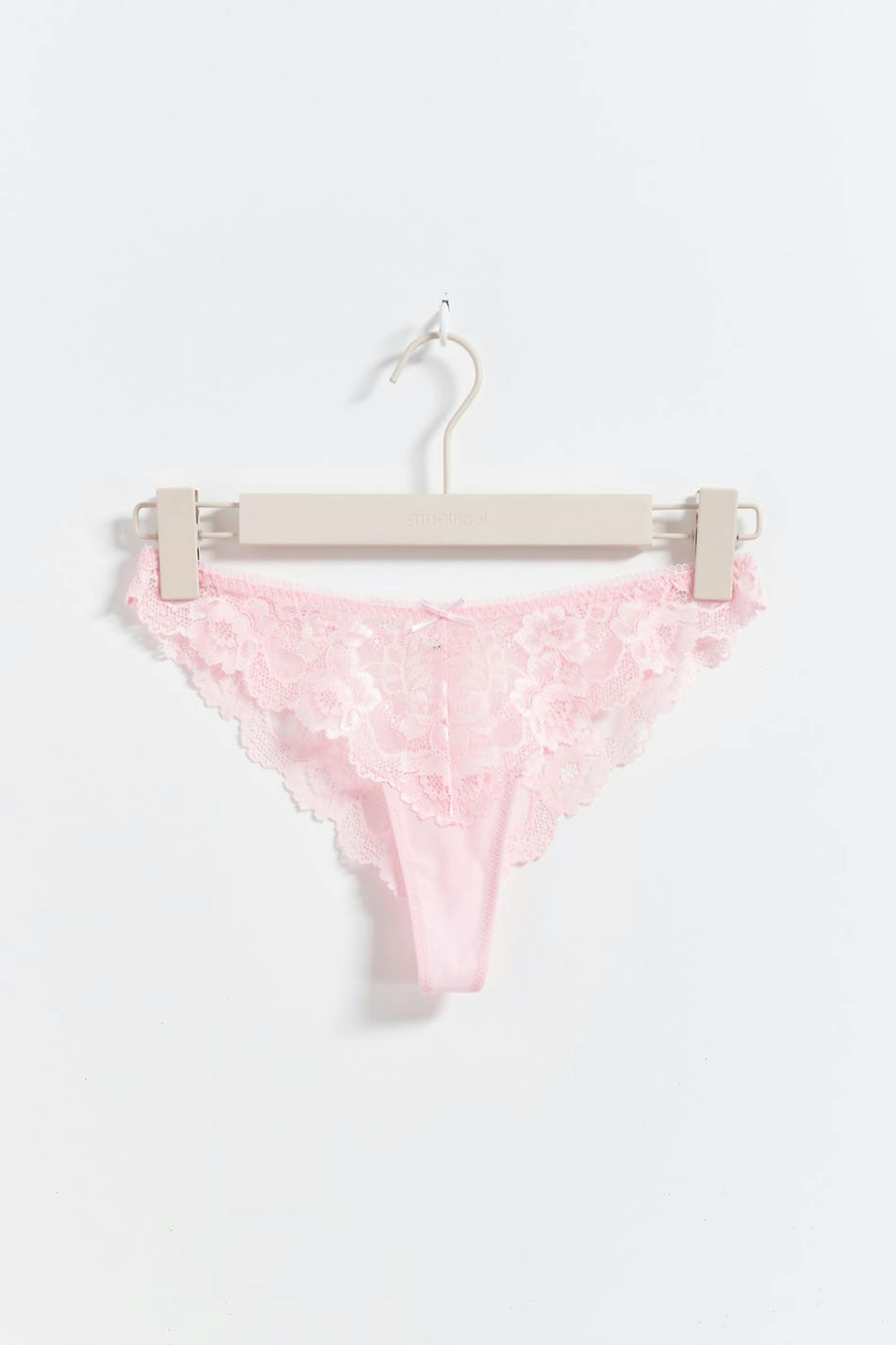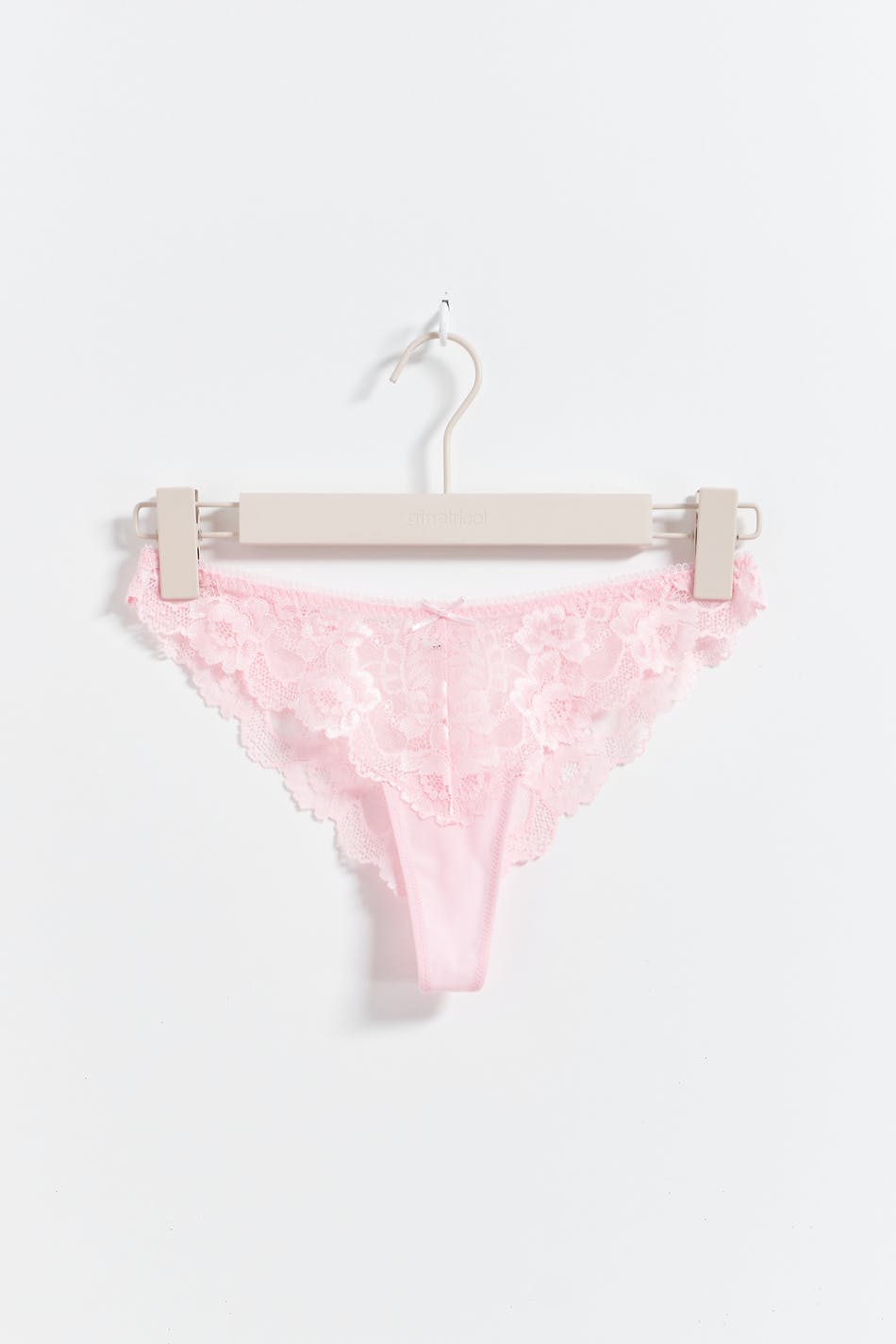 High-cut pantie in lace with crotch lining. The pantie is pink and has soft picot edge at the waist. It has v cut and bow detail at the front.