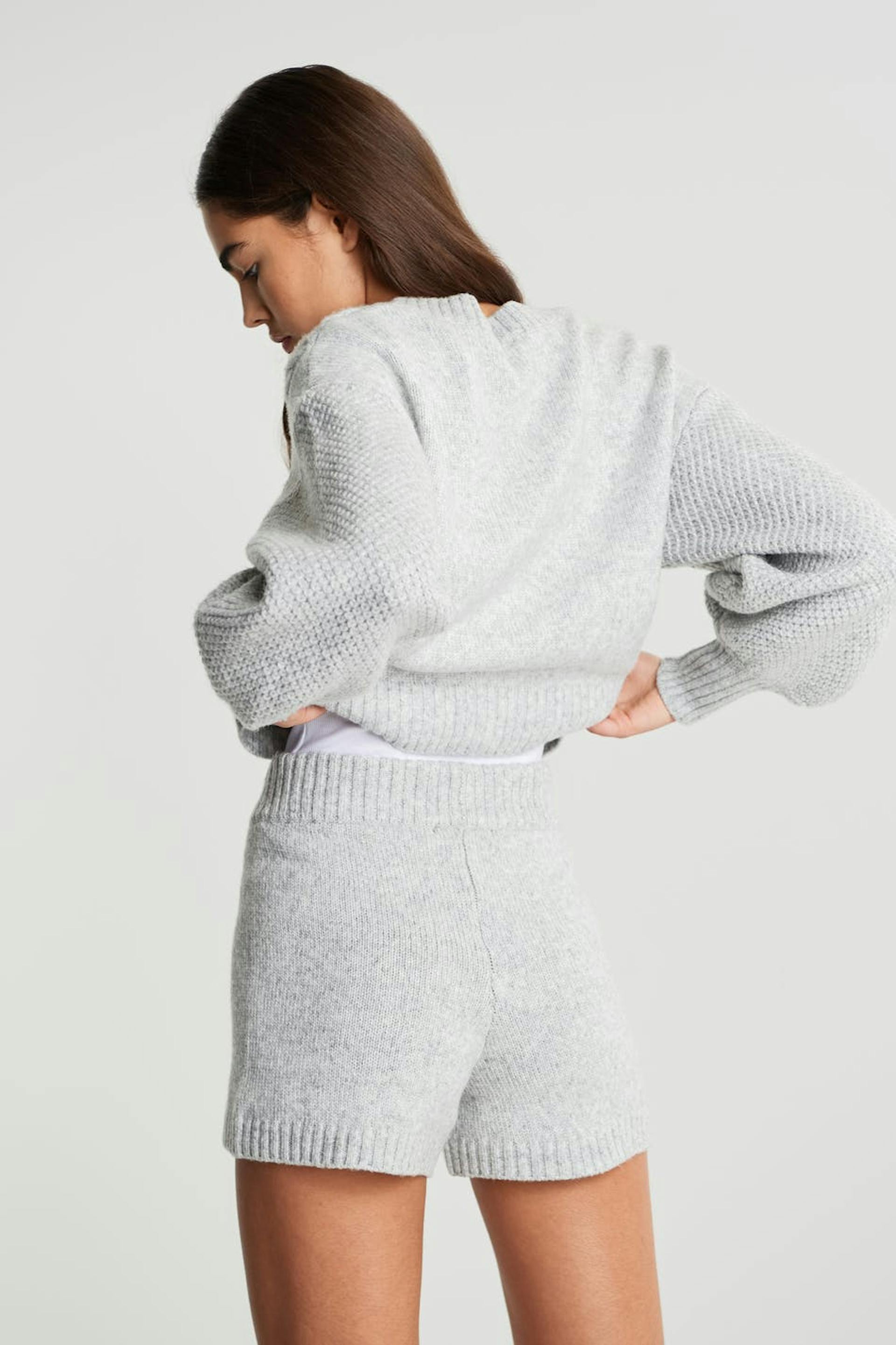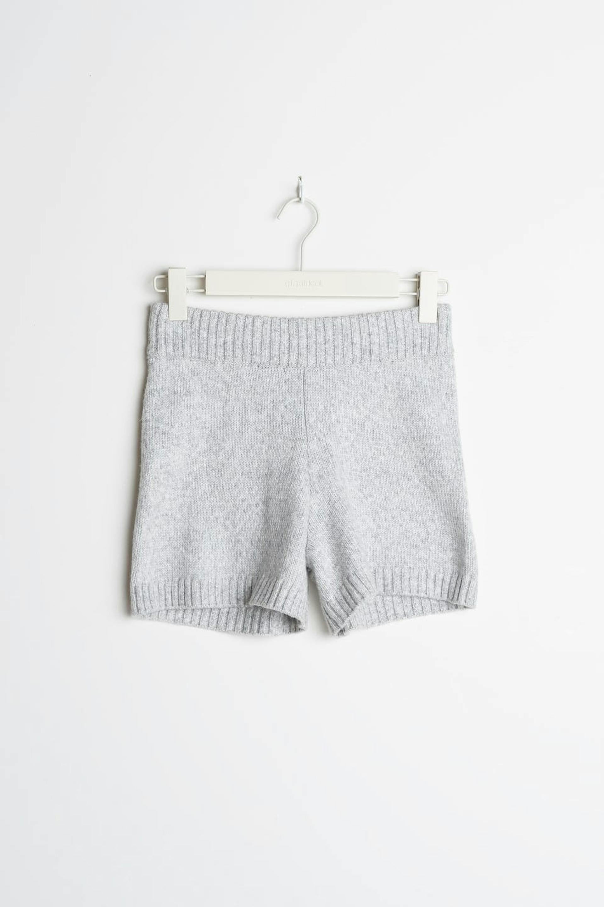 Knitted shorts with a ribbed cuff on the leg openings and at the waist. The shorts are grey and short.