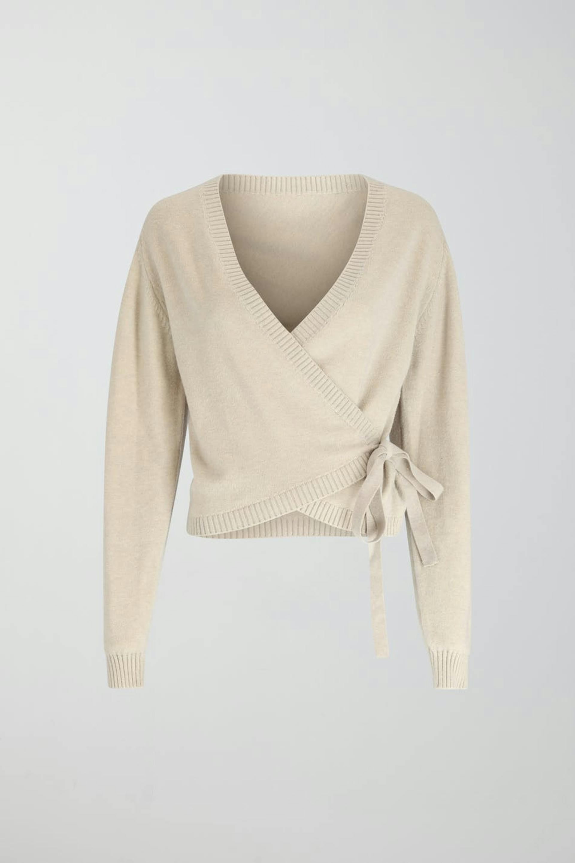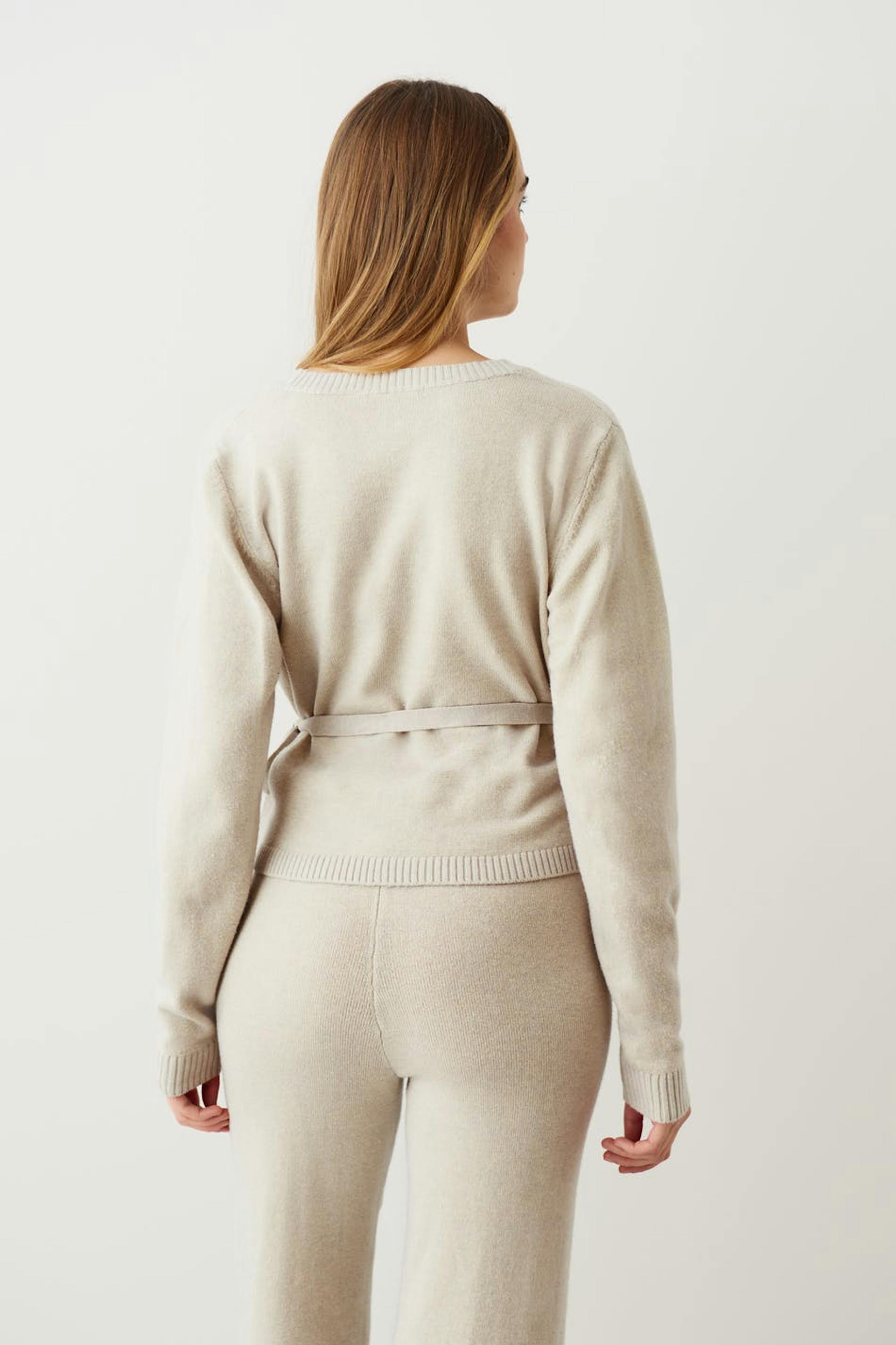 Soft knit cardigan with wrap design. The cardigan is beige and has self-tie at the waist. It has long sleeves, v-neck and rib-knit hems.