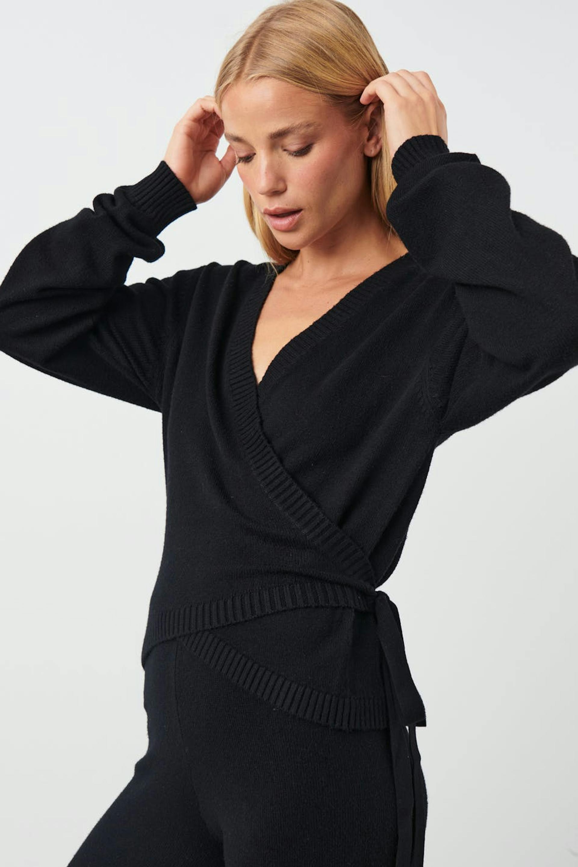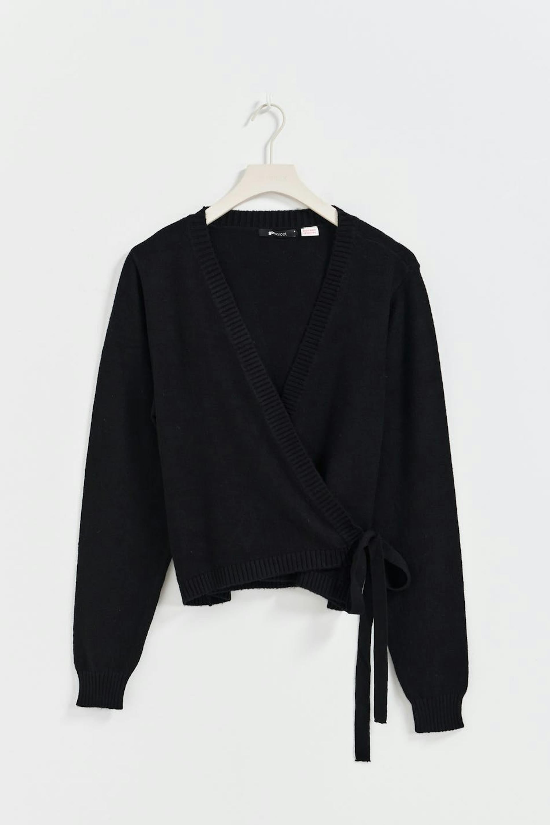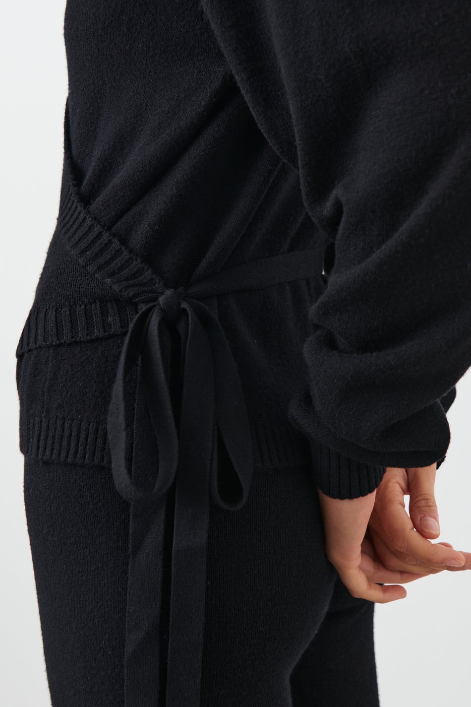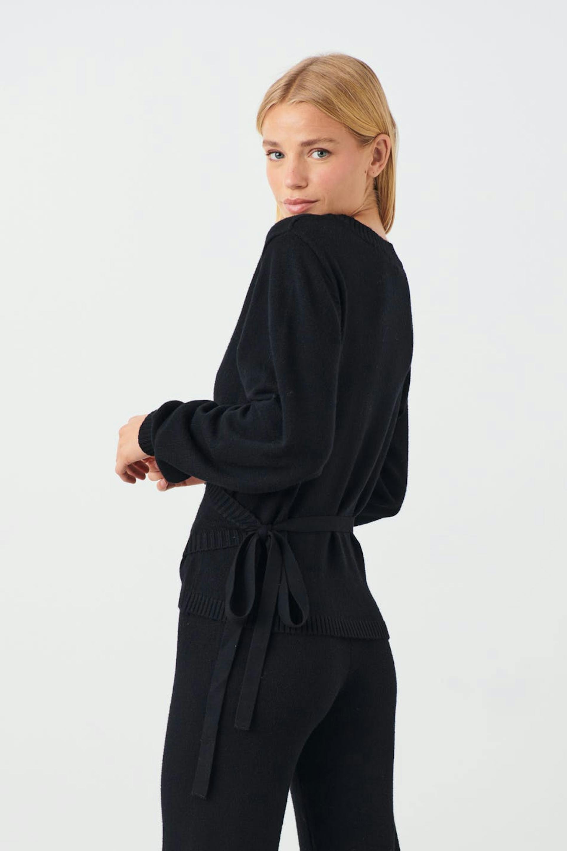 Soft knit cardigan with wrap design. The cardigan is black and has self-tie at the waist. It has long sleeves, v-neck and rib-knit hems.