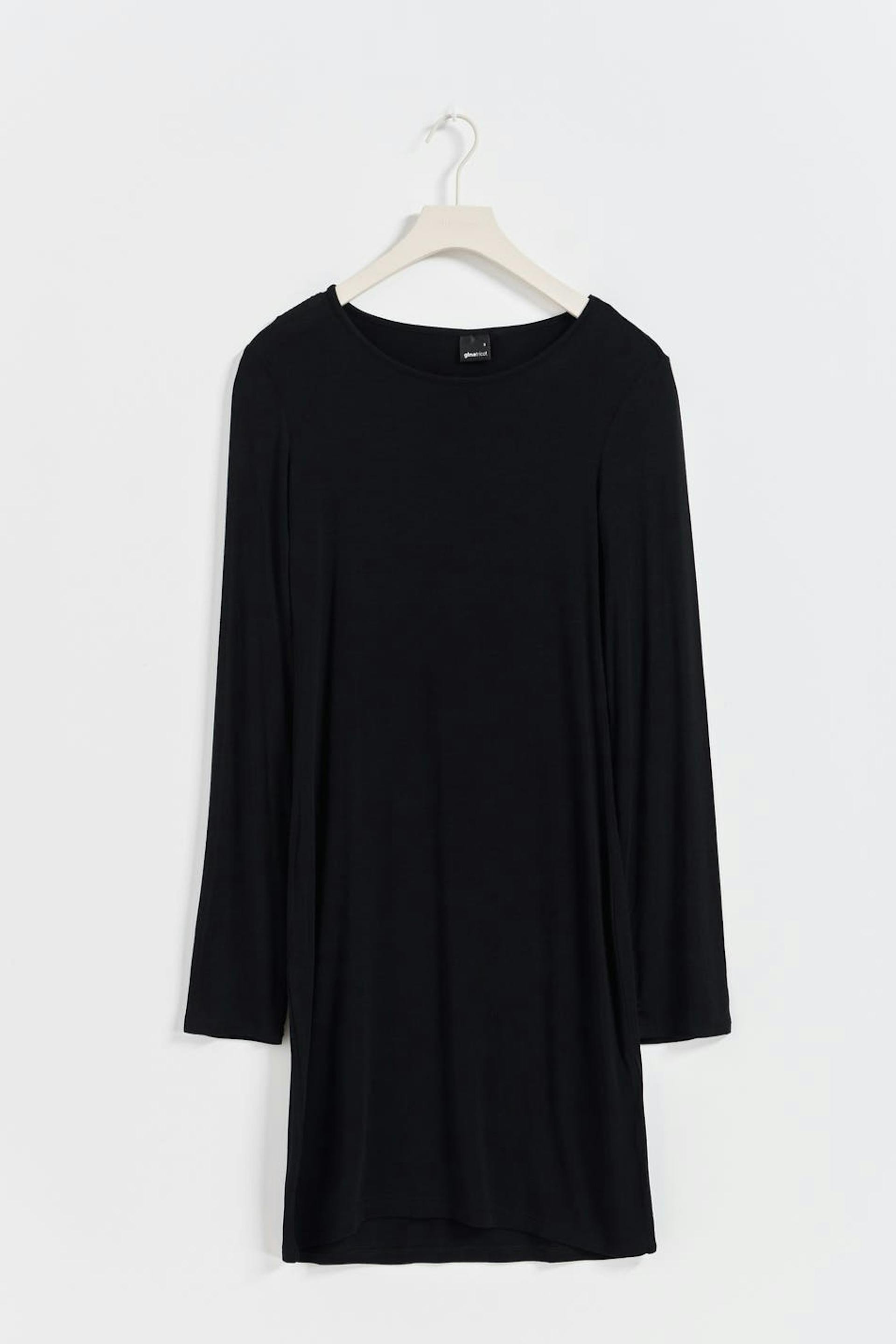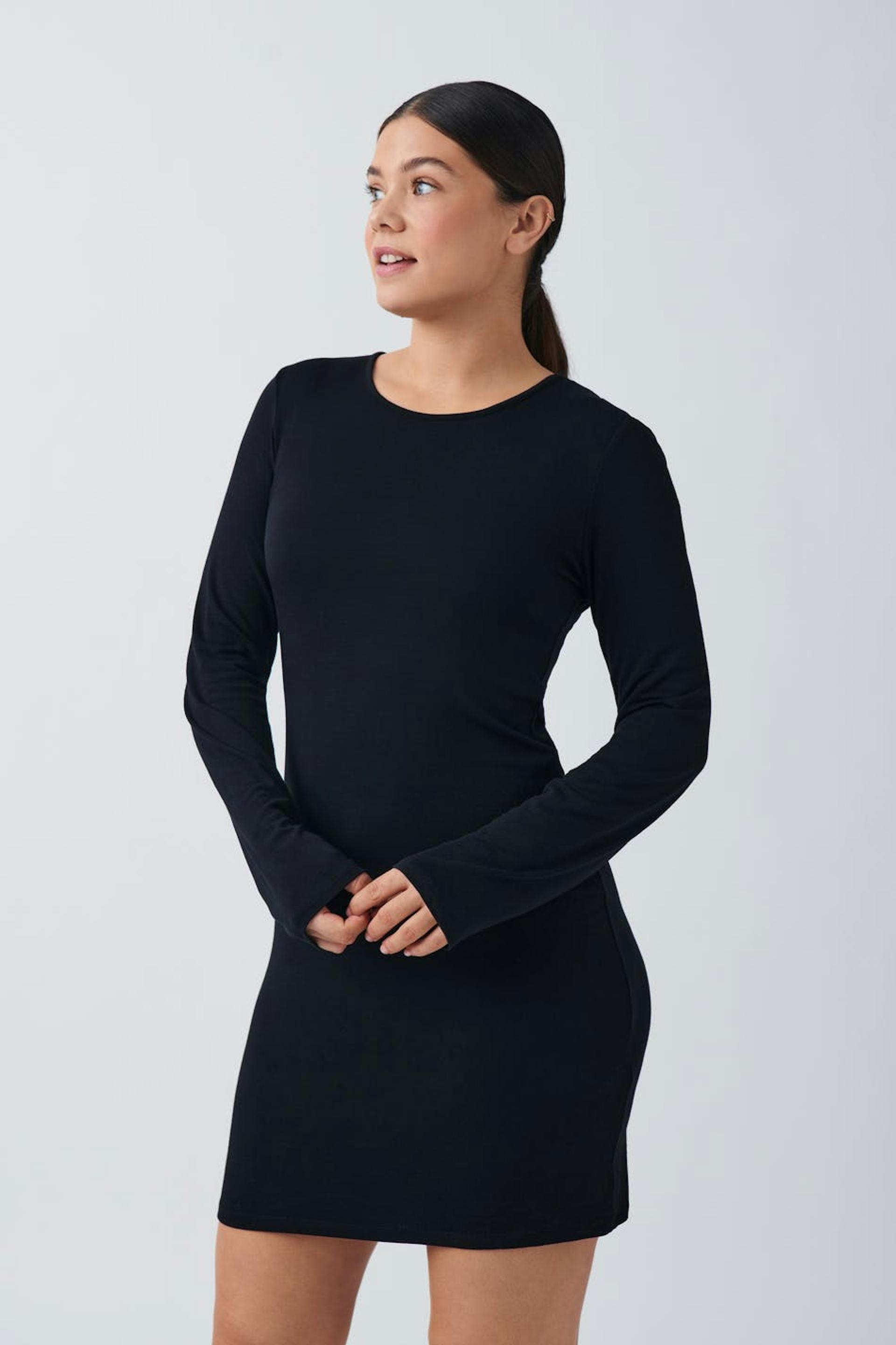 Long-sleeved dress with round neckline. The dress is black and has seethrough quality.