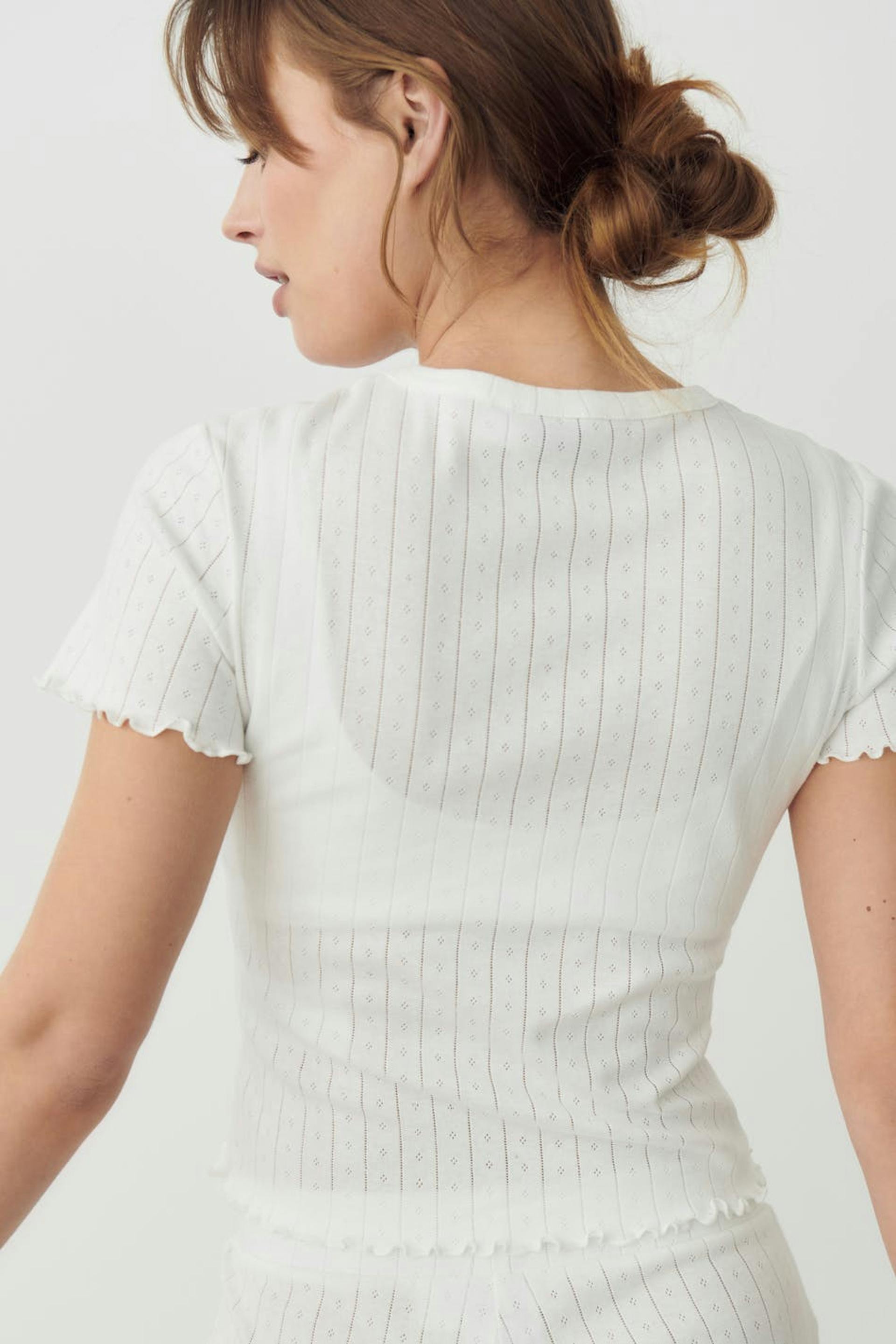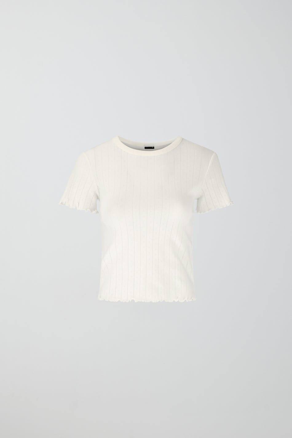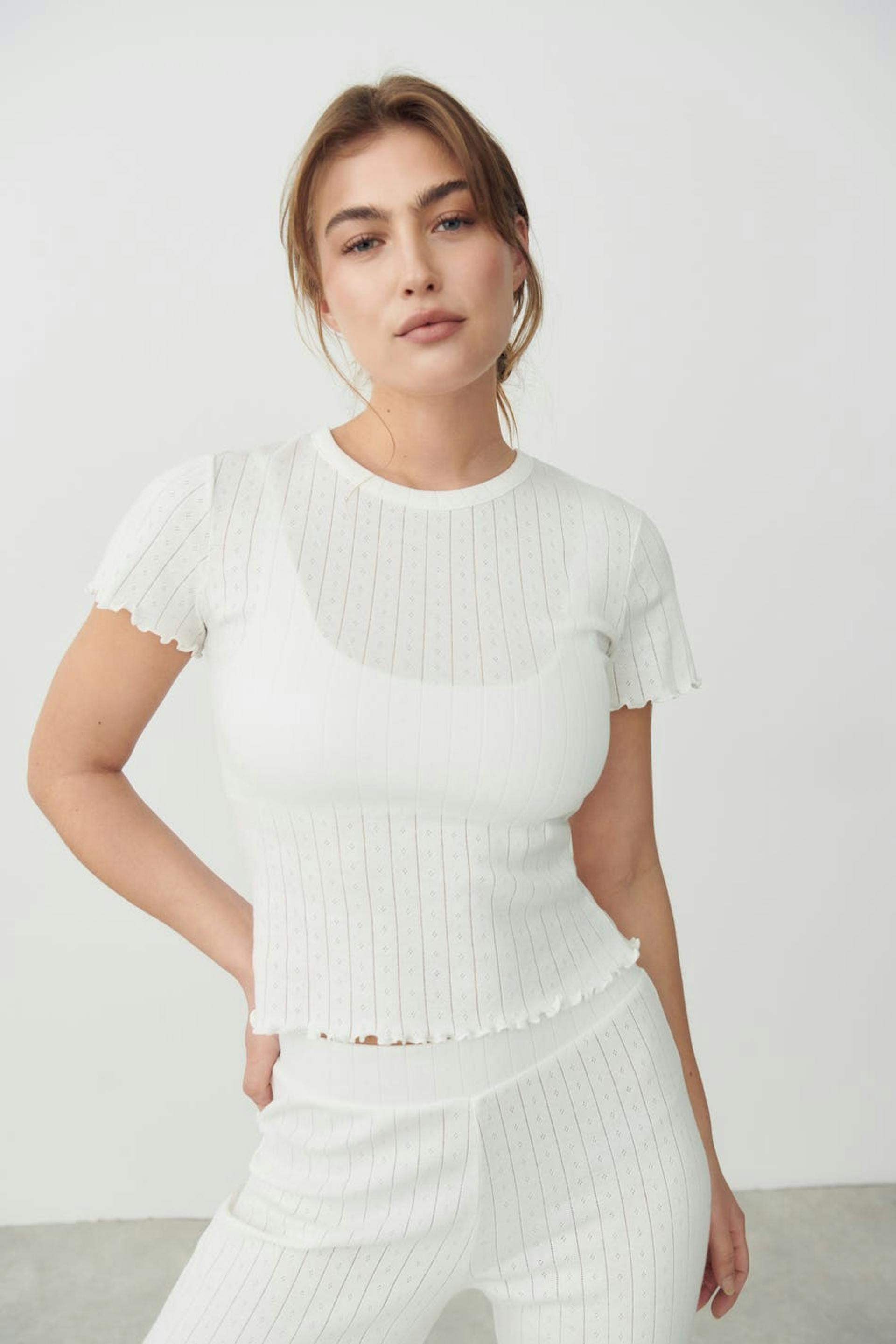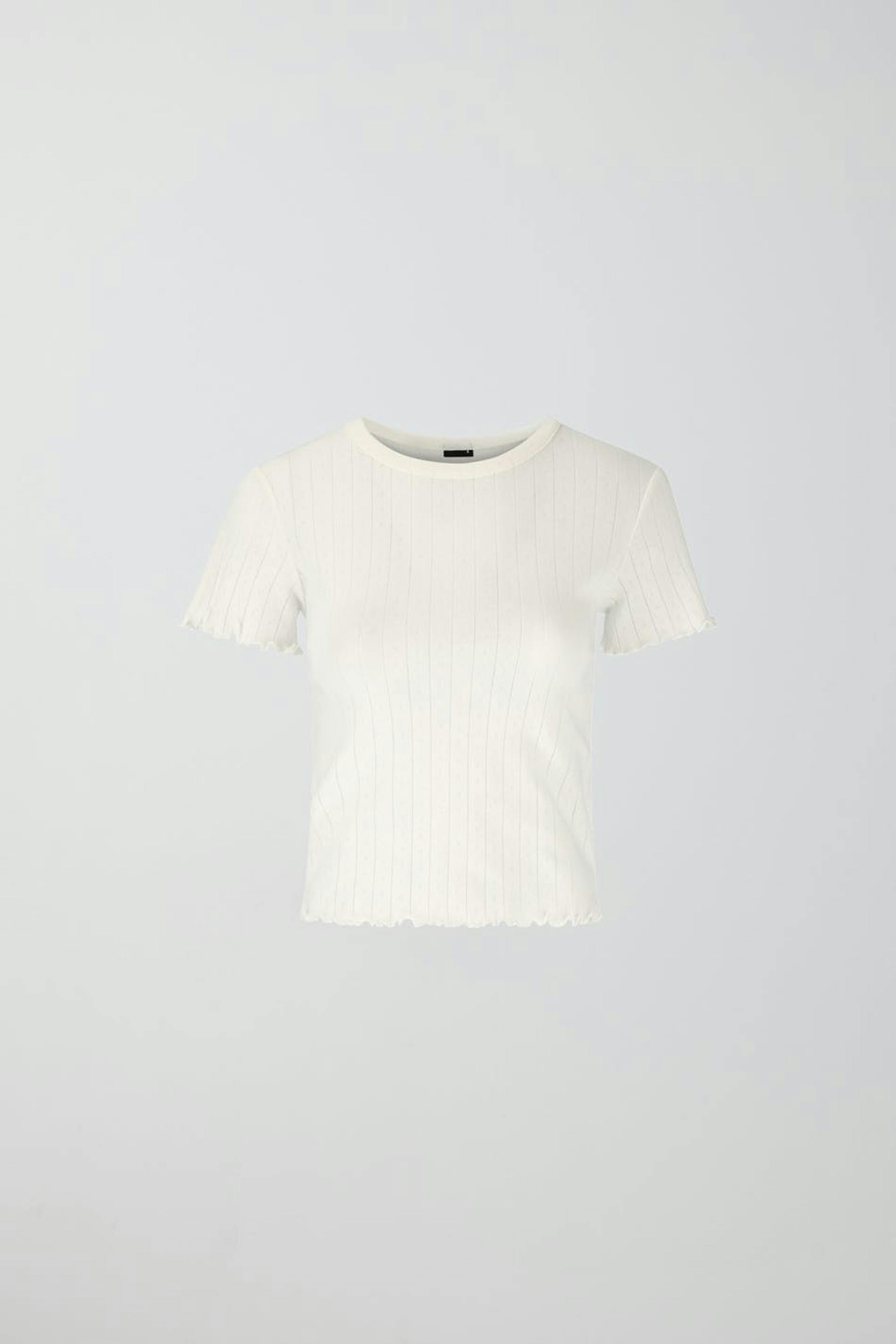 Short-sleeved top in soft cotton with rounded neckline. The top is white and has overlocked edges.