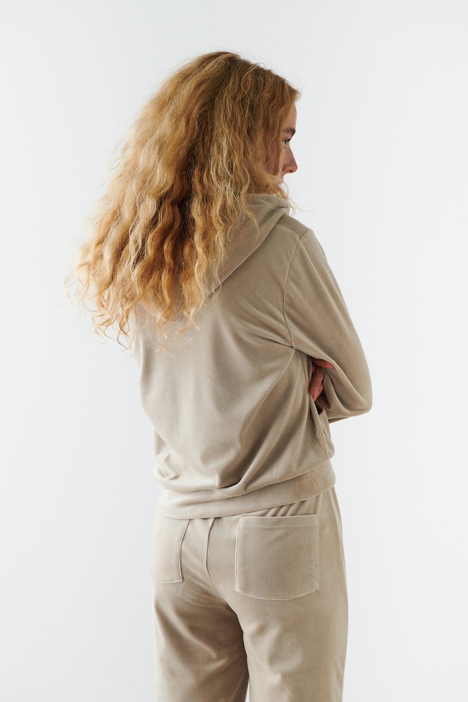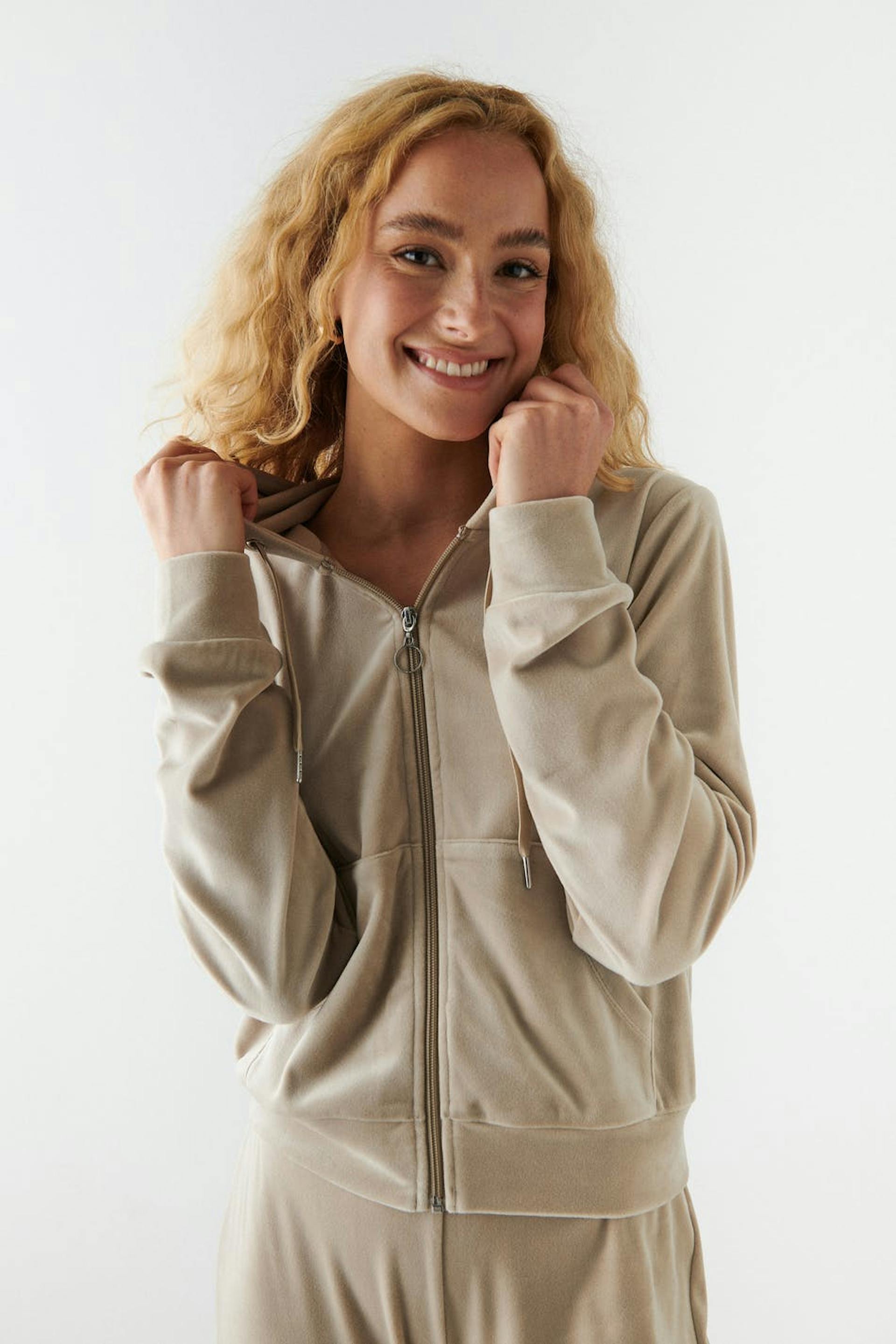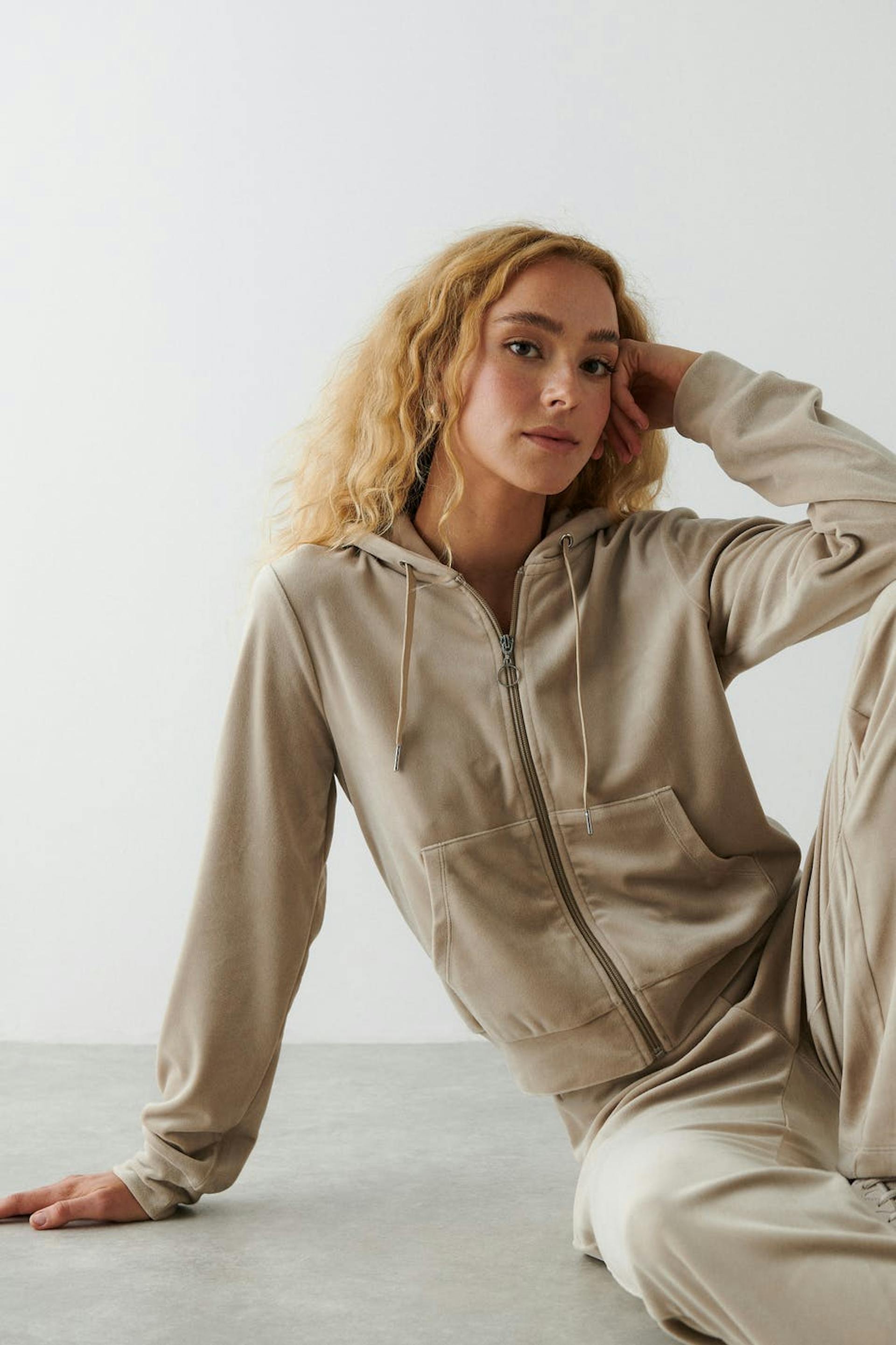 Soft hoodie in velour with a regular fit. The hoodie is beige and has a lined hood. It has pockets on the sides and a zip closure with a metal ring and a drawstring at the hood.